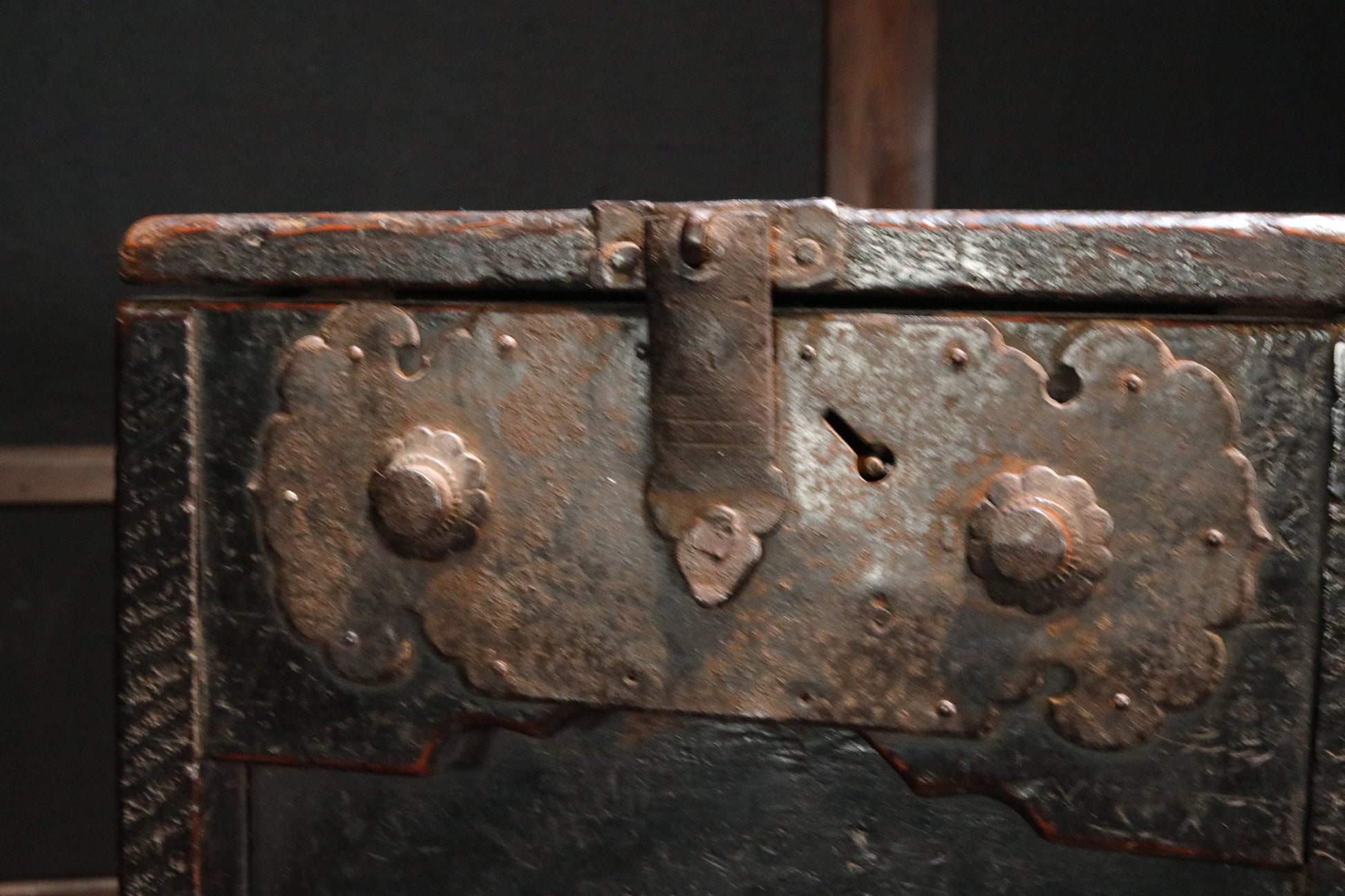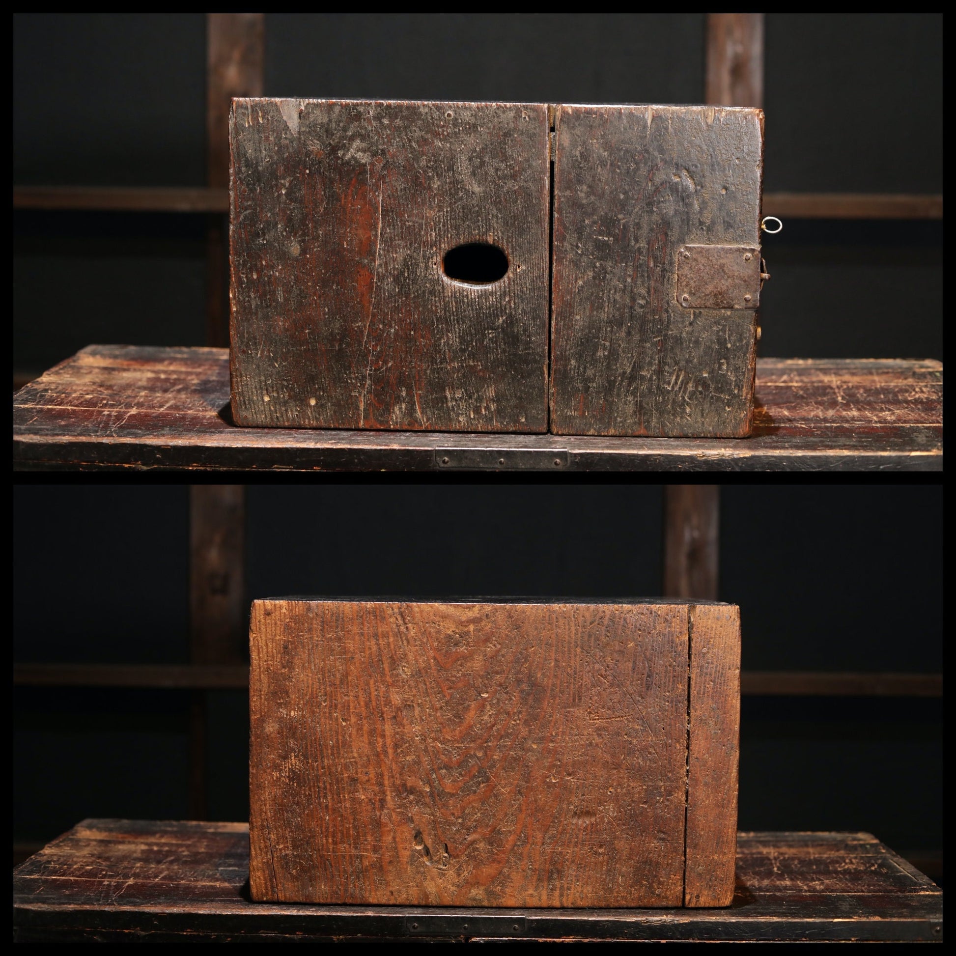 Japanese furniture Antique Box with Key, Zenibako charity box Buddhist temple coin collector 1700s metal clasp cedar Storage H11.8in×W18.1in.