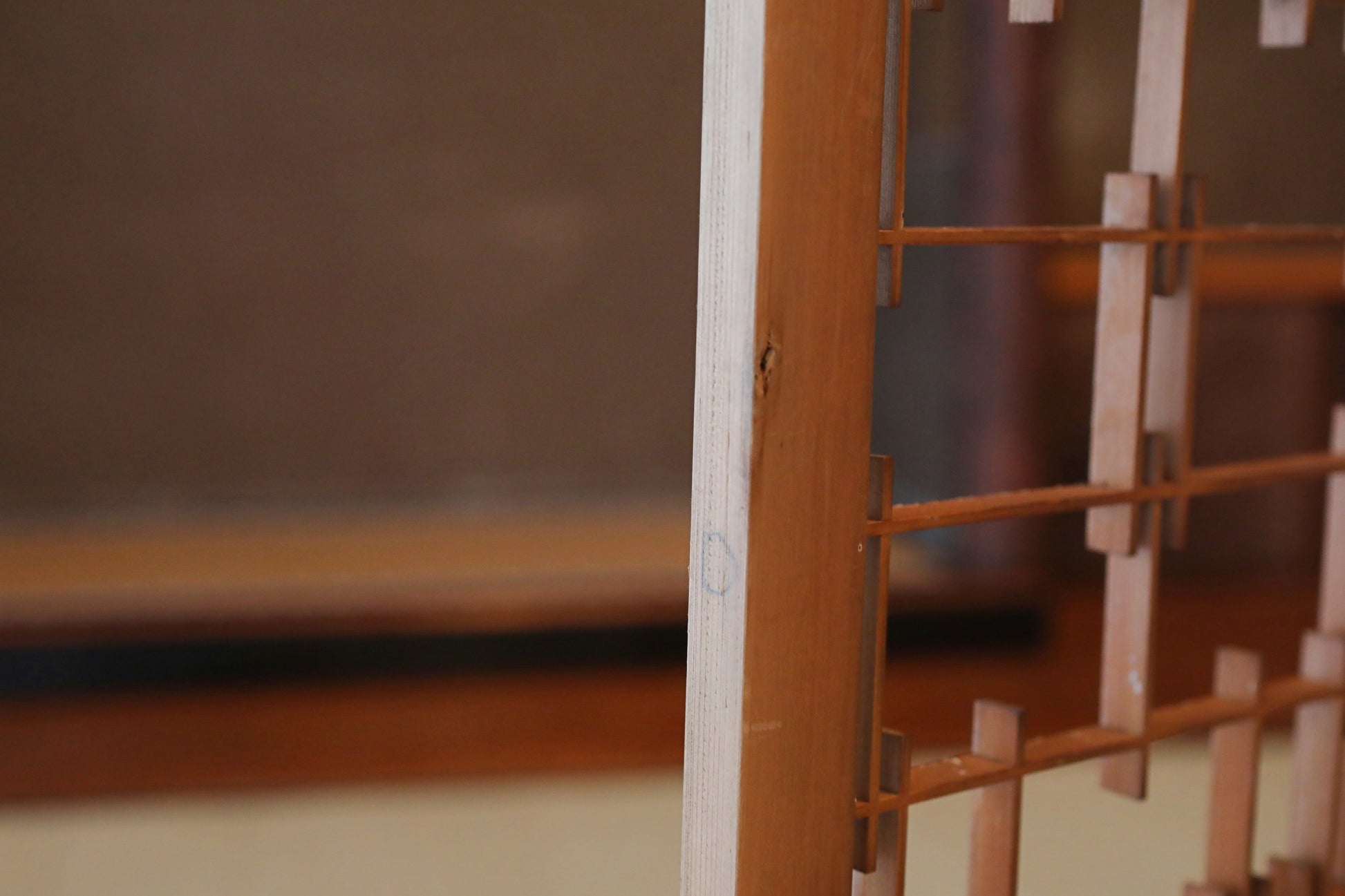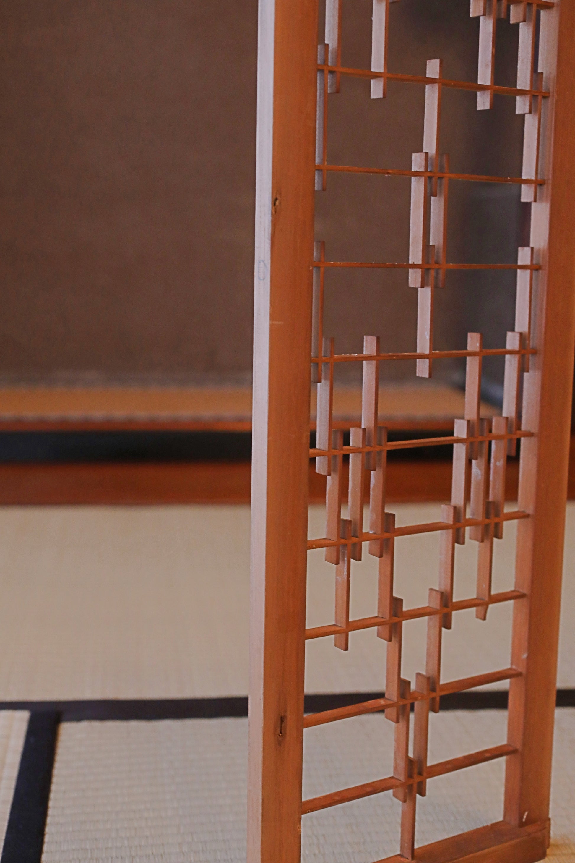 This is a framework of "kumiko shoji", "shoji" is Japanese interior sliding panel or window covered with paper or glass and "kumiko" is a traditional Japanese woodworking technique used to create intricate wooden latticework. This is the state without paper attached.
