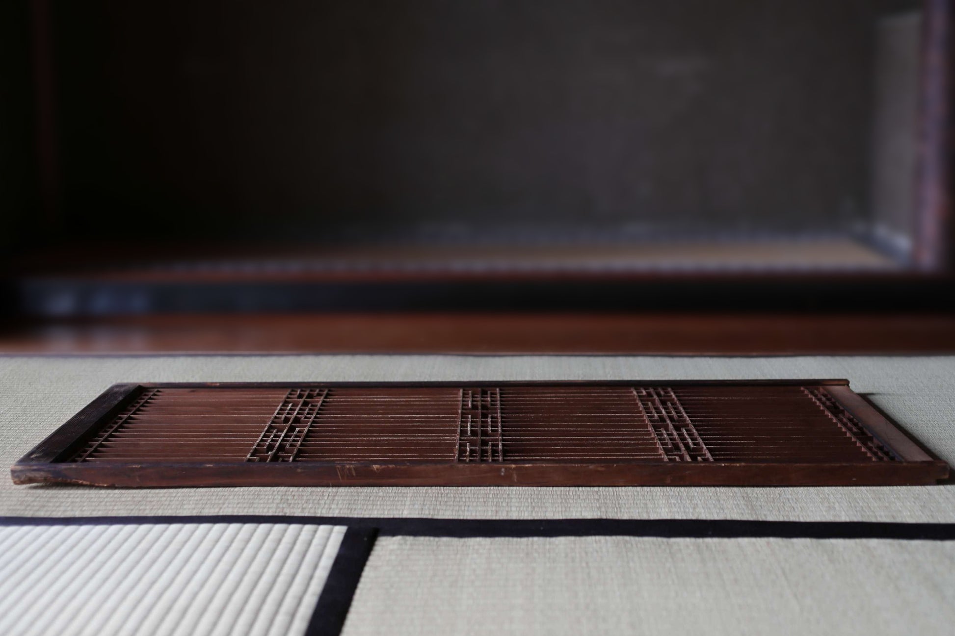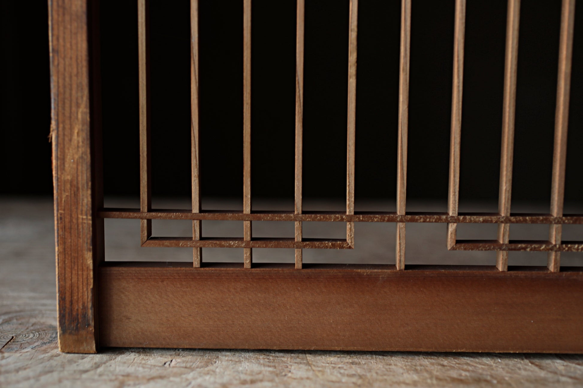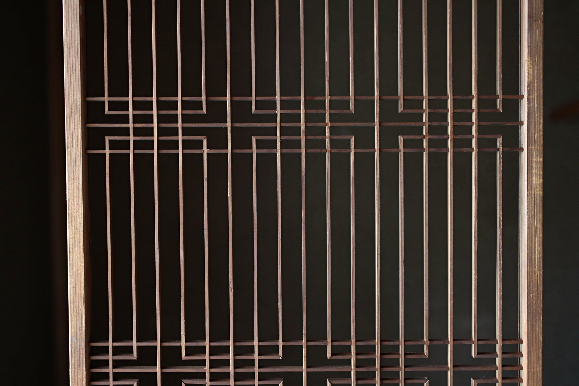 This is the framework for a kumiko shoji. “Shoji” refers to the paper- or glass-covered panels used in Japanese-style sliding doors and windows, while “kumiko” is a traditional Japanese woodworking technique creating intricate wooden lattice patterns. This was used for a slightly smaller sliding door fitted with glass. Its design consists of two parts, each formed by precisely assembling small wooden pieces without adhesive, nails, or screws to create geometric patterns. Its stability and strength derive entirely from the precision of the cuts and the friction at the joints, achieved through the craftsman's meticulous technique.