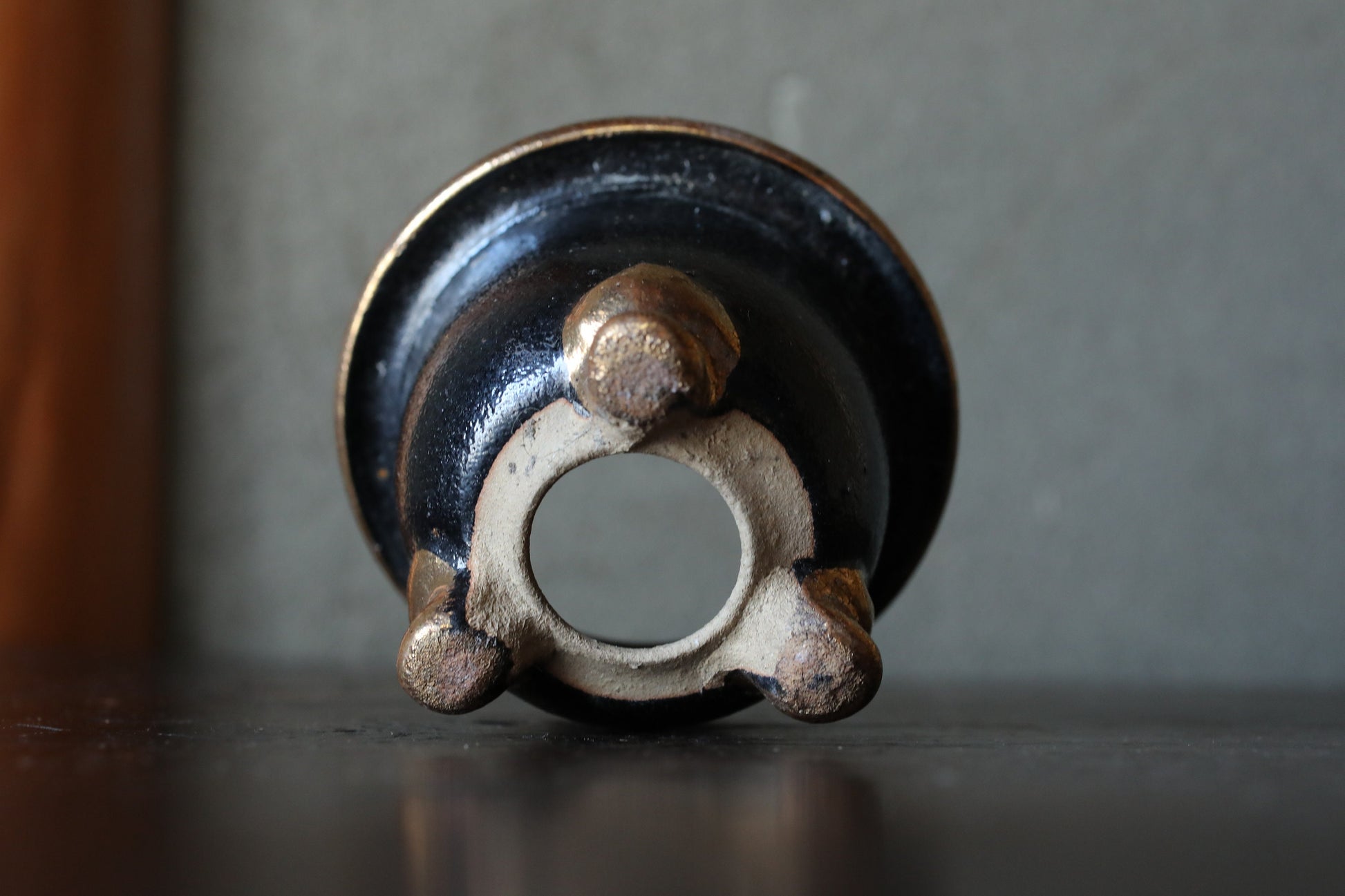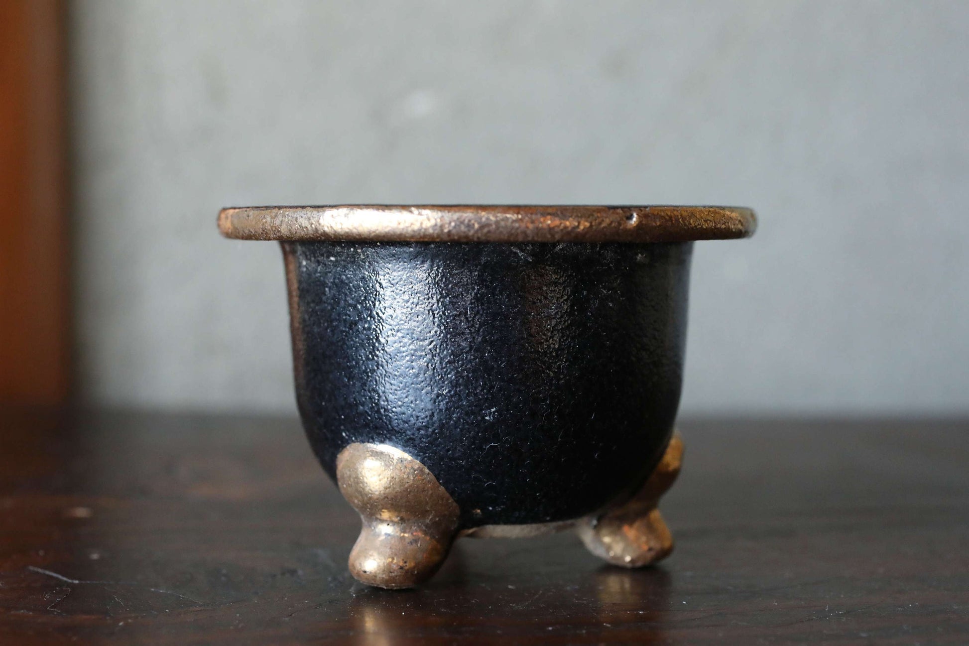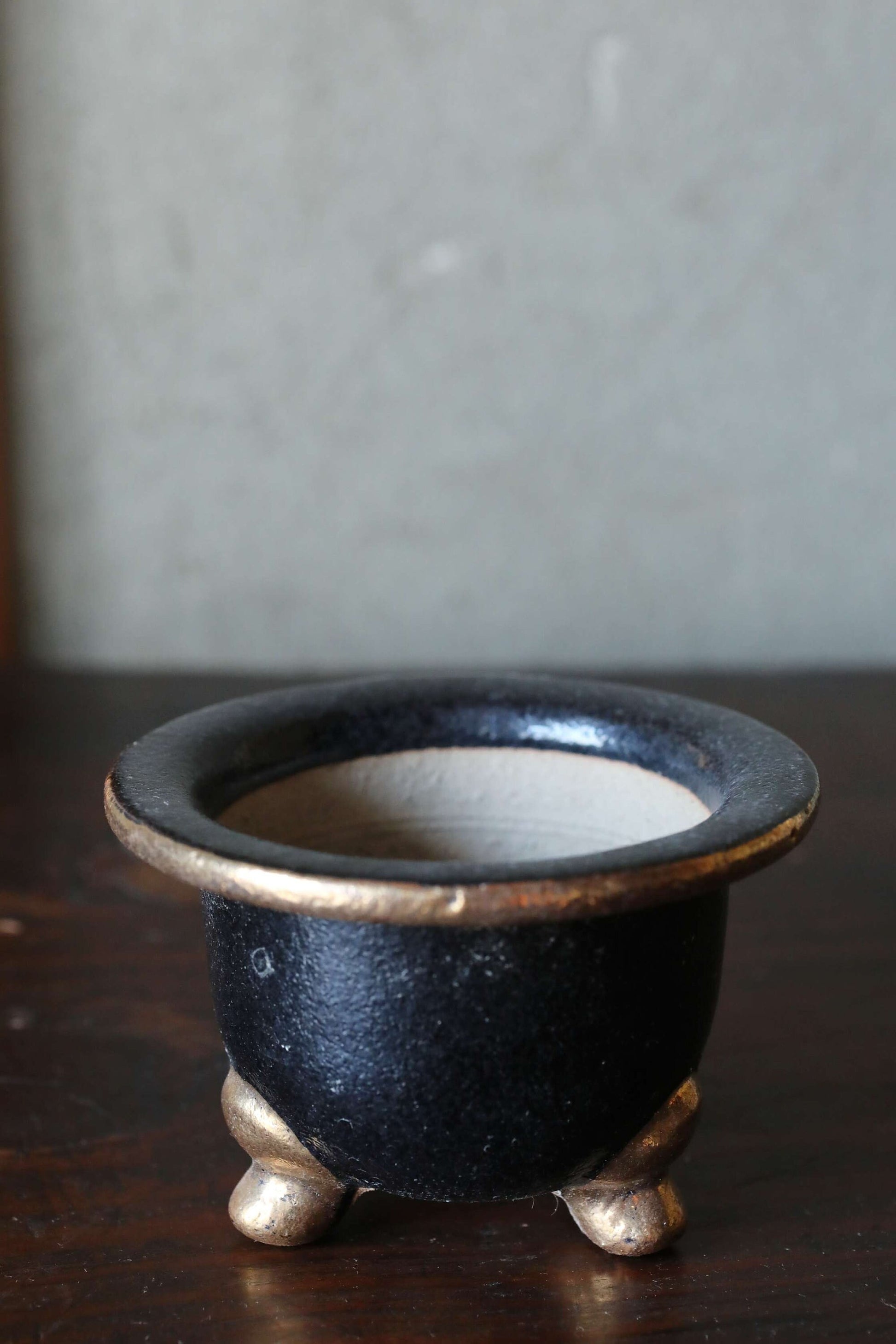 Japanese furniture antique orchid pot with three legs black gold, "Rakuyaki hachi", pottery pot with gold painting, H2.7×4.1in/H6.8×10.3cm.