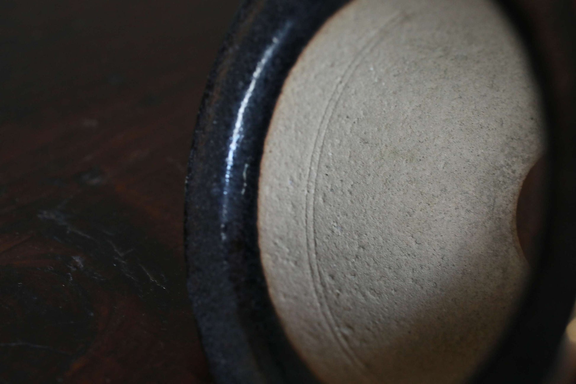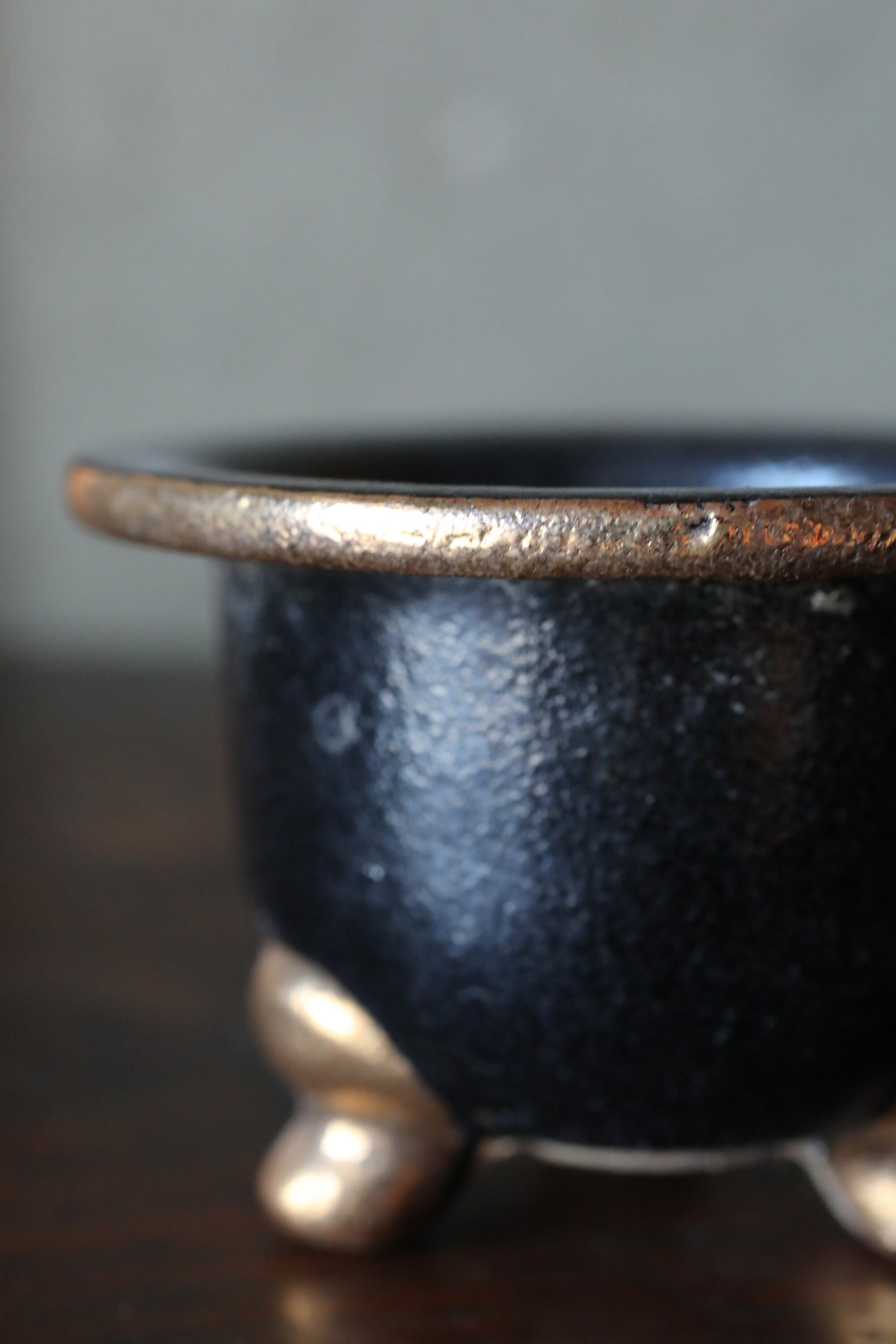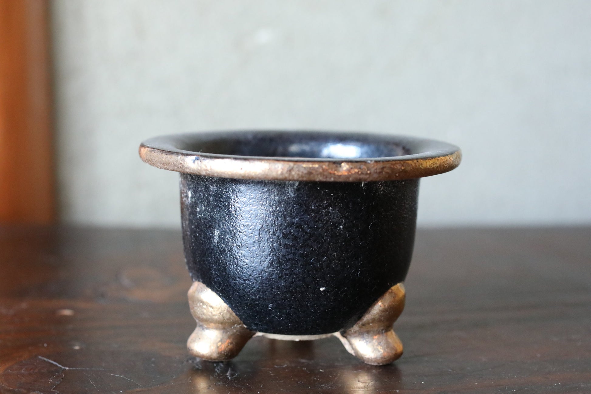 Japanese furniture antique orchid pot with three legs black gold, "Rakuyaki hachi", pottery pot with gold painting, H2.7×4.1in/H6.8×10.3cm