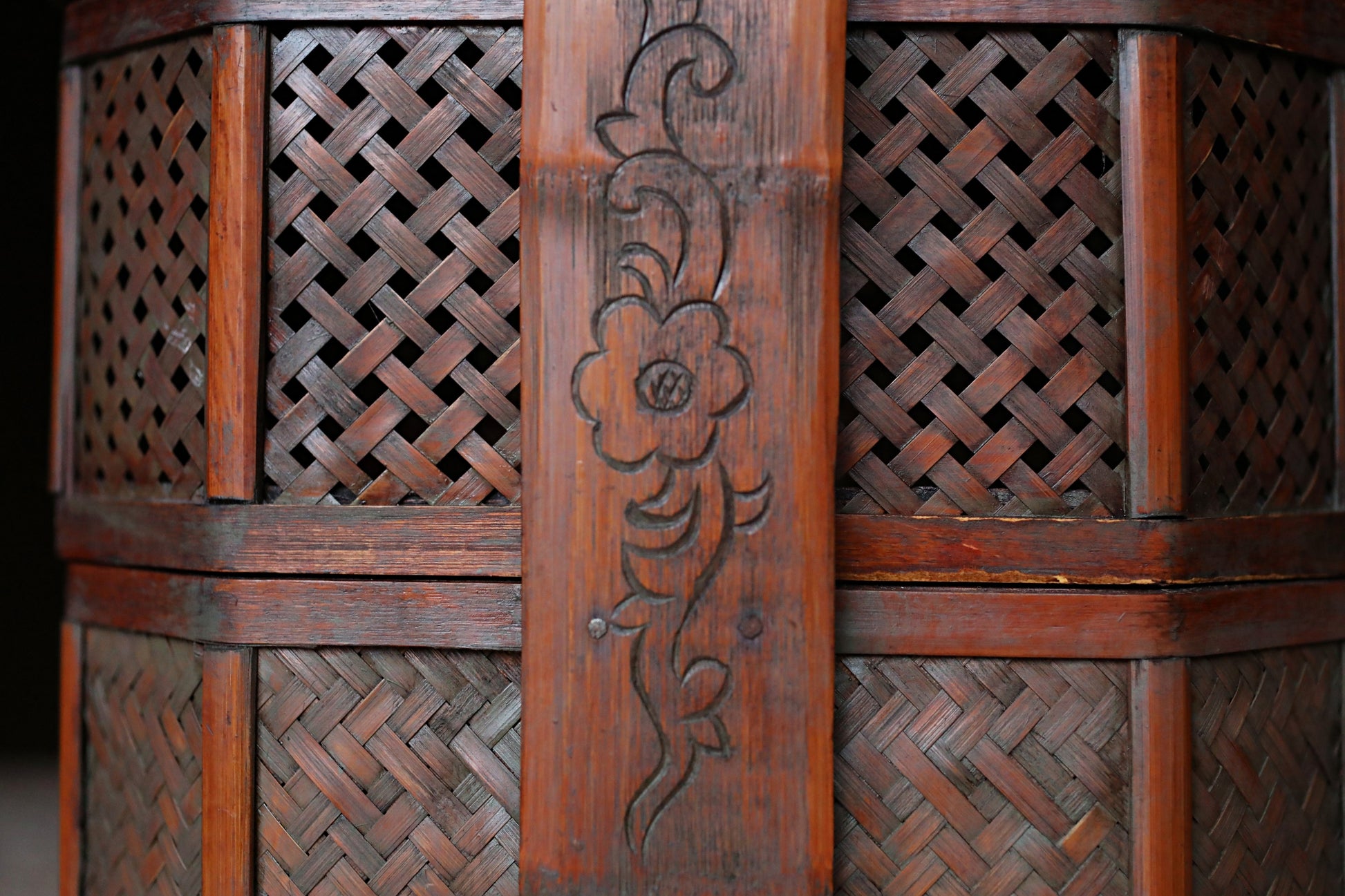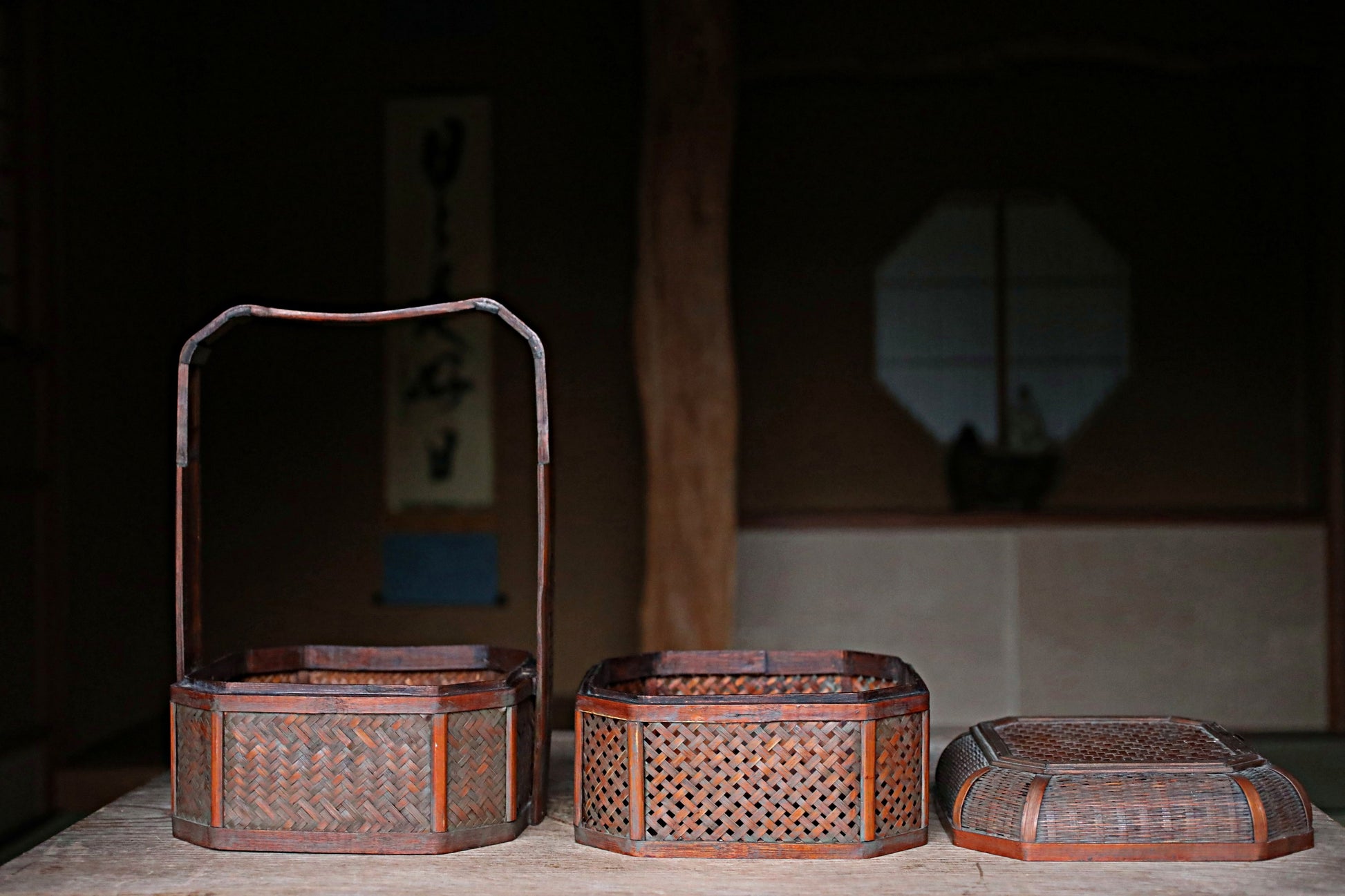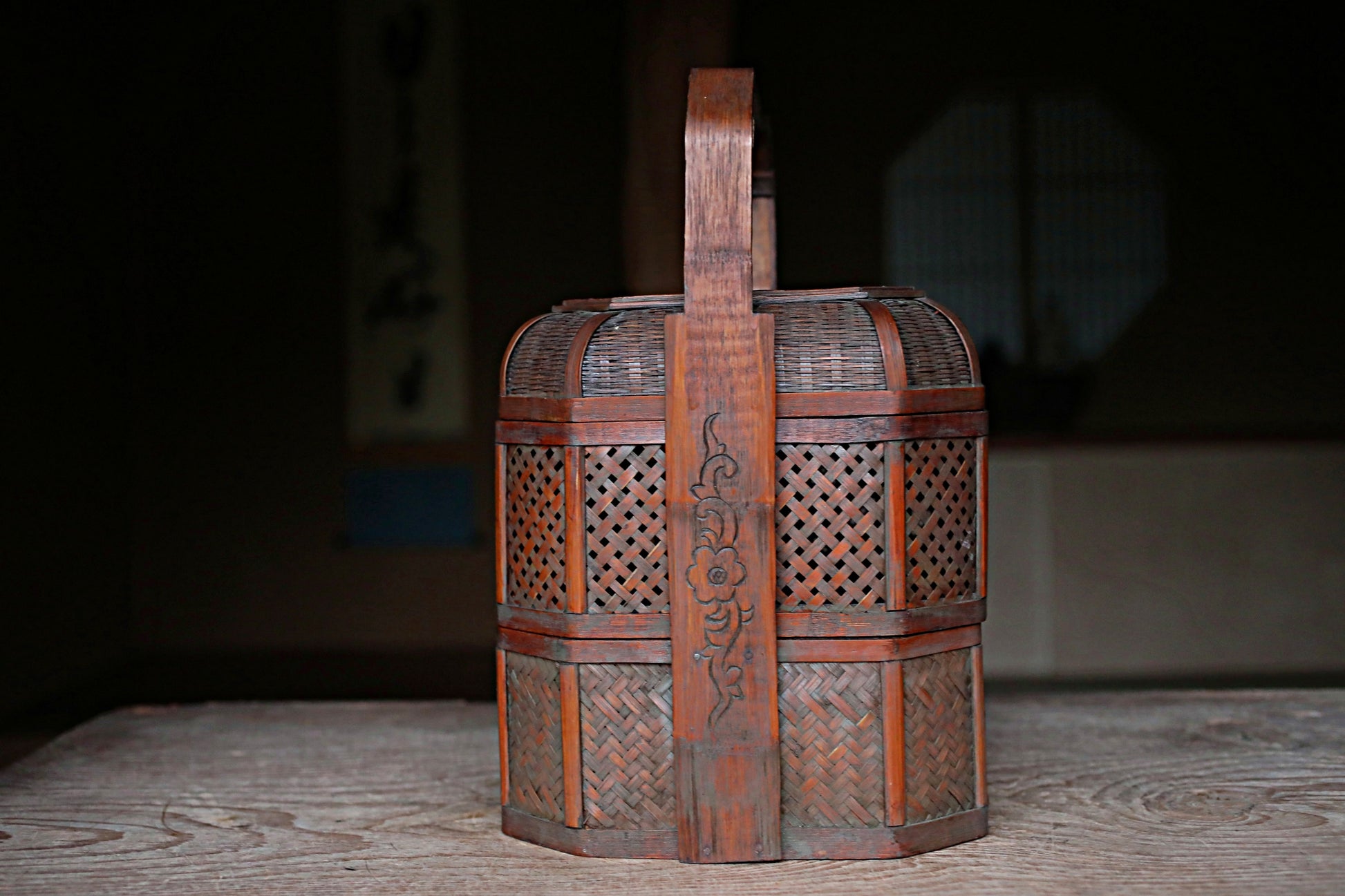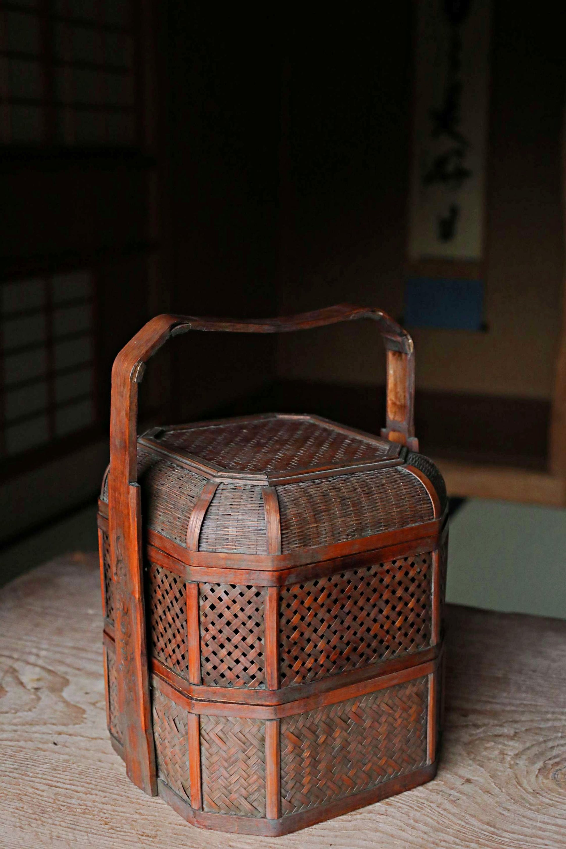 It is divided into two sections and is entirely handmade using bamboo, wood, and lacquer. The exterior is beautifully woven from high-quality bamboo. The color has deepened beautifully with age.