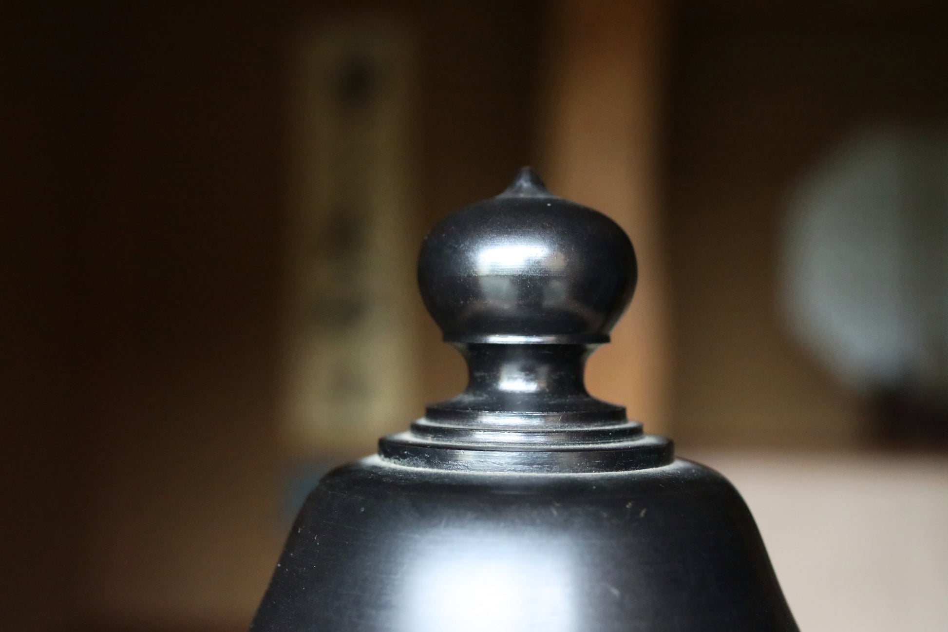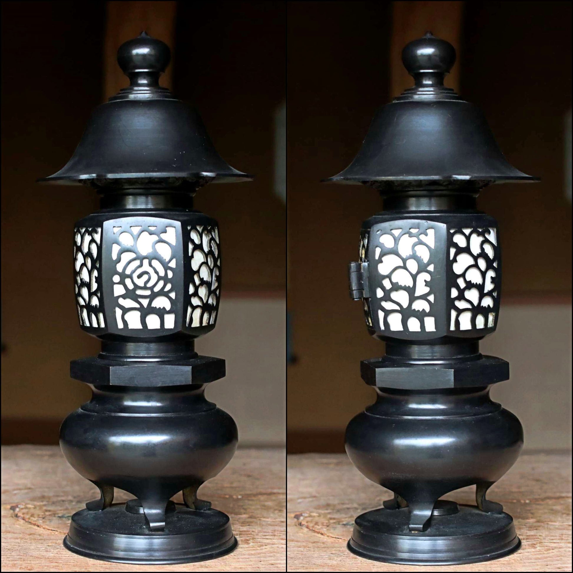 A bronze lantern used in temples and Buddhist altars. It consists of three parts: the base, the window, and the roof. The proportions of each part are excellent. The window features openwork carving, and lighting an LED light or candle inside makes it even more beautiful.
