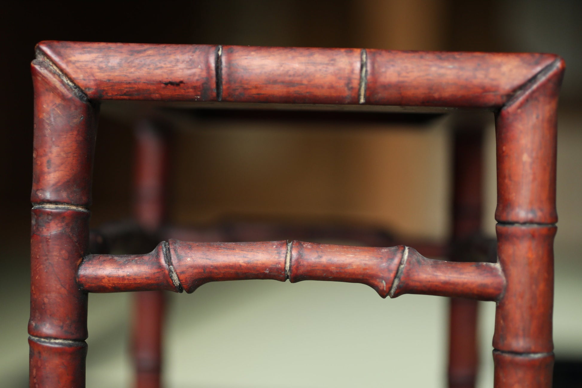 This pedestal features legs and crosspieces intricately carved to mimic the natural nodes and joints of bamboo. The slightly squat bamboo creates a charming contrast with the delicate beauty of miniature bonsai trees.