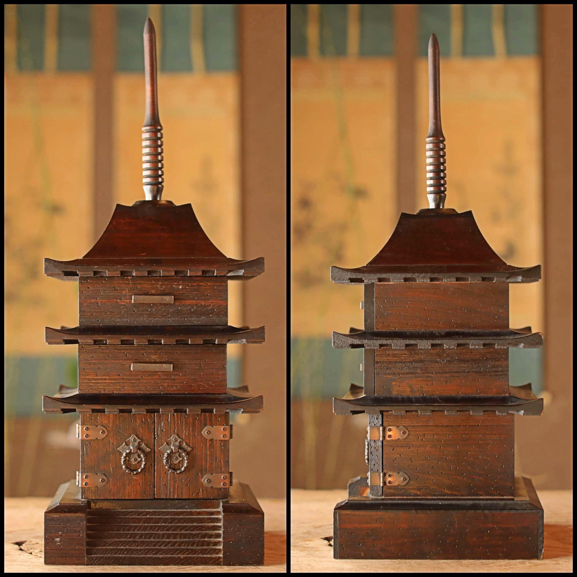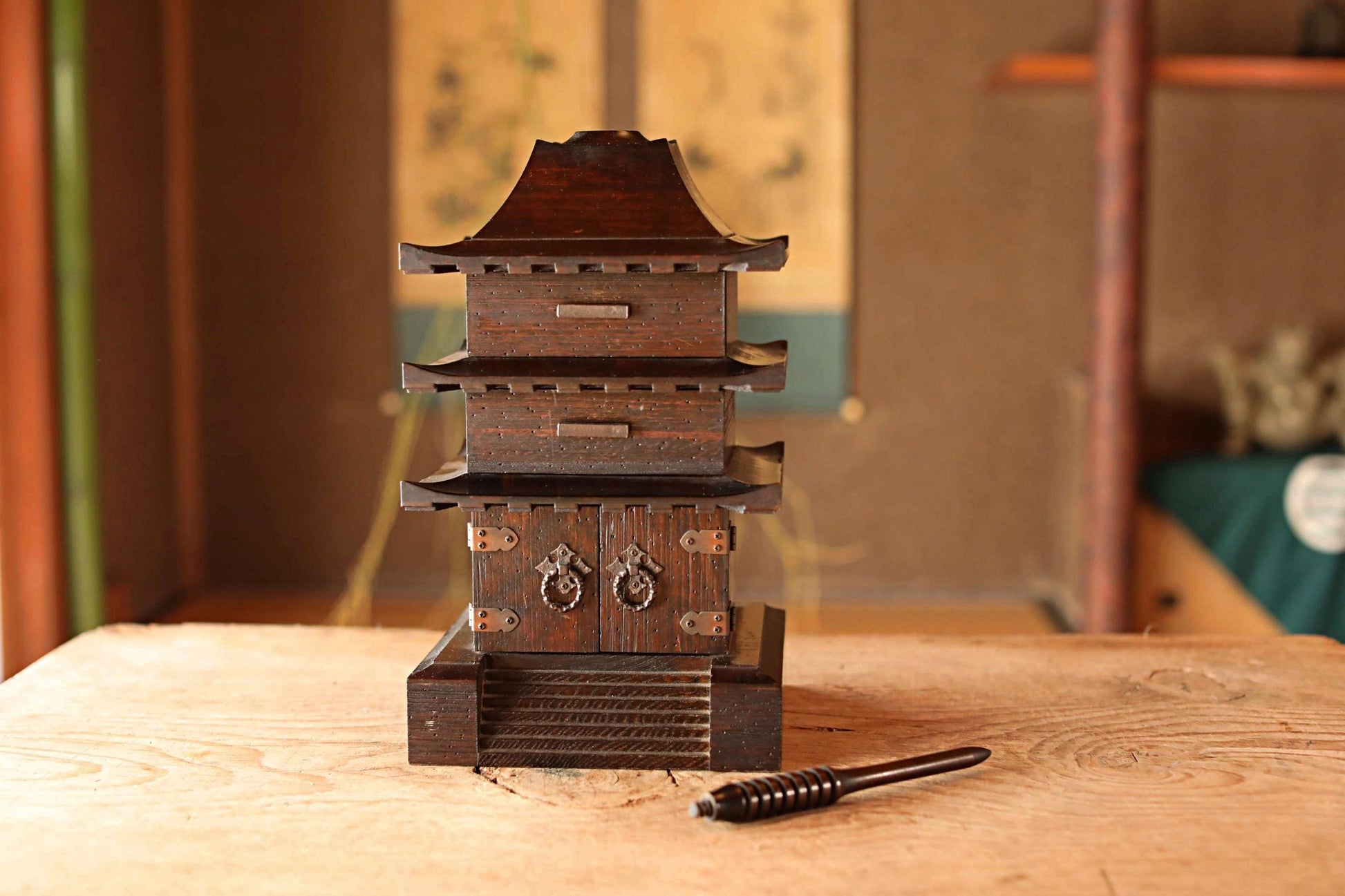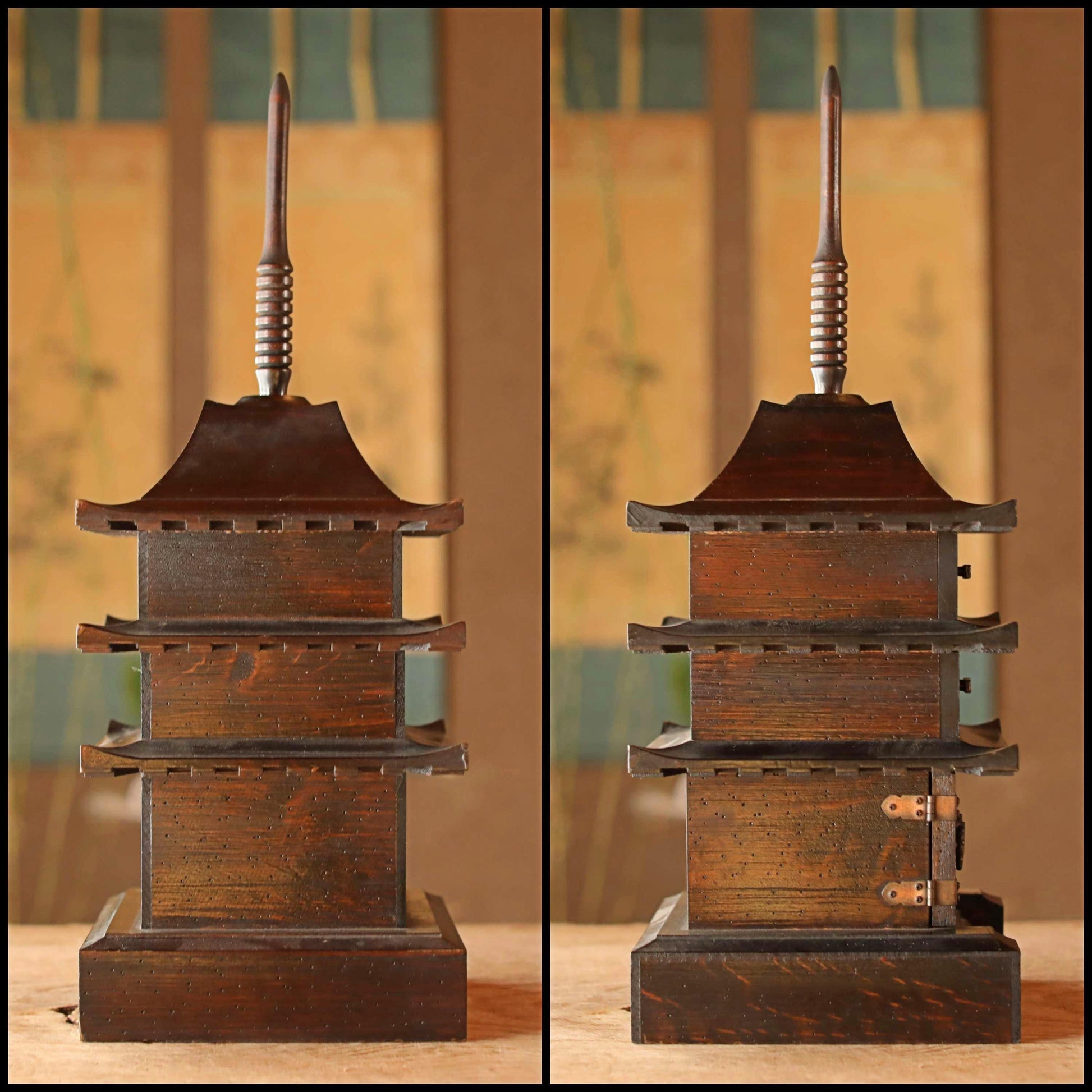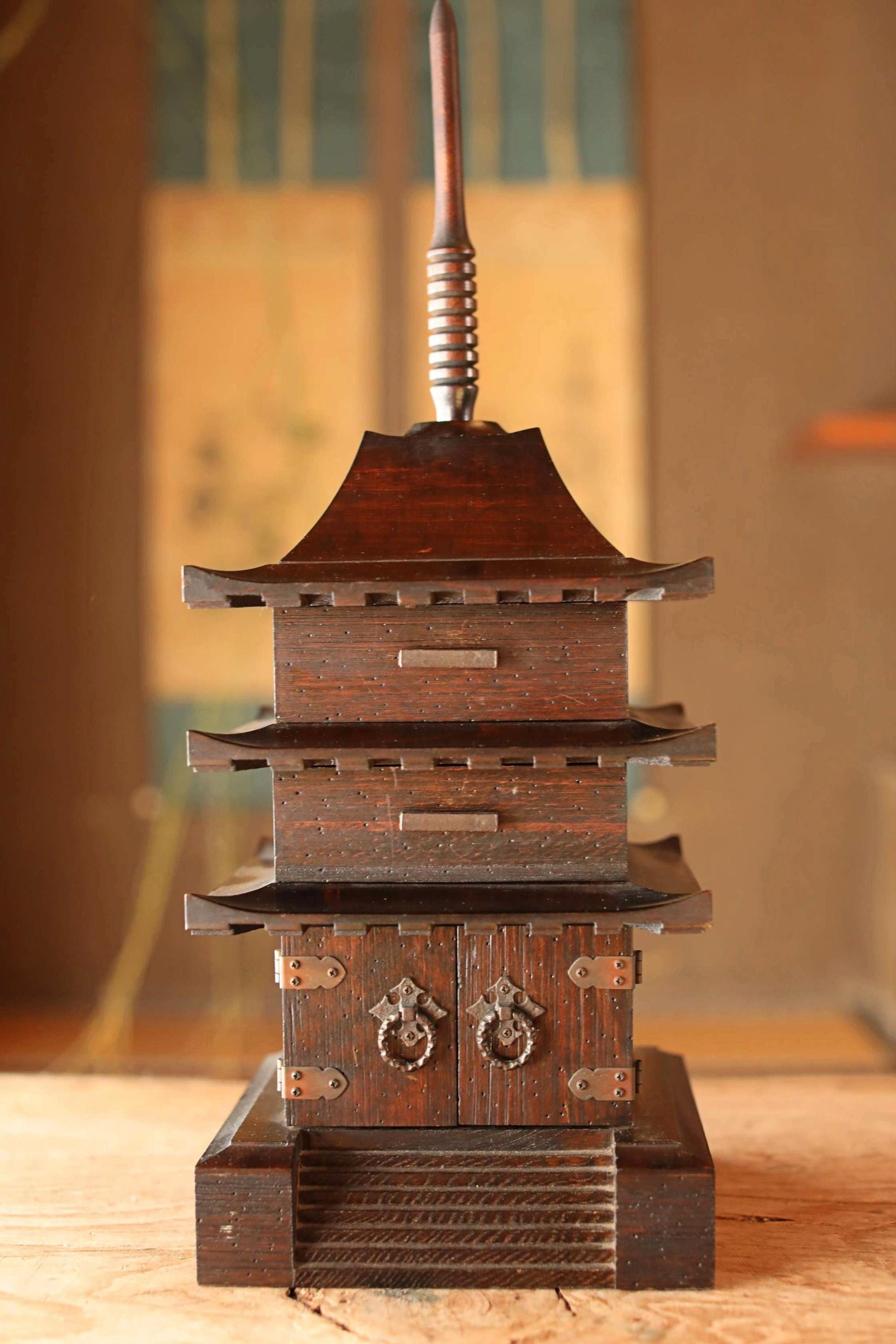 Japanese large size wooden chest of drawers three-storied Pagoda Buddhist architecture, Japanese furniture interior H20.1×7.9in/H51×20cm