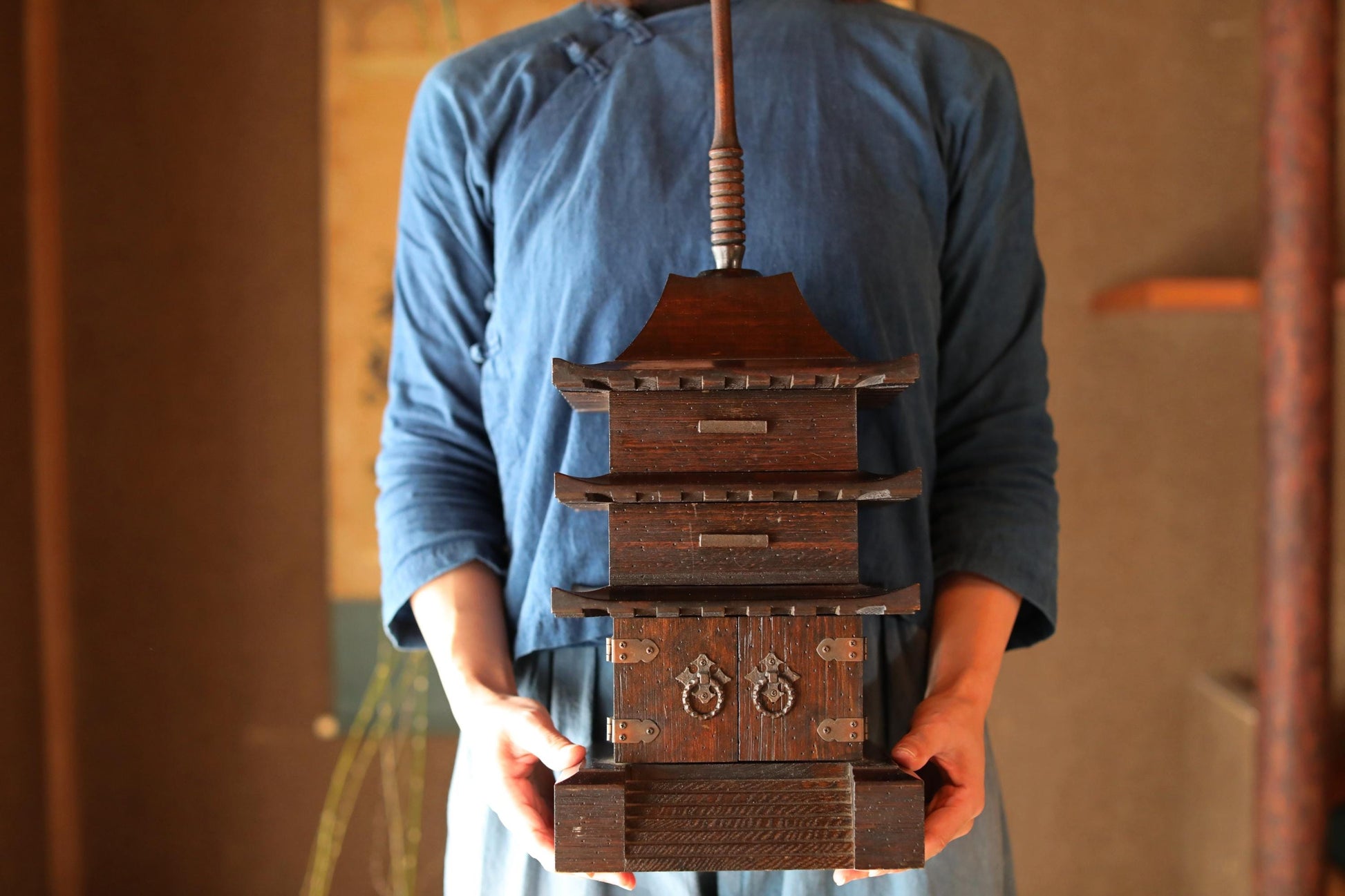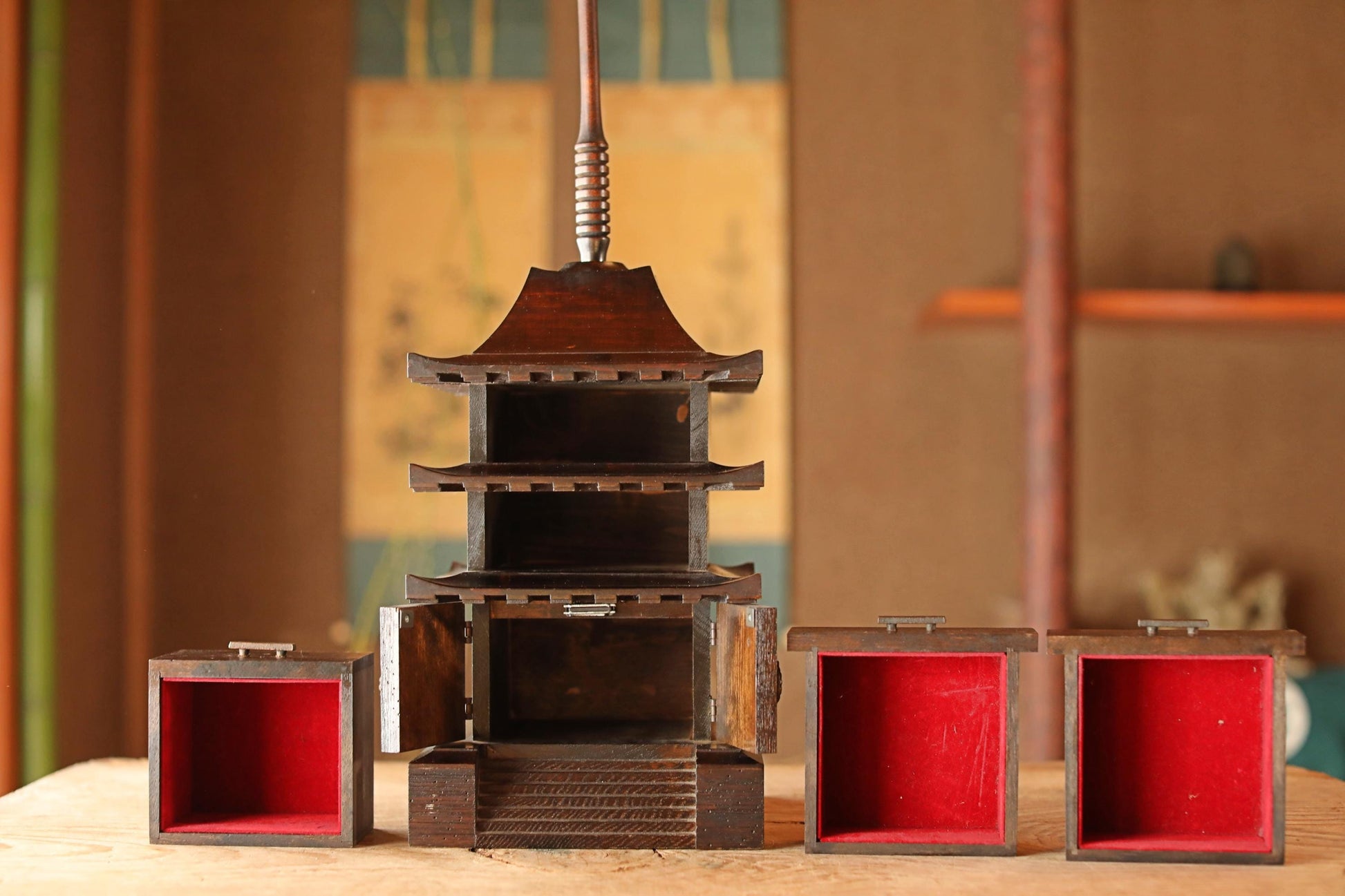 This is a unique item. It is a chest of drawers with storage in the shape of a three-story pagoda, with three drawers.