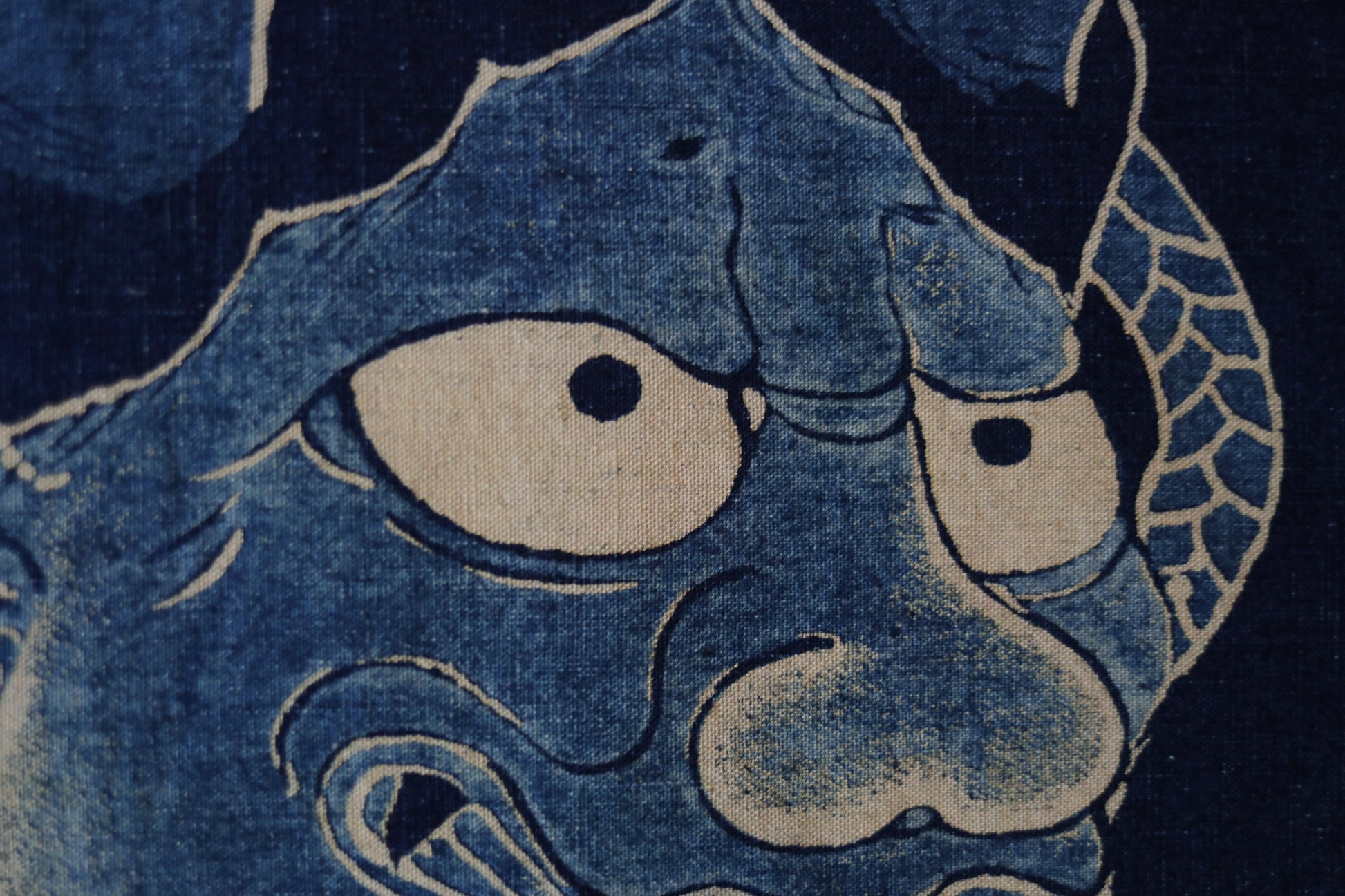 This large cotton dyed cloth is a re-production of an old dyed fabric from the Showa era. It's deadstock, unused, and in excellent condition. The striking Hannya and carp motifs make a striking wall hanging.