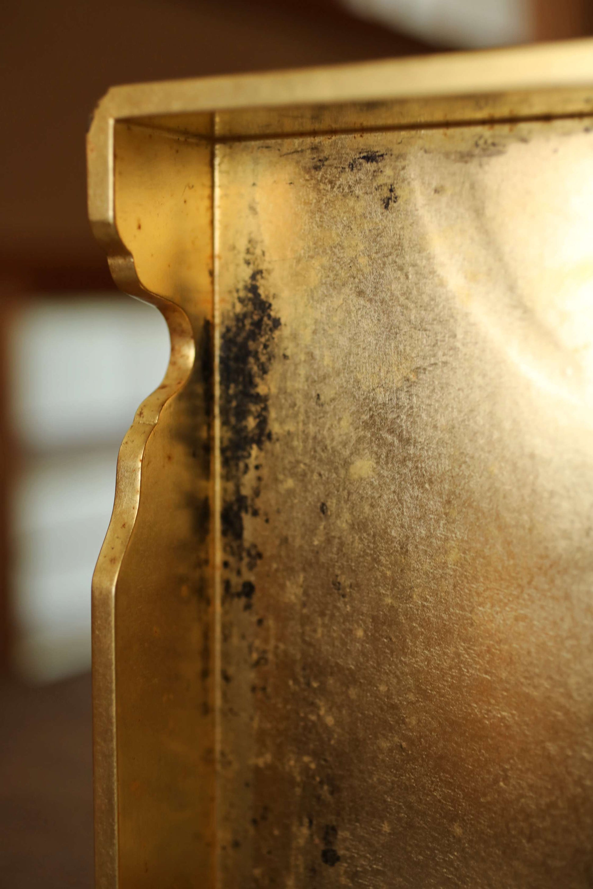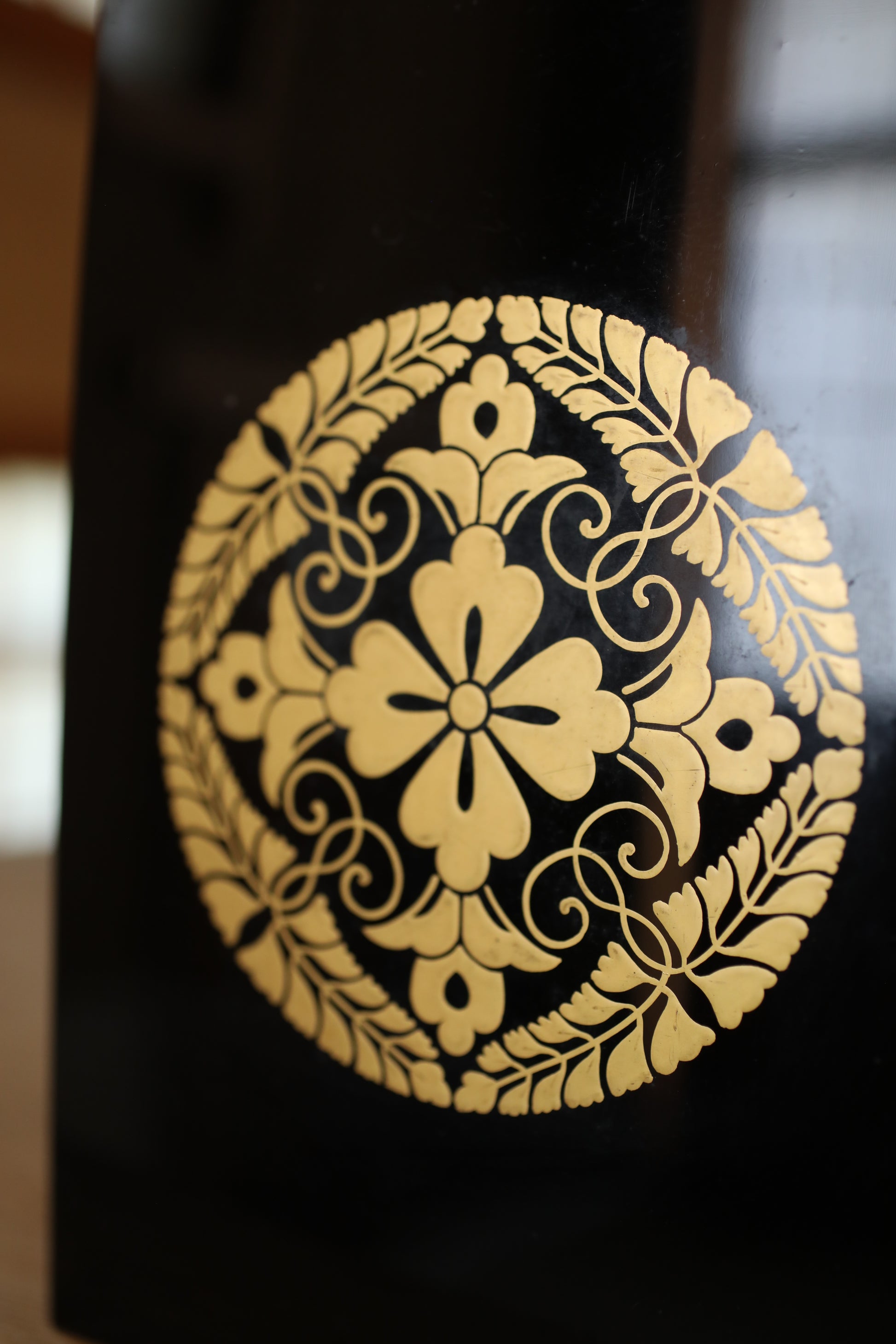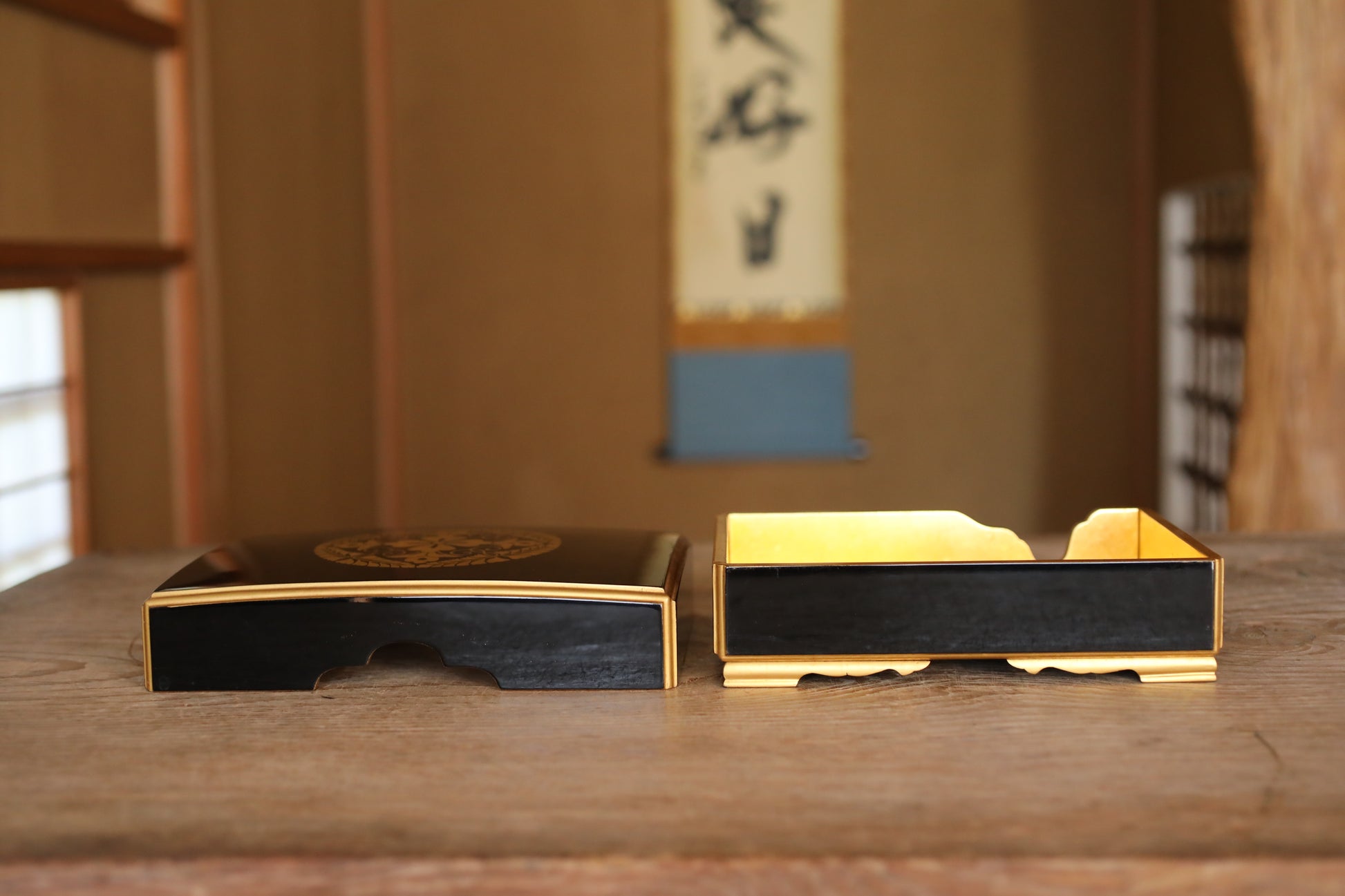 The box is lacquered in black outside and covered with gold leaves inside. The crest on the top is painted with technique of makie, fixing gold powders and leaves with lacquer. It is designed in the likeness of eight wisteria blossoms and called as "Yatsu fuji" which is most commonly used in temples.