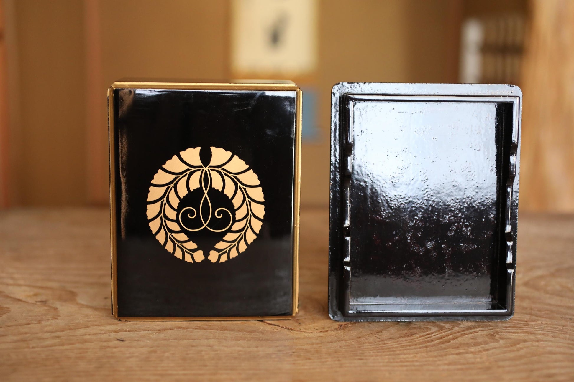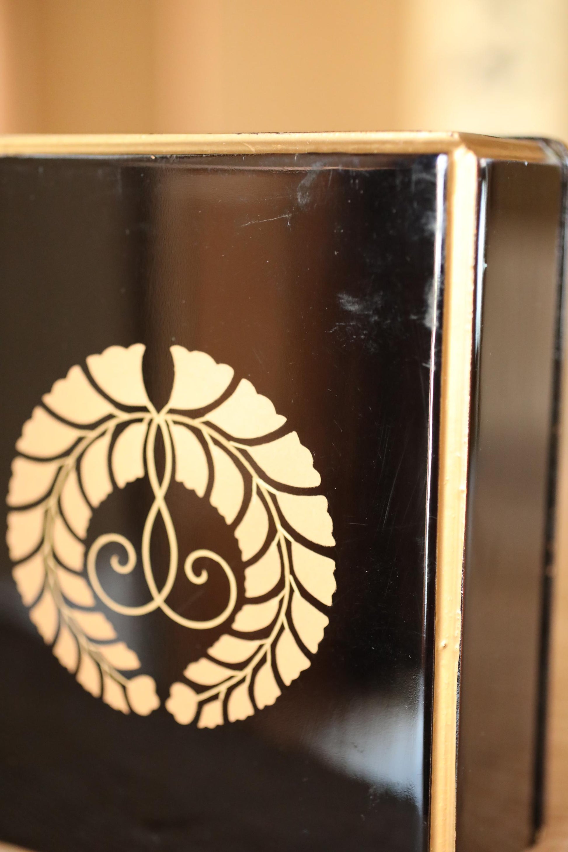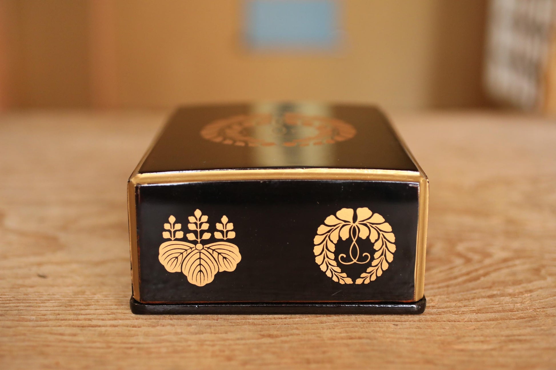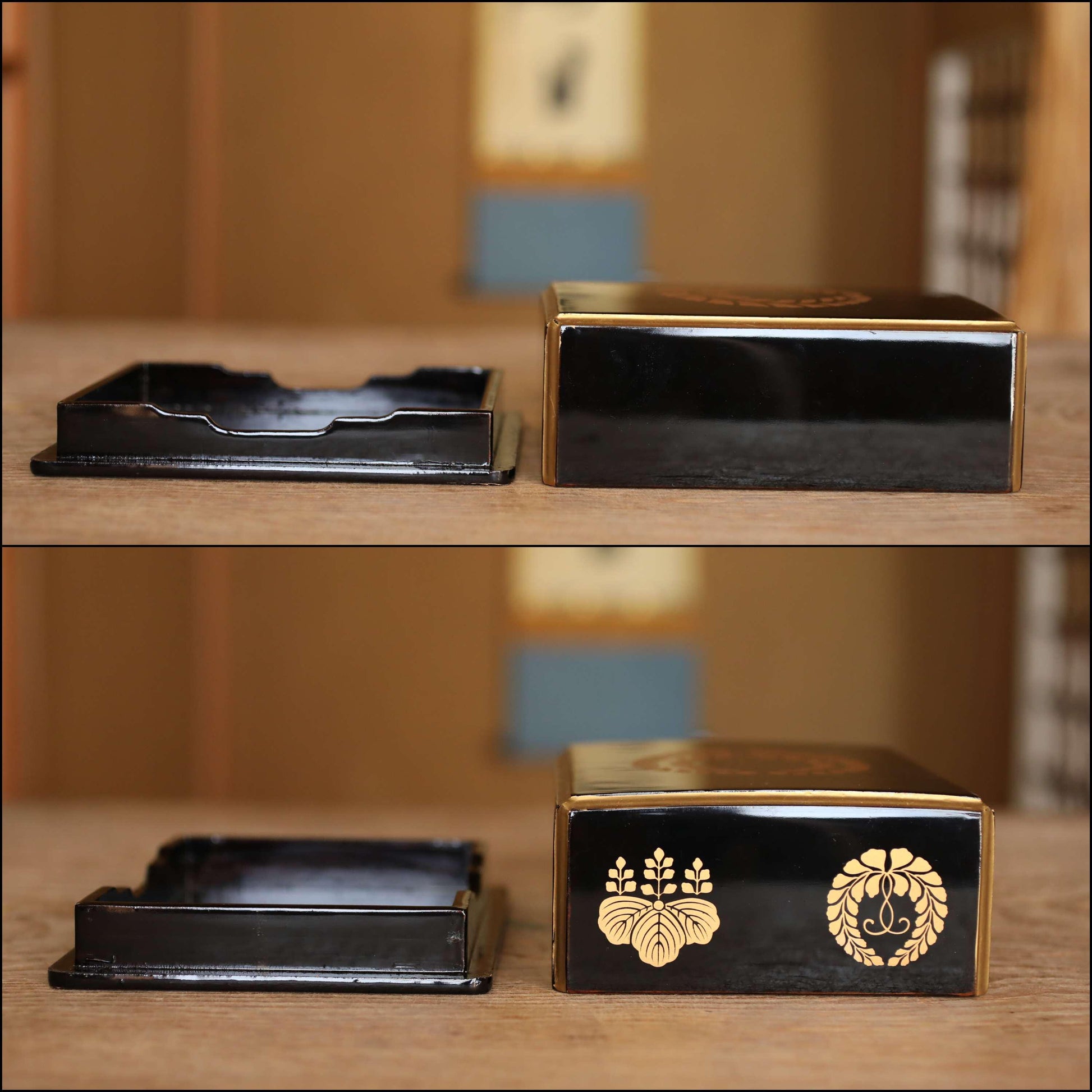 Japanese Makie Black Lacquer Gold wisteria SAMURAI crest wooden box URUSHI Maki-e, lacquer furniture buddhist alter 6.7×5.3in/17×13.5cm