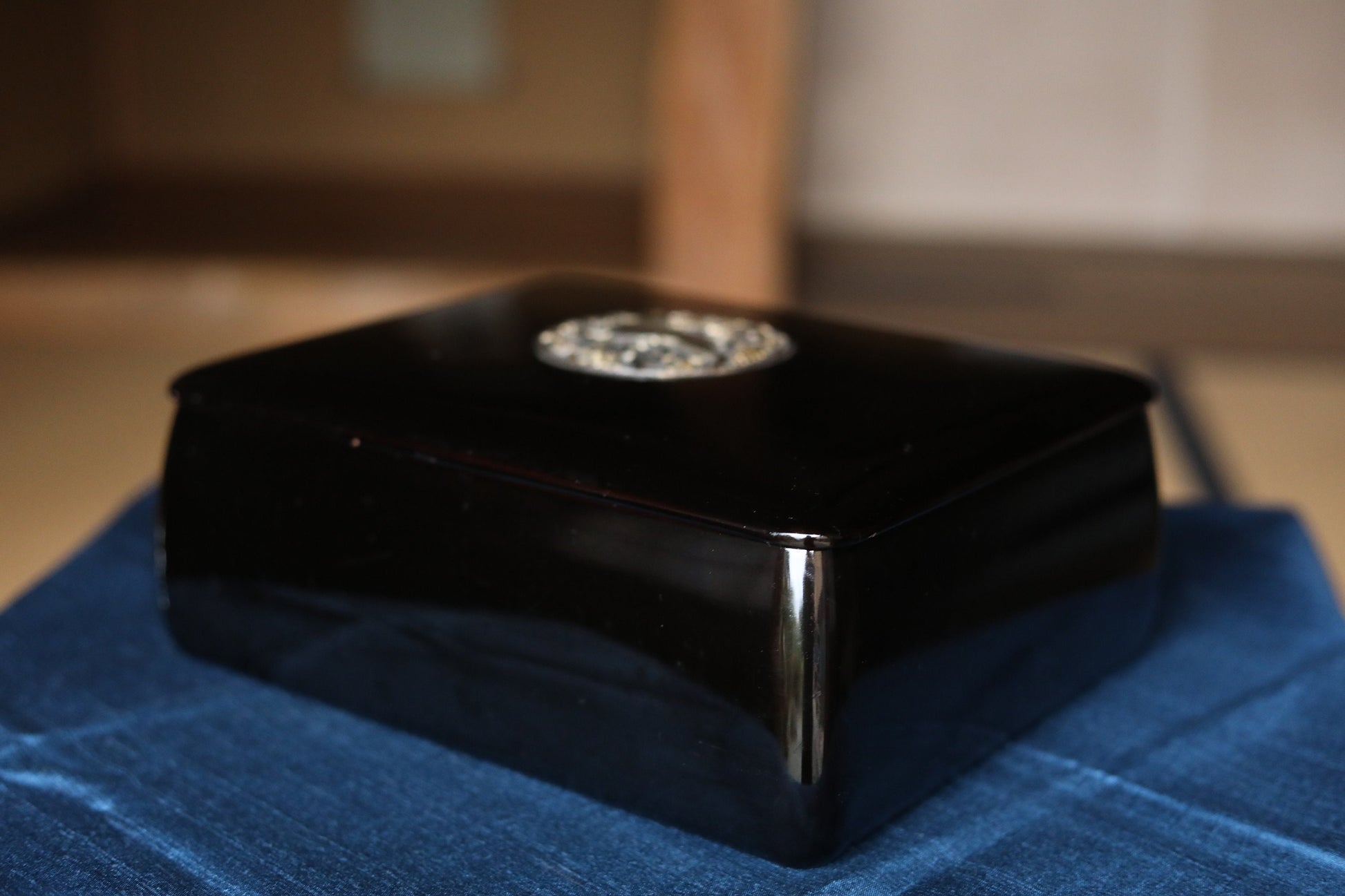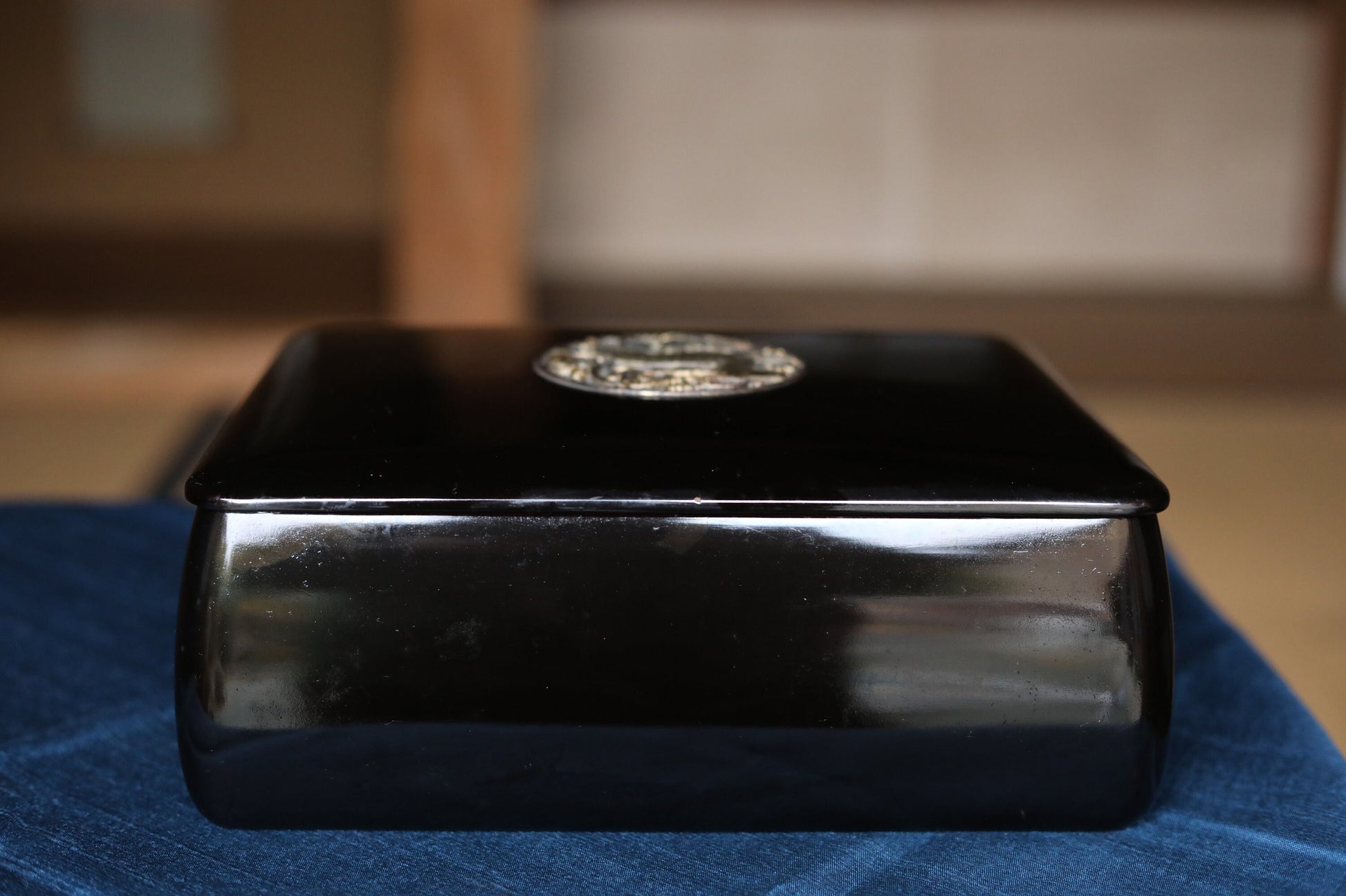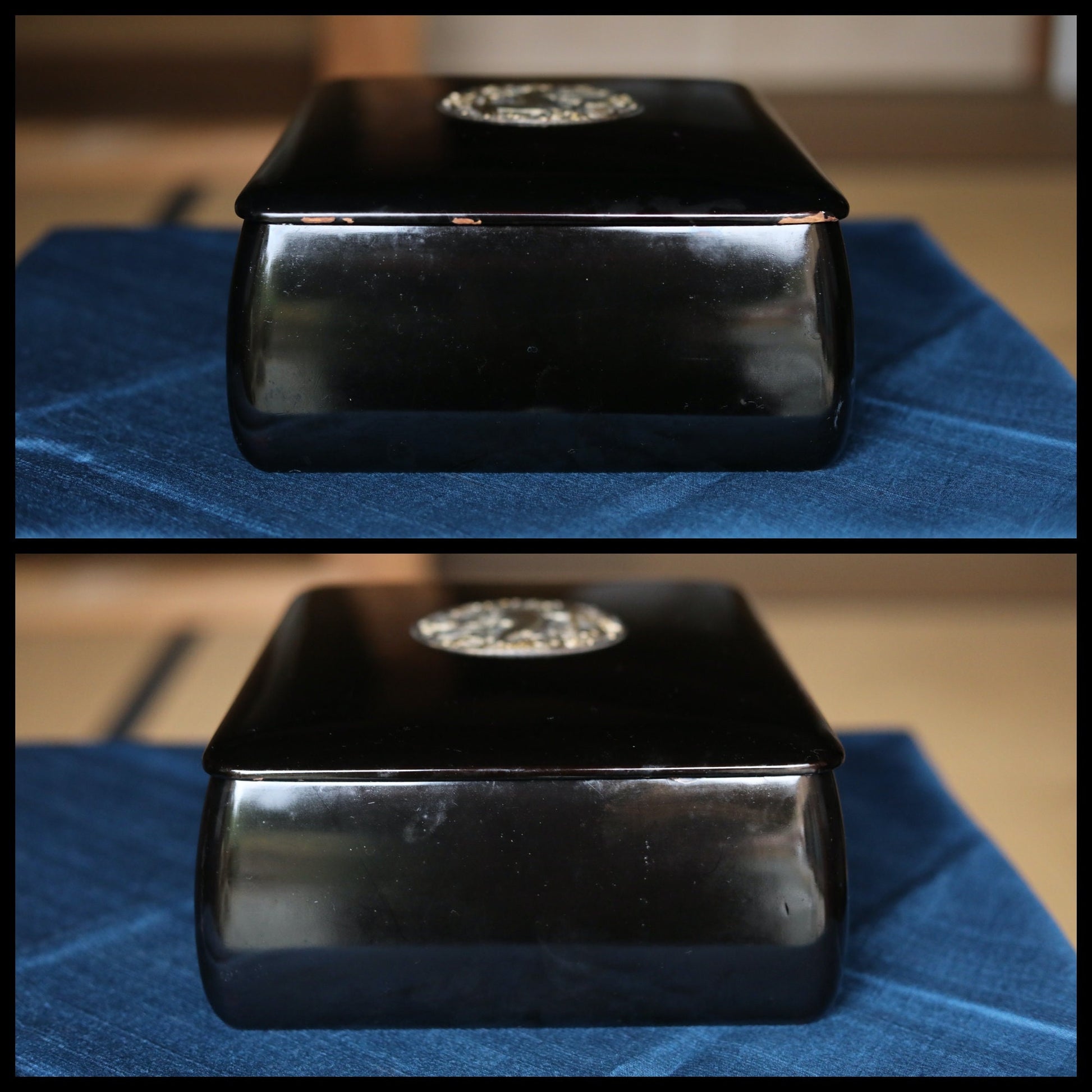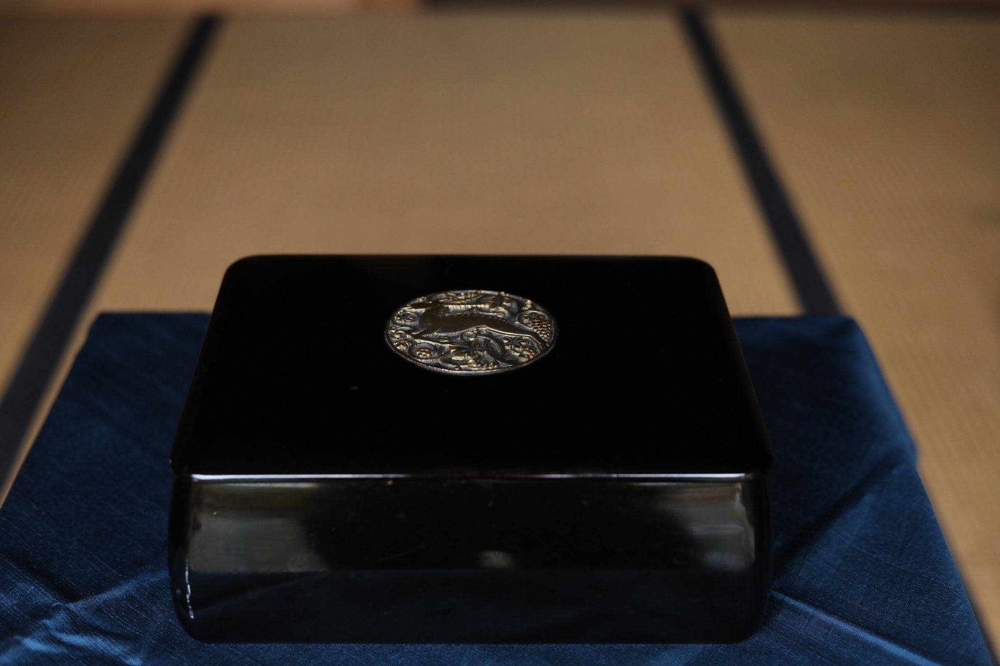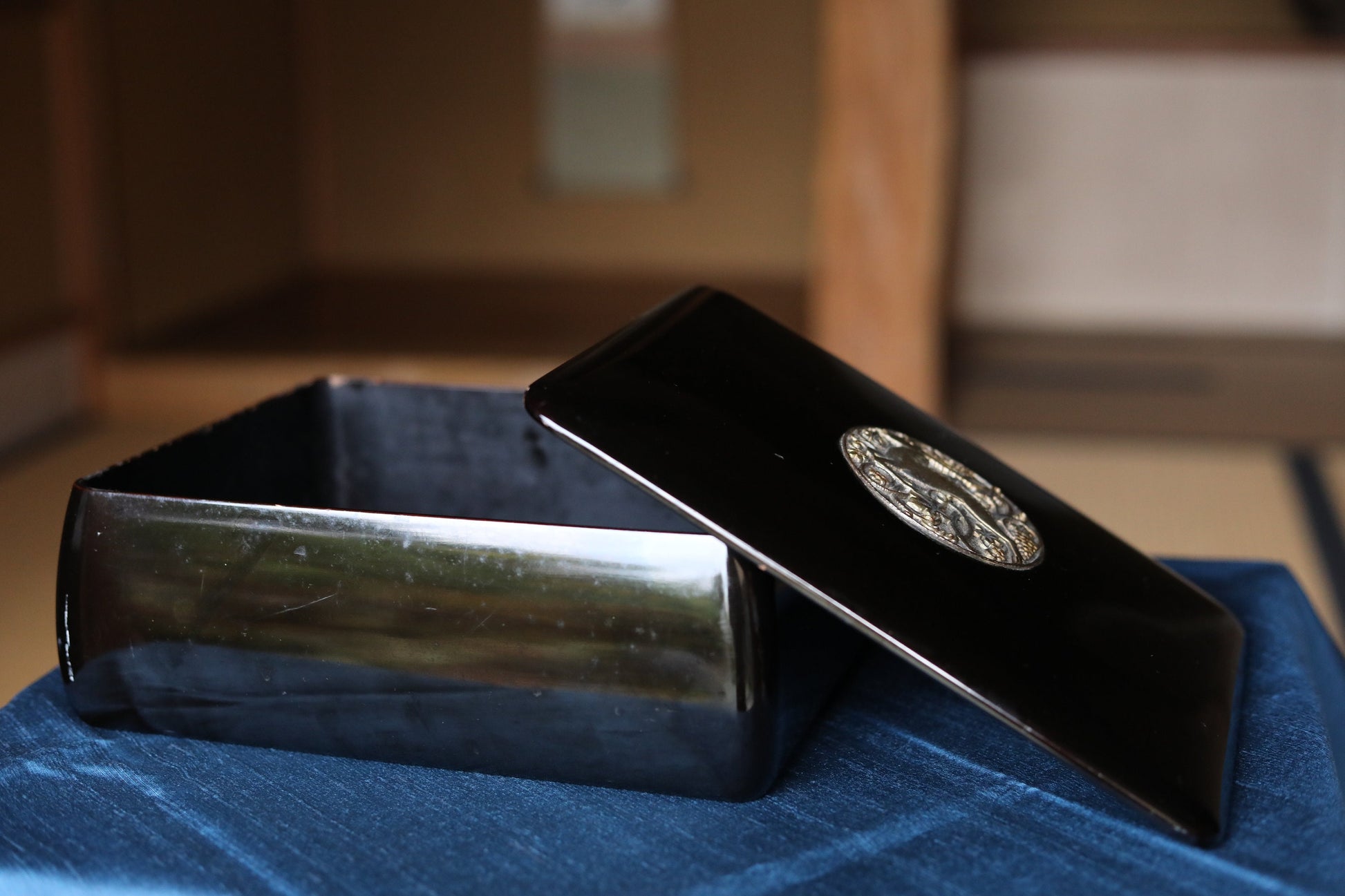 As a craft, shape is different from basic sutra boxes, slightly bulging bottom with beautiful side curves. A thin lid is well balanced with a bit thick body and metal engraving of a goat and grapes gives fresh impression to black lacquer.