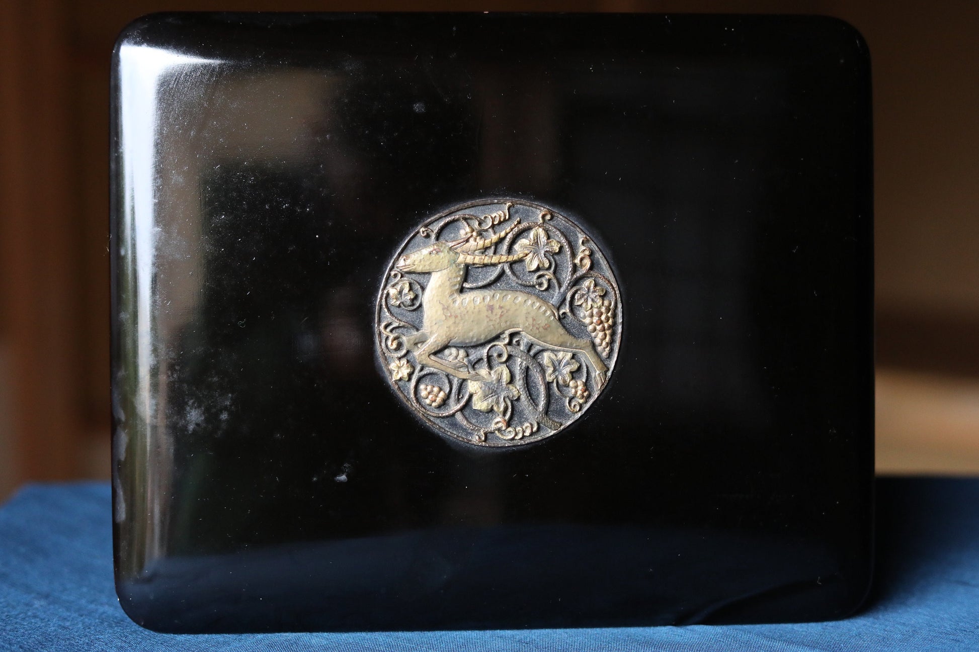 Japanese Makie Black Lacquer wooden box for letter container with a brass emblem of a goat and grapes from Aesop's fables, W10.8×D8.7in