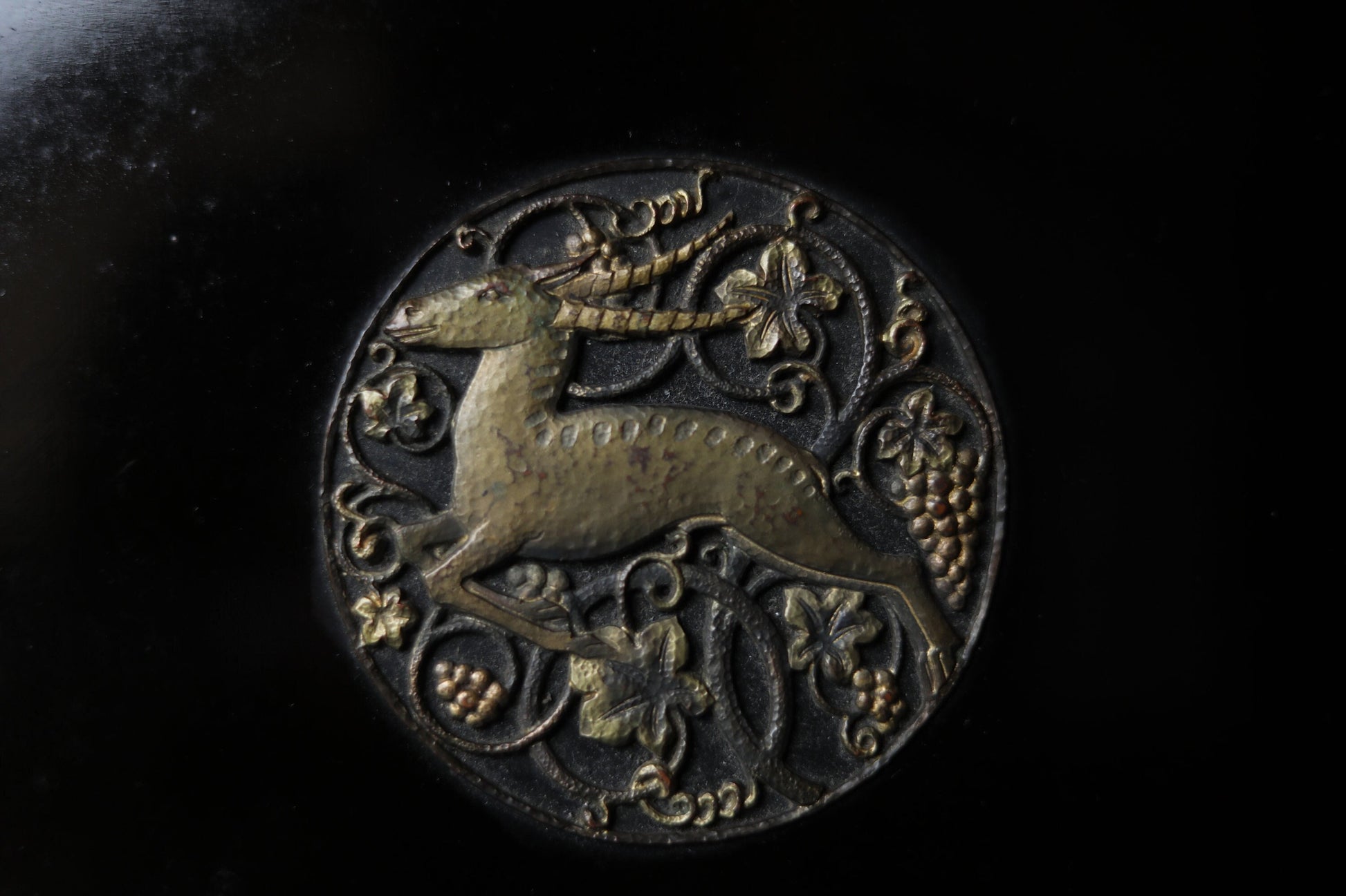 This is a unique black lacquer box from a temple. Usually lacquer boxes in temples have family crests or arabesque patterns on their surfaces. Yet a monk made a craftsman make boxes which imply Aesop's fables he likes. Though he had several boxes, this is only one left, the goat and grapes. He loved telling stories to neighbor children and this box made chance to begin the story which teaches moral easily.