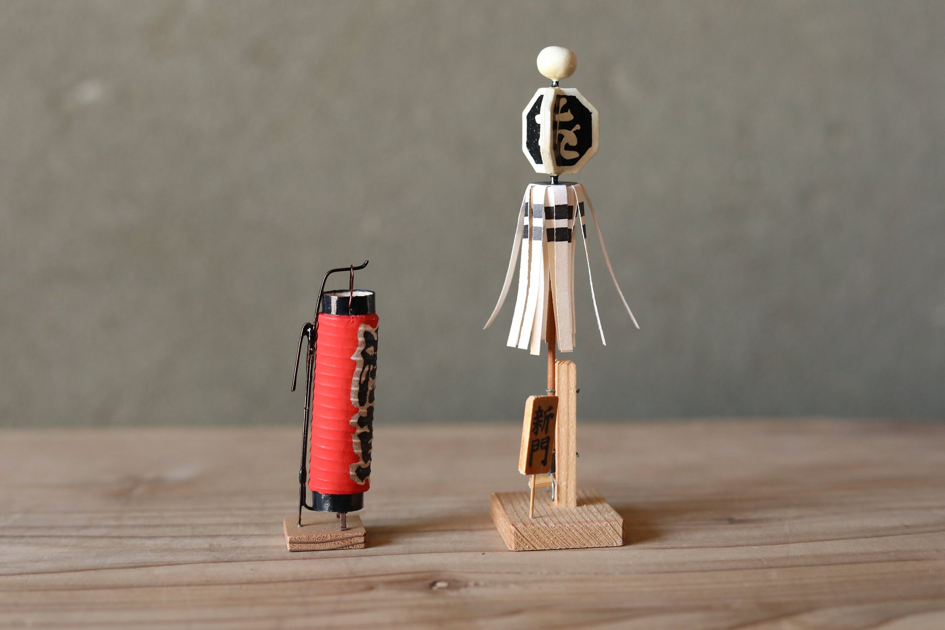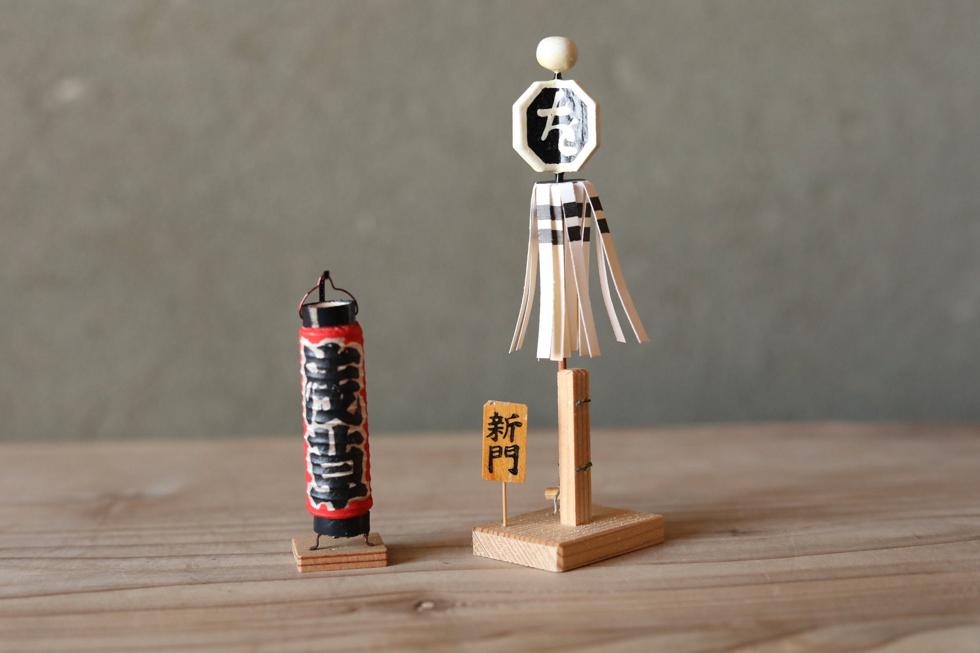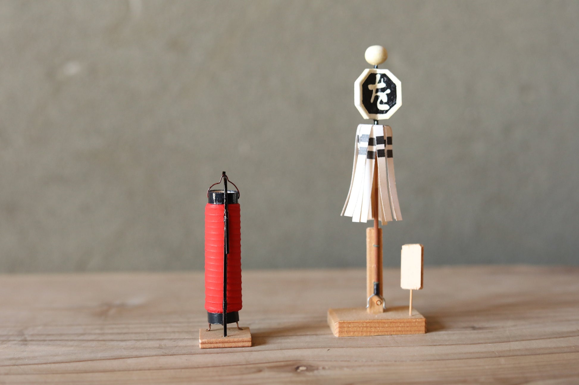 Japanese old miniature toy set Chochin Lanterns and firefighter decorations with Kanji calligraphy made of wood and paper 4.6×1.1in