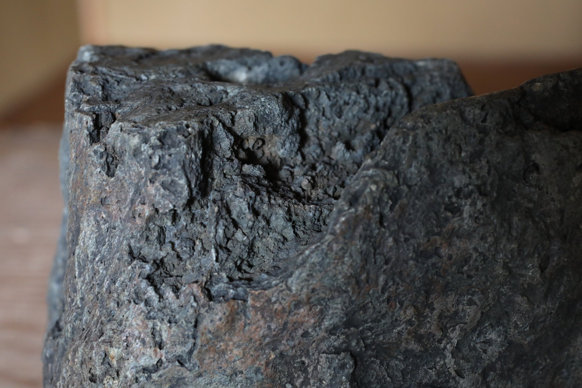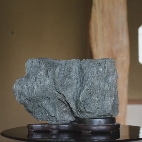 Gazing upon the surface of this Suiseki, one sees the frozen movement of flowing lava, capturing a sense of soft, draped fabric. Yet, the fascinating contrast emerges when the stone is displayed upright: it transforms into a craggy mountain cliff, suddenly revealed in a remote mountain gorge as the mist clears.