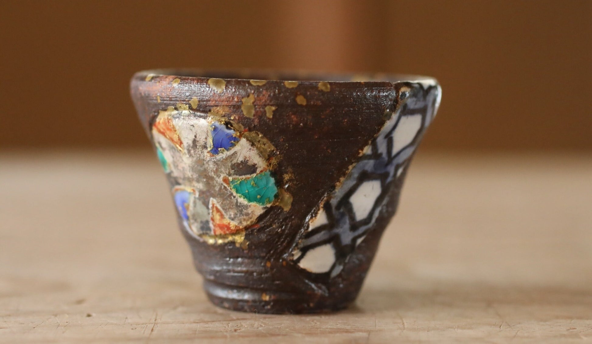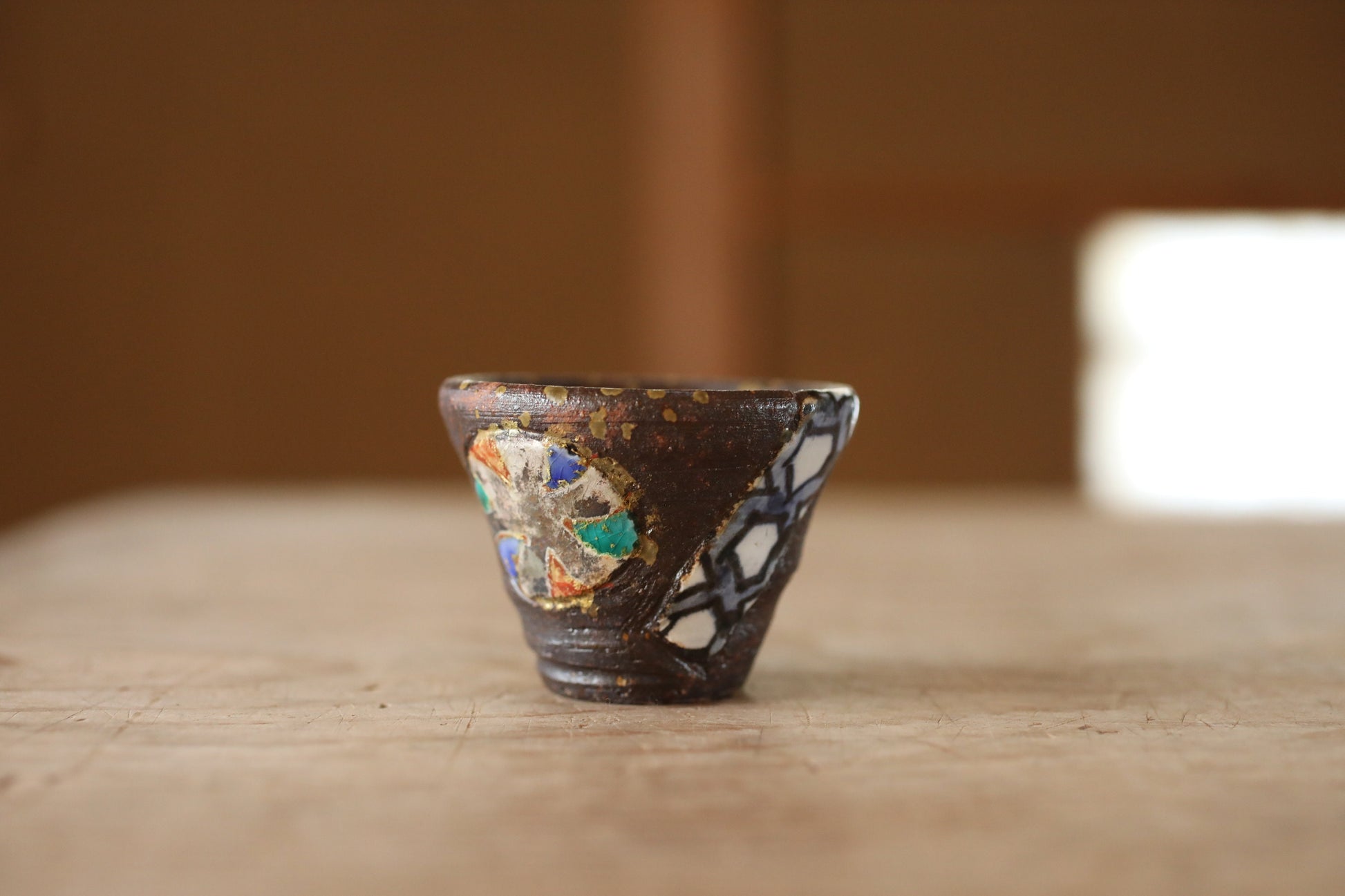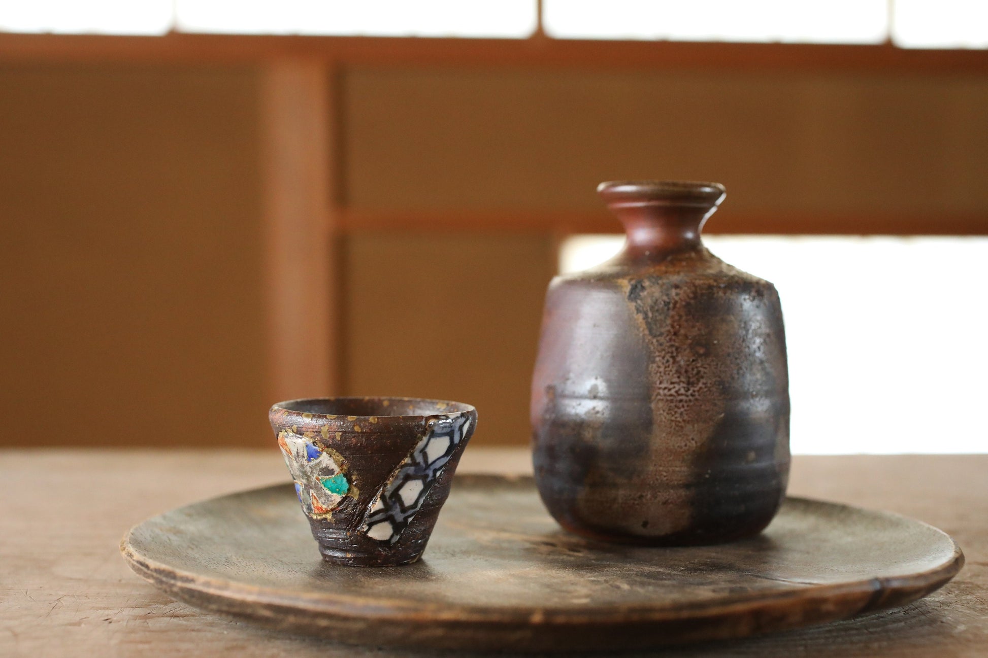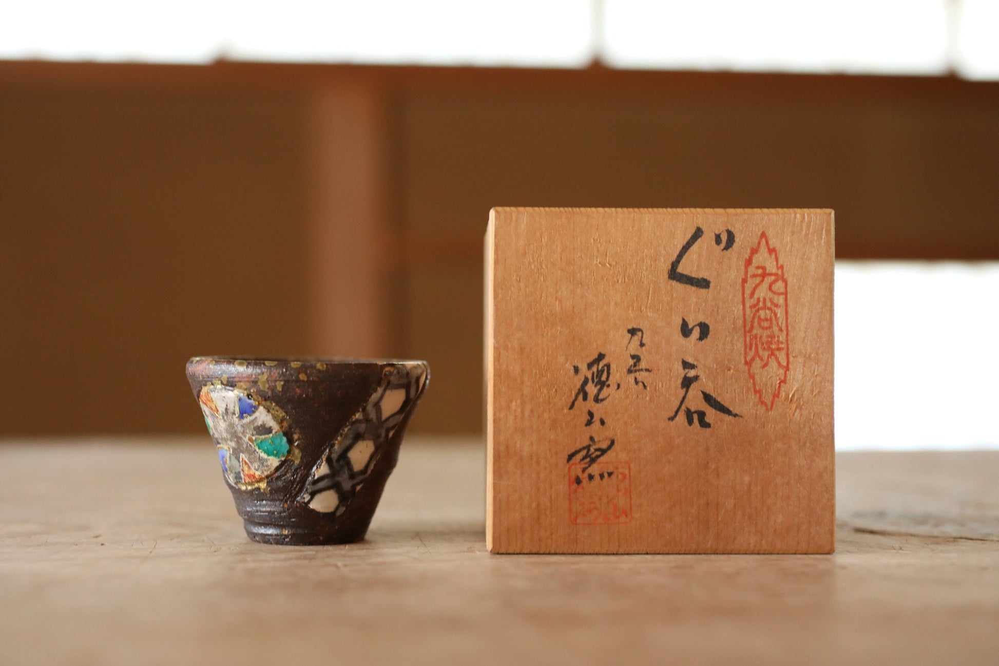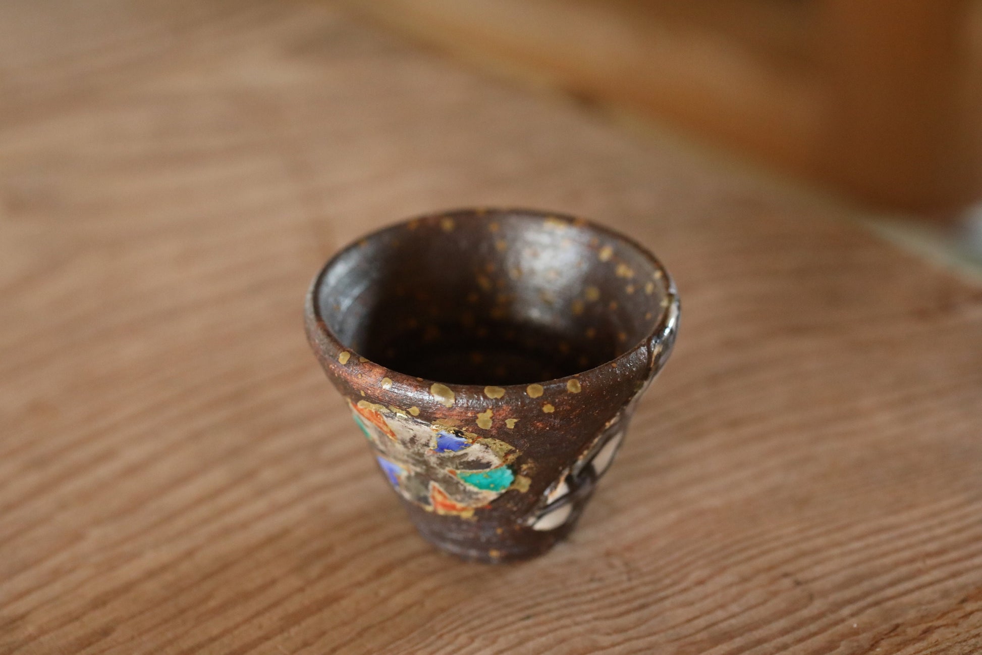The natural atmosphere of the brown clay is utilized, and abstract designs are painted on top of it. The gold color, which also extends to the inside, is especially beautiful, and it comes in a wooden box, making it a great gift.