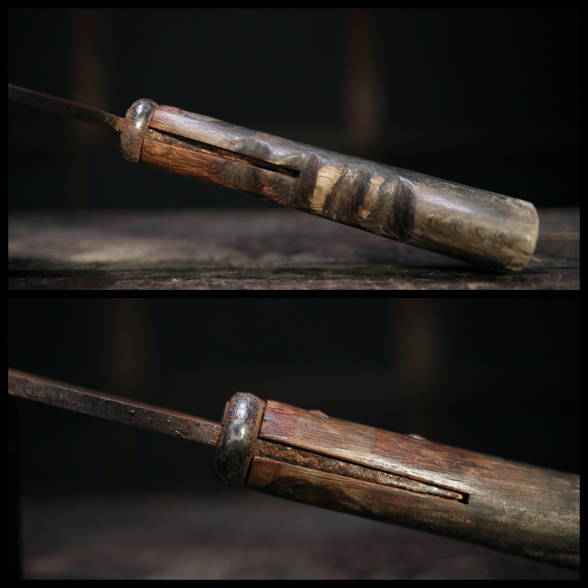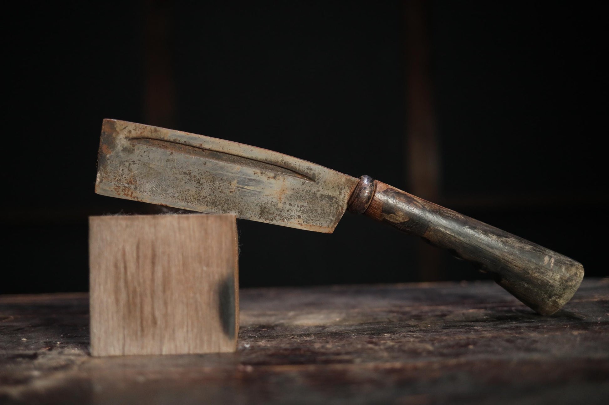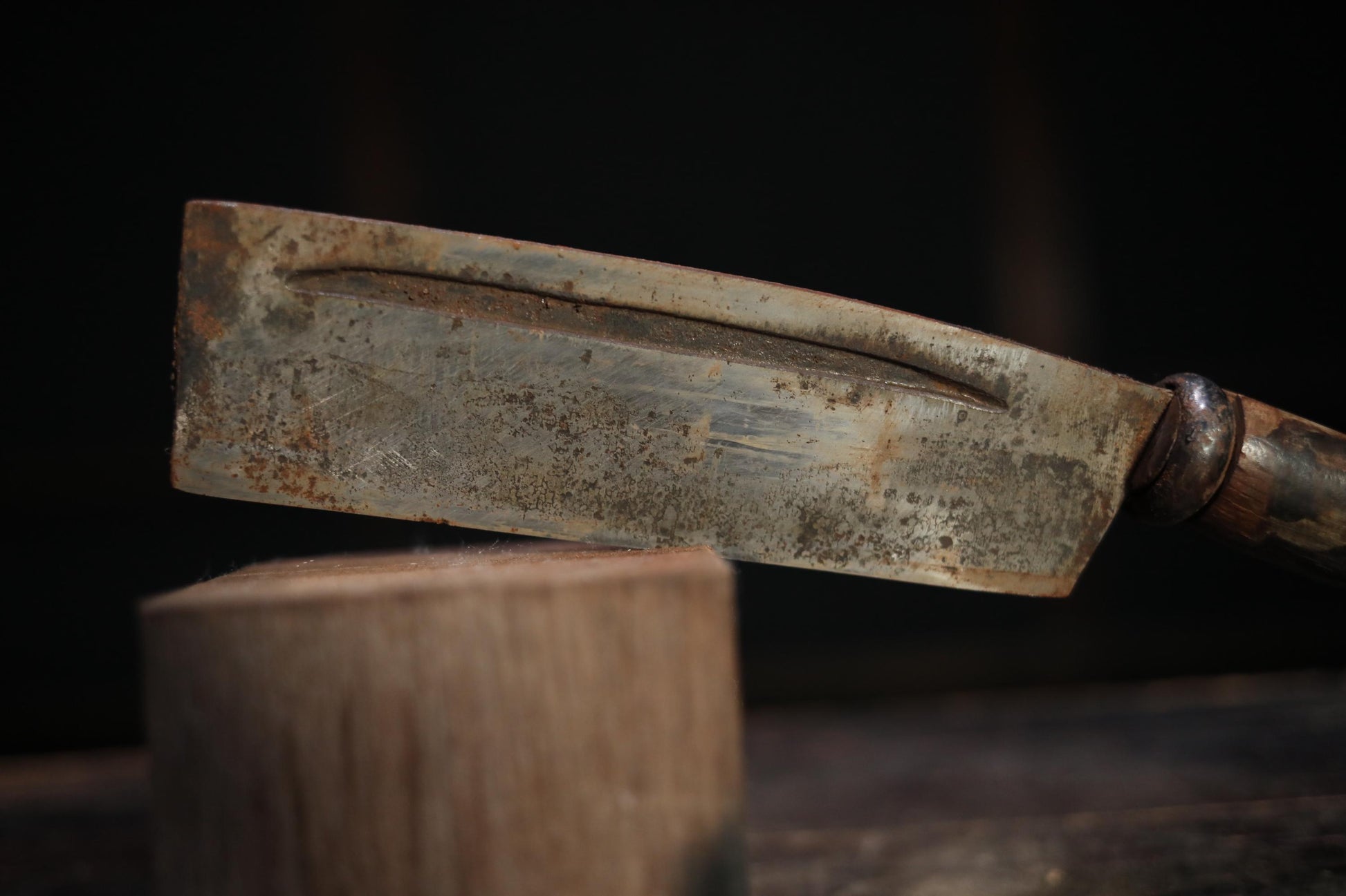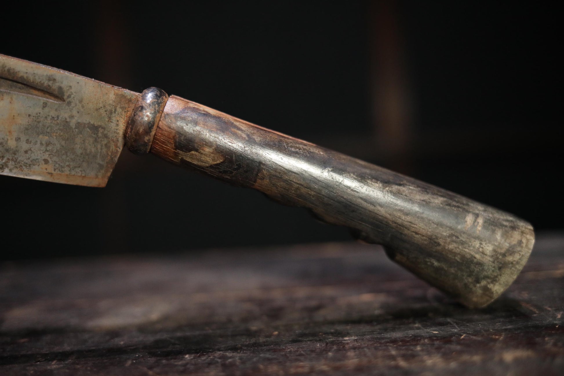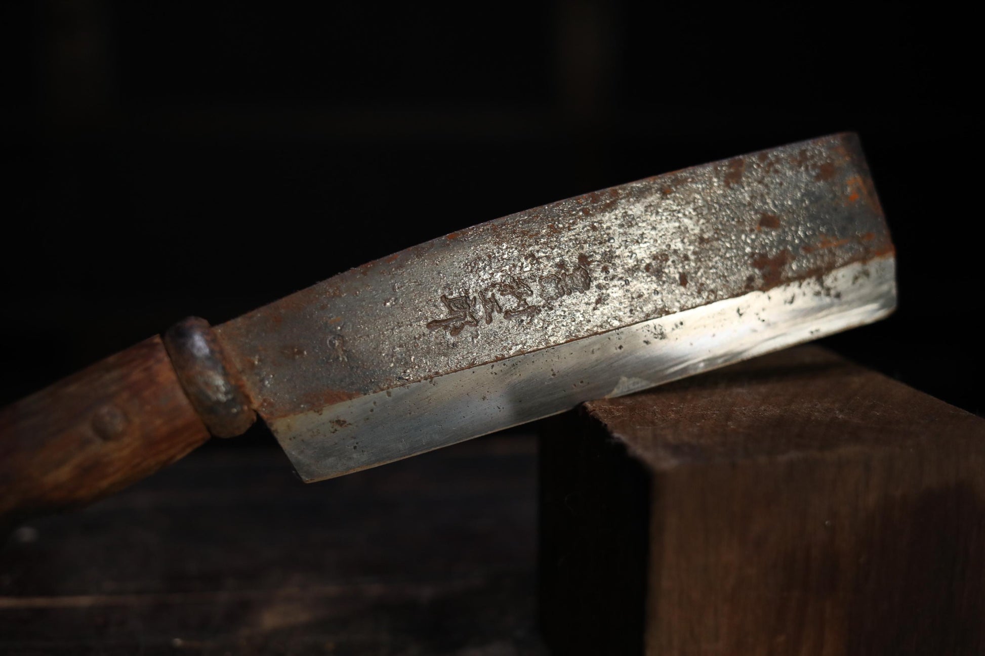 For the country where 70% of its land is occupied with forests, blades for trees had made progress to meet various demands. This is a "Yabukogi nata", a type of machete specifically designed for bushwhacking in Japan's temperate forests. Given that most forest floors in Japan are covered in dense undergrowth, this tool is essential for clearing paths. Its 6.4-inch blade, designed to be relatively heavy, allows for effortless cutting of bamboo grass and other vegetation. It is also used to cut off small branches as well. The handle is ergonomically shaped to fit four fingers comfortably. The blade bears the inscription "利五郎 Toshigoro", the hallmark of a blacksmith from Niigata. The machete comes with a wooden case covered in synthetic leather. While there is some surface rust on the blade as seen in the photo, there are no chips or other damage, indicating that it is ready for immediate use."