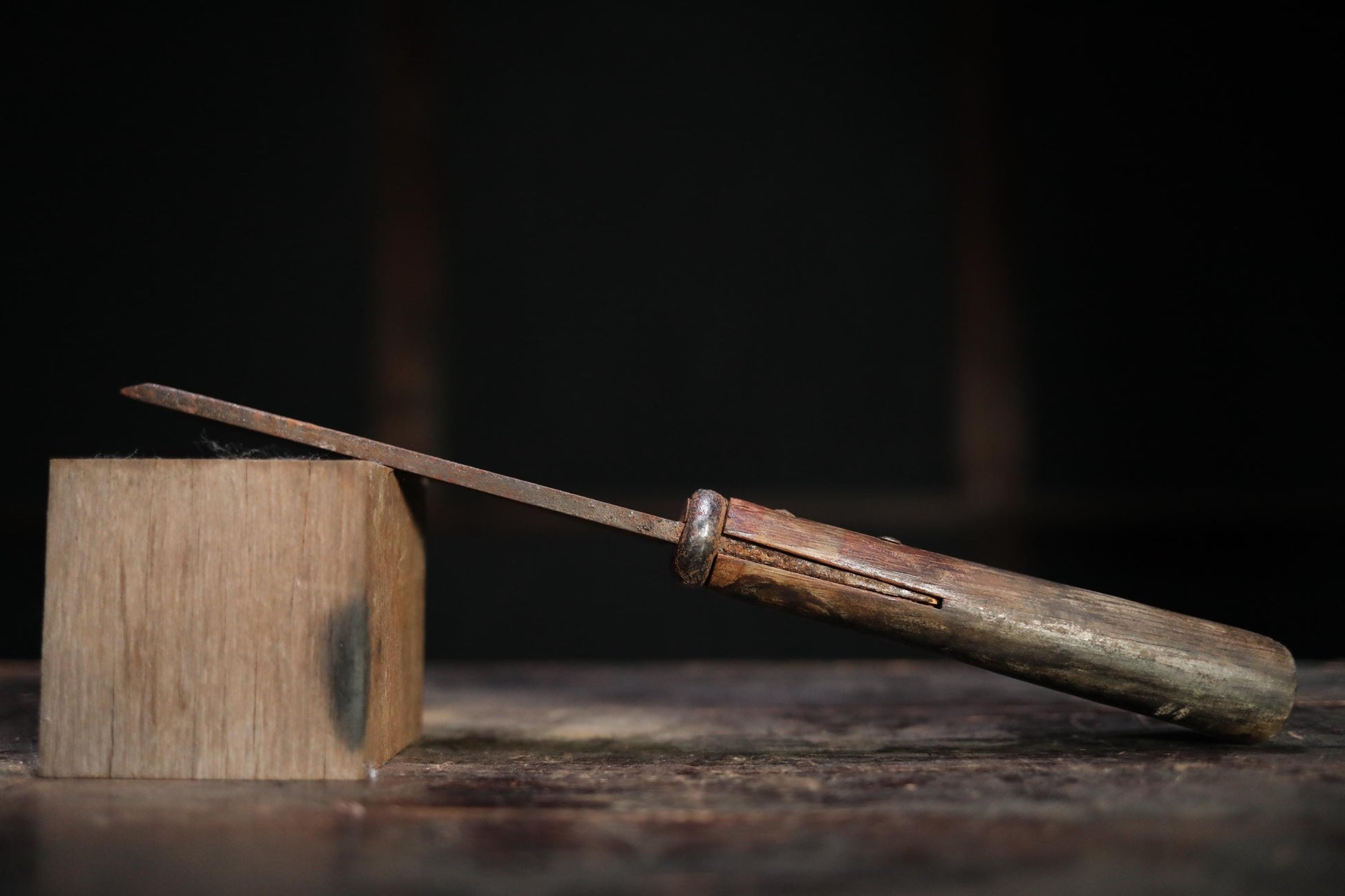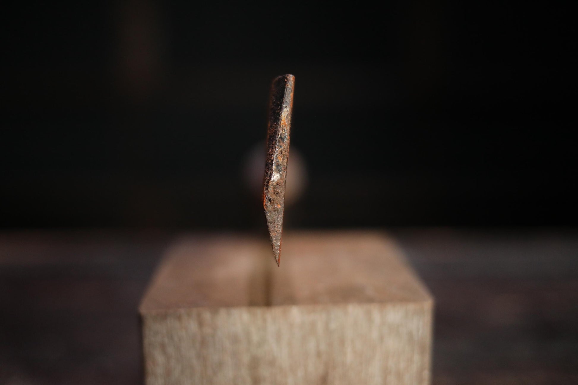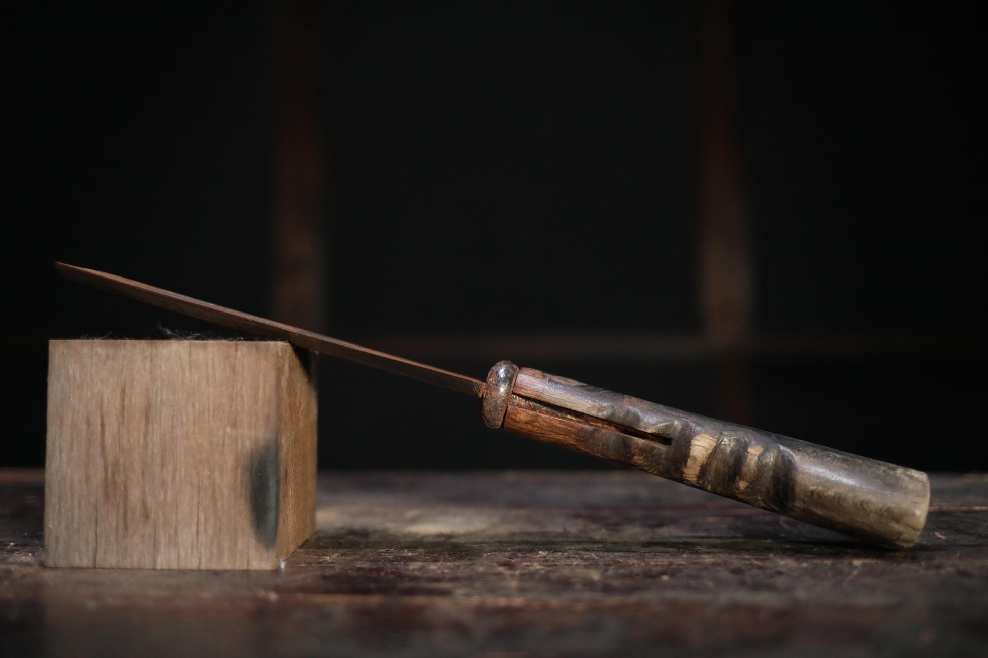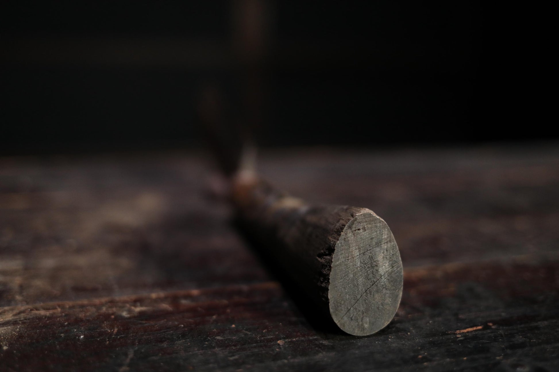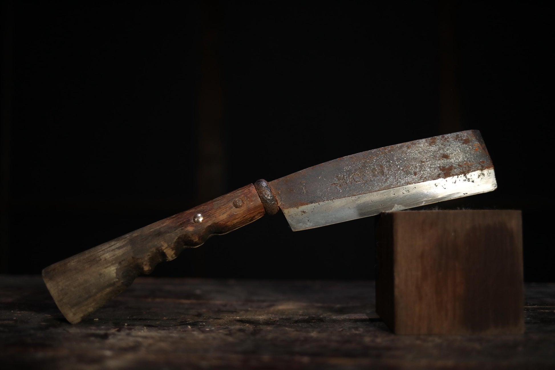 For the country where 70% of its land is occupied with forests, blades for trees had made progress to meet various demands. This is a "Yabukogi nata", a type of machete specifically designed for bushwhacking in Japan's temperate forests. Given that most forest floors in Japan are covered in dense undergrowth, this tool is essential for clearing paths. Its 6.4-inch blade, designed to be relatively heavy, allows for effortless cutting of bamboo grass and other vegetation. It is also used to cut off small branches as well. The handle is ergonomically shaped to fit four fingers comfortably. The blade bears the inscription "利五郎 Toshigoro", the hallmark of a blacksmith from Niigata. The machete comes with a wooden case covered in synthetic leather. While there is some surface rust on the blade as seen in the photo, there are no chips or other damage, indicating that it is ready for immediate use."