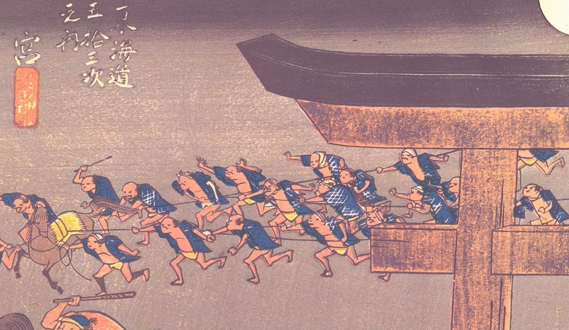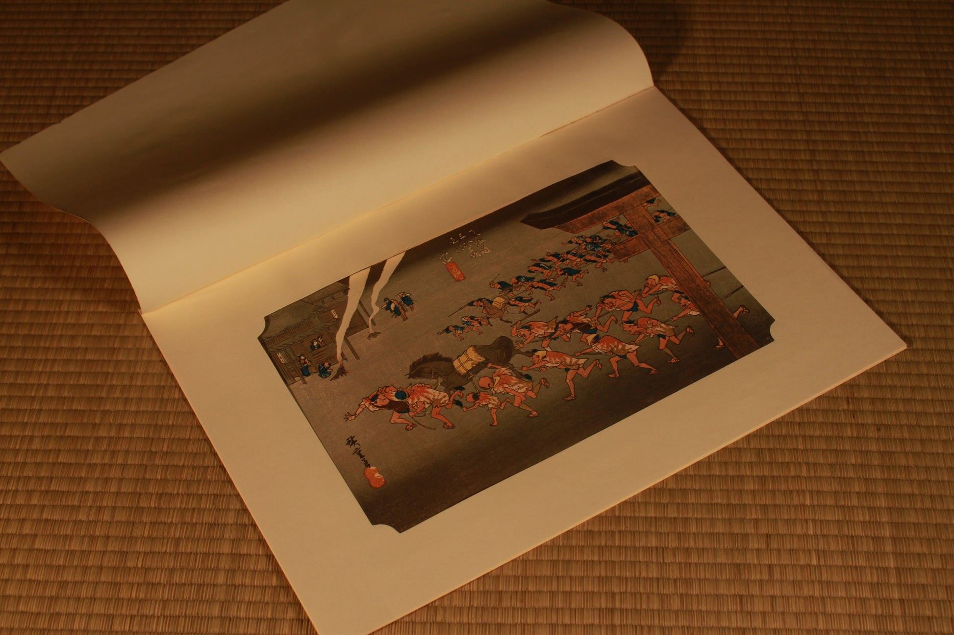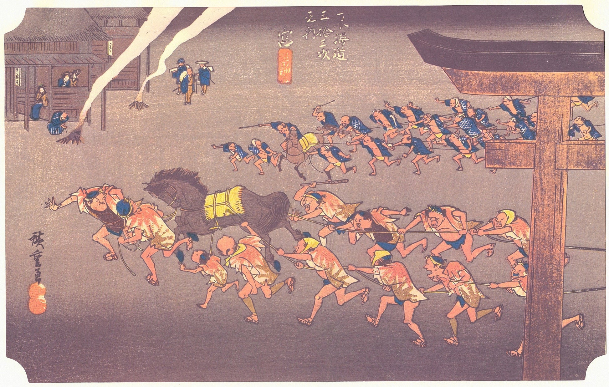 Japanese Ukiyo-e Woodblock print, by Hiroshige, "Miya Shrine Festival" From the series Fifty Three Stations of the Tokaido 10.2in×15in