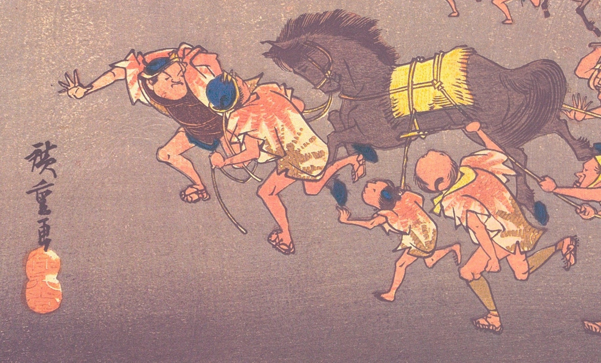 The motif of this print is called Miya. It is said that the place name was Miya because it is the gate town of Atsuta Jingu. This figure depicts a horse that appears at a festival at Jingu. It is said that a god has descended on the horses of this festival, and it is said that two horses were made to run, and at that speed, a good harvest of the year was foreseen. It dynamically depicts the state of a heroic festival in a bonfire.
