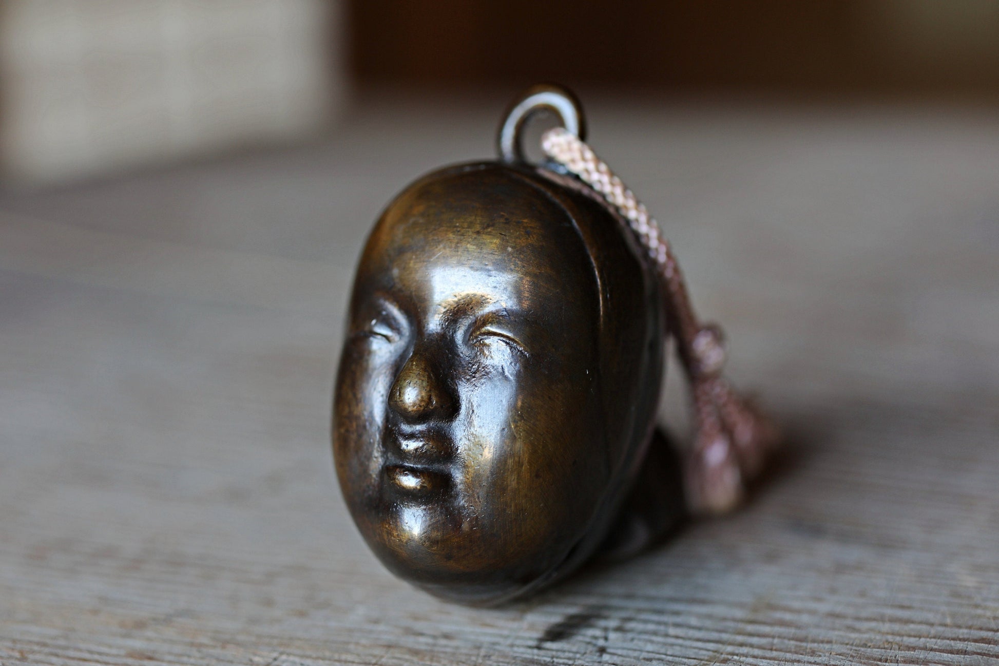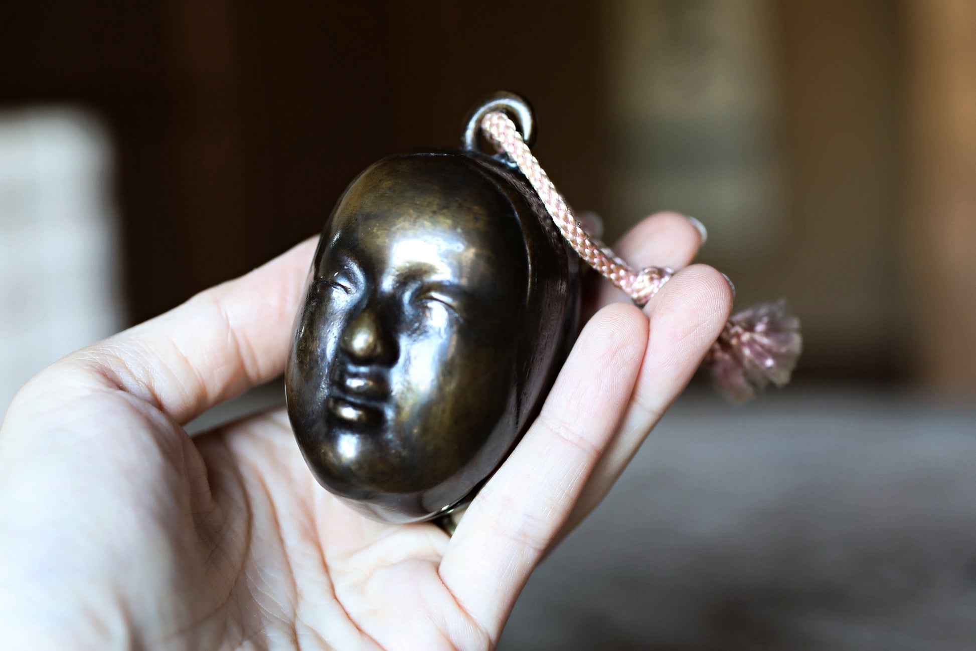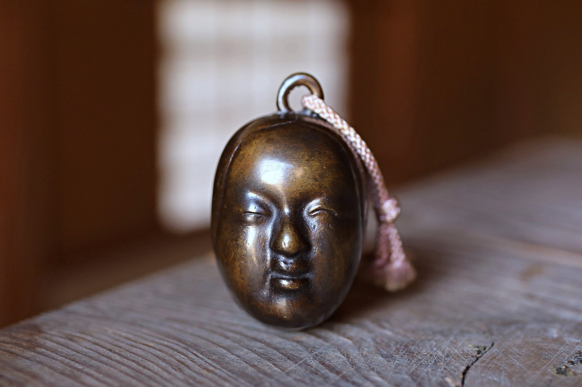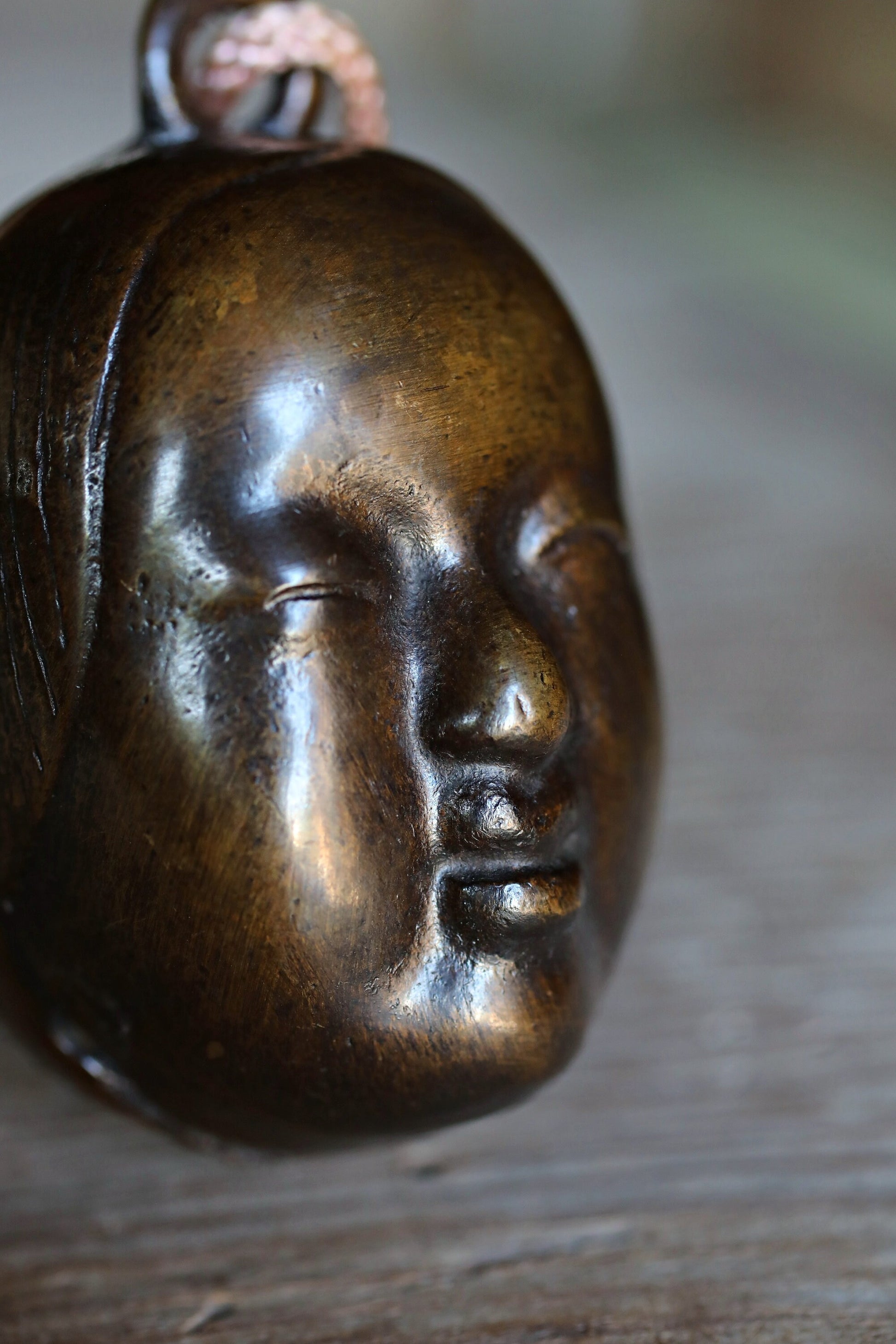 Japanese vintage 1930s small Bronze bell NOH MASK KOOMOTE doll ornament Paper weight, hand metal craft H3×1.8in/H7.5×4.5cm