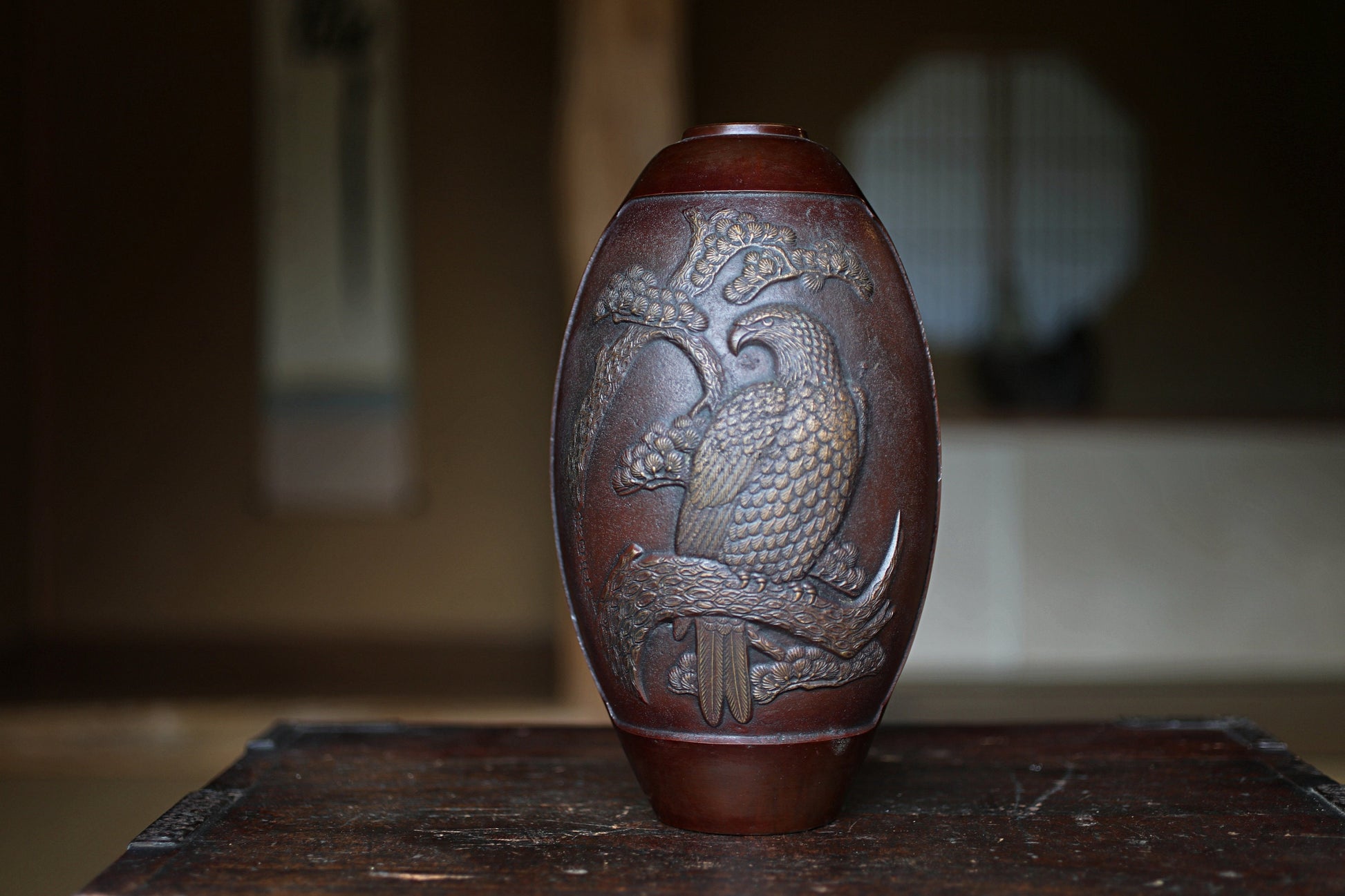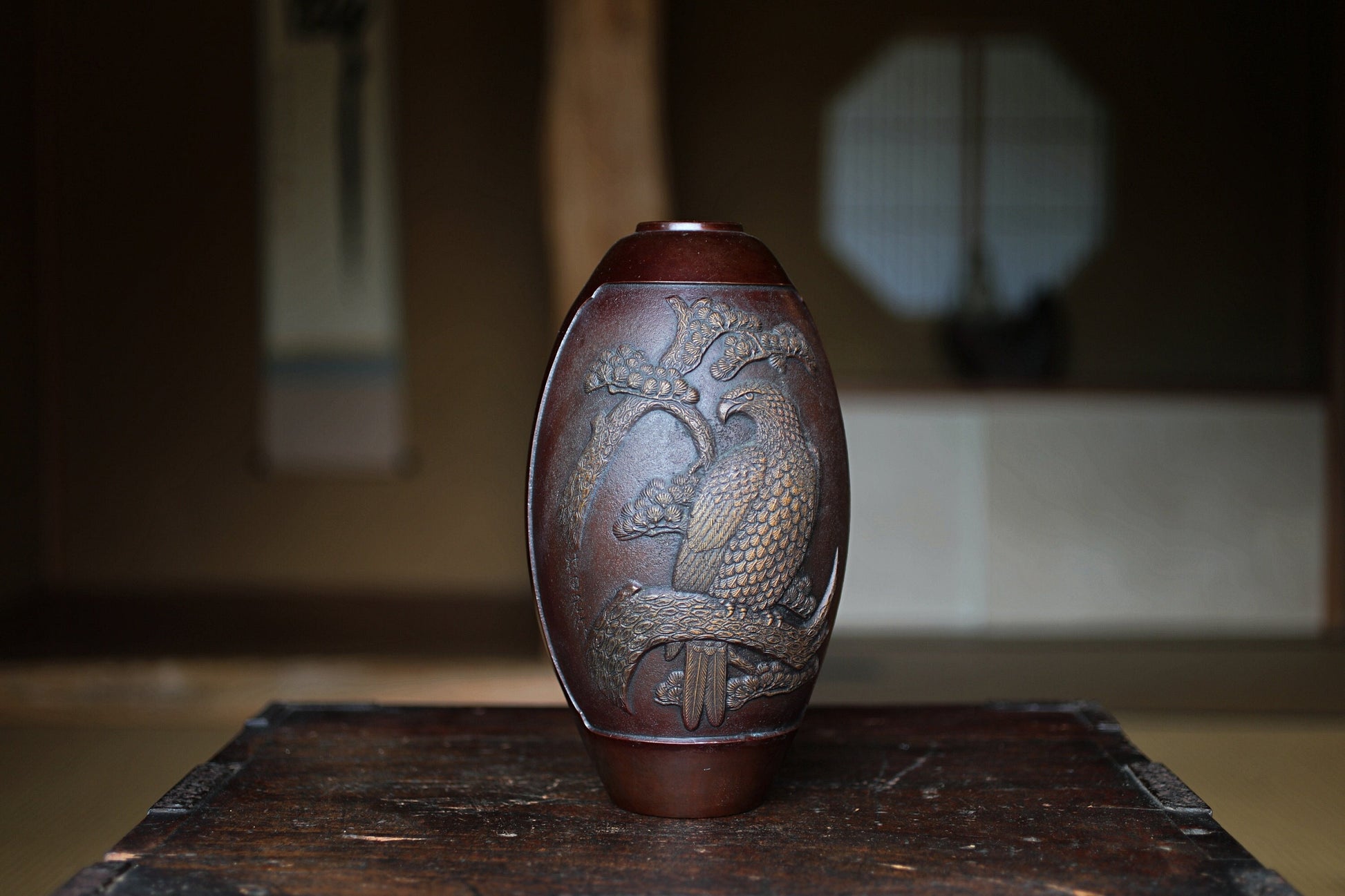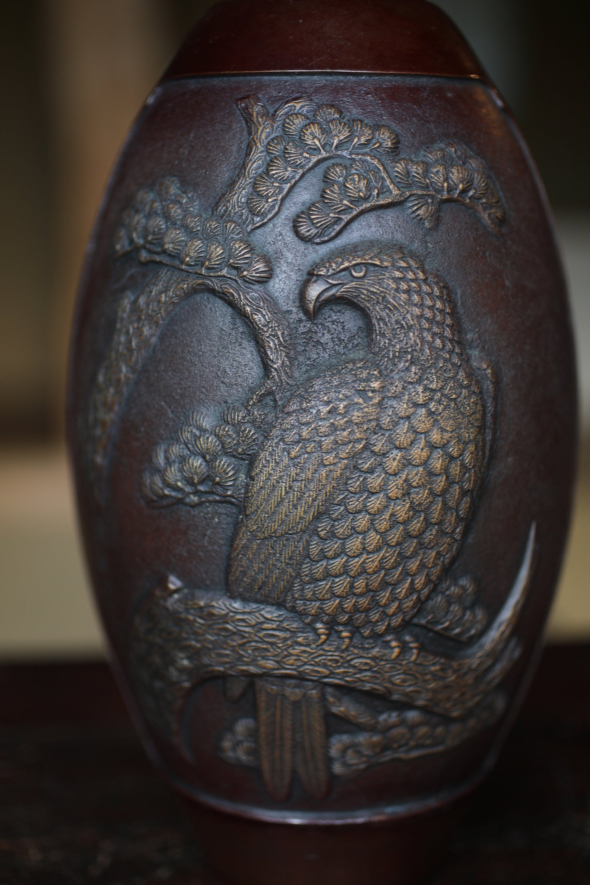 Japanese vintage 1950s bronze vase vase with relieves of Pine Trees and Eagle, lost wax art Takaoka, with Kanji signature H10.6in/H27cm