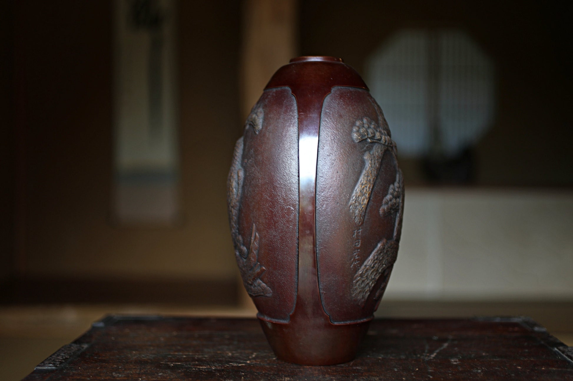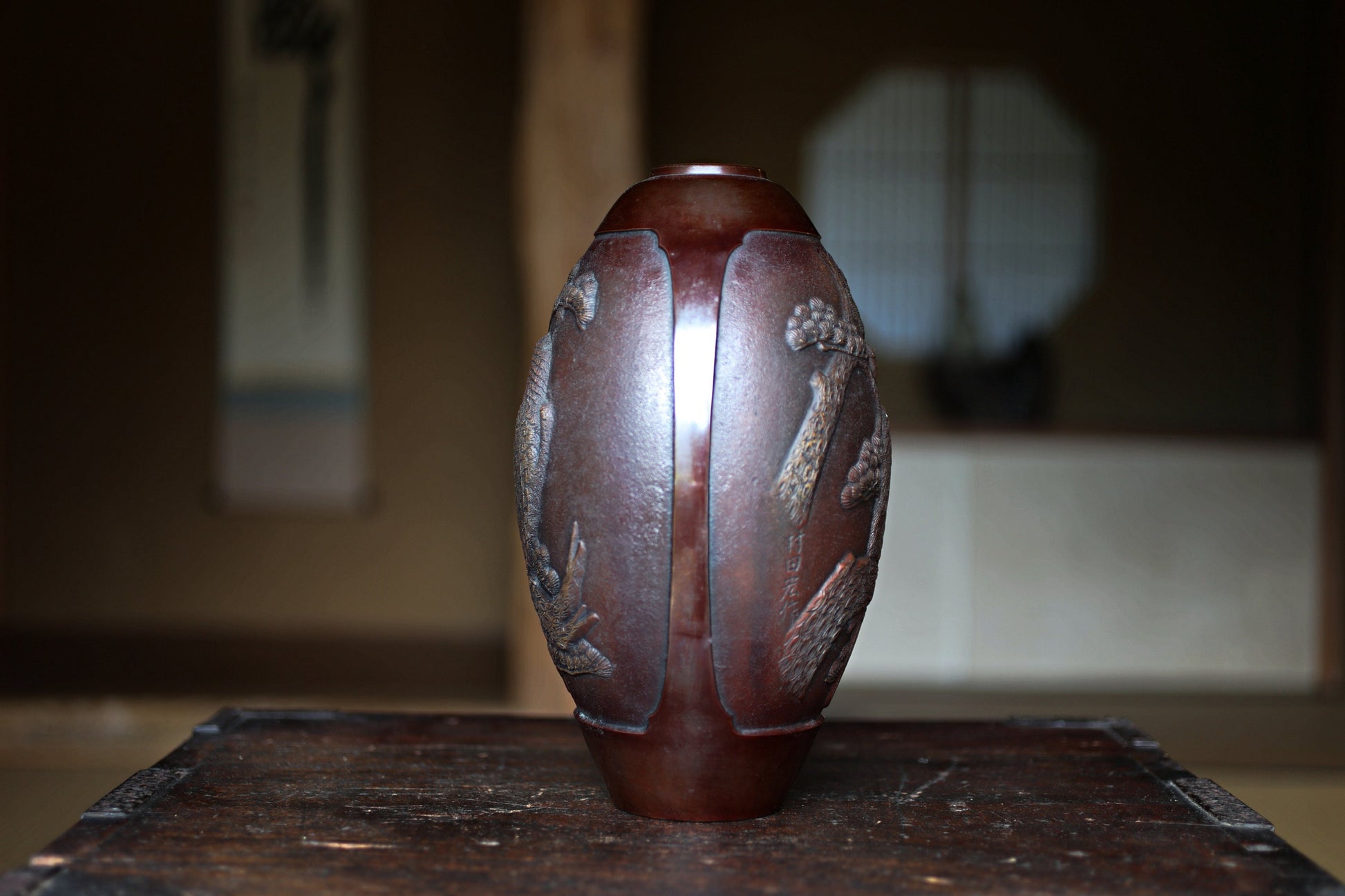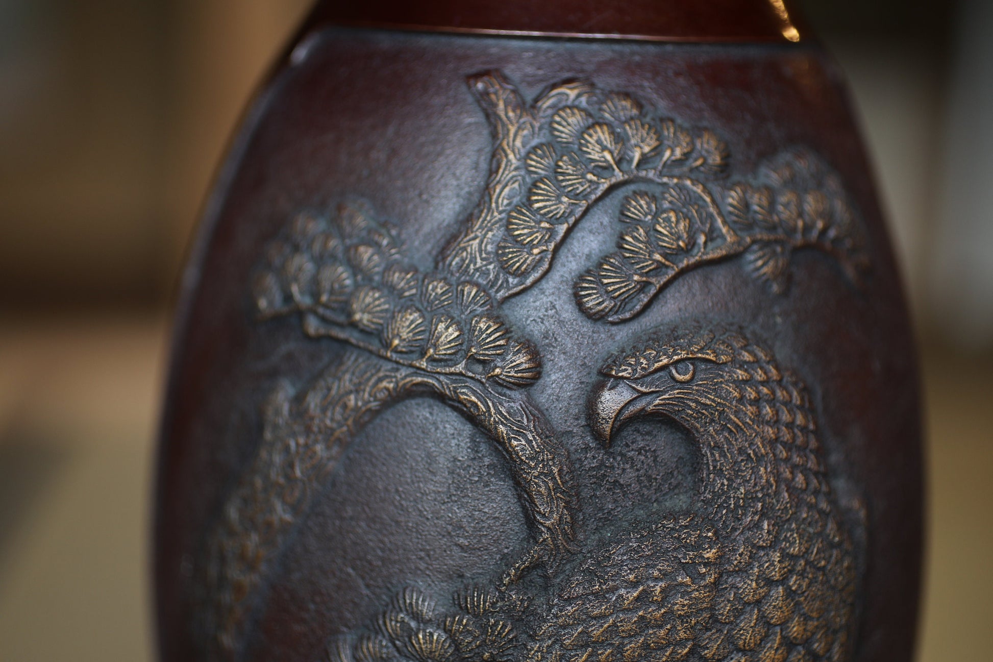 Japanese vintage 1950s bronze vase vase with relieves of Pine Trees and Eagle, lost wax art Takaoka, with Kanji signature H10.6in/H27cm