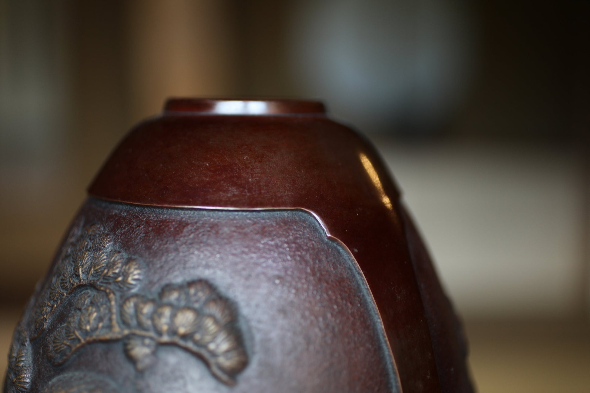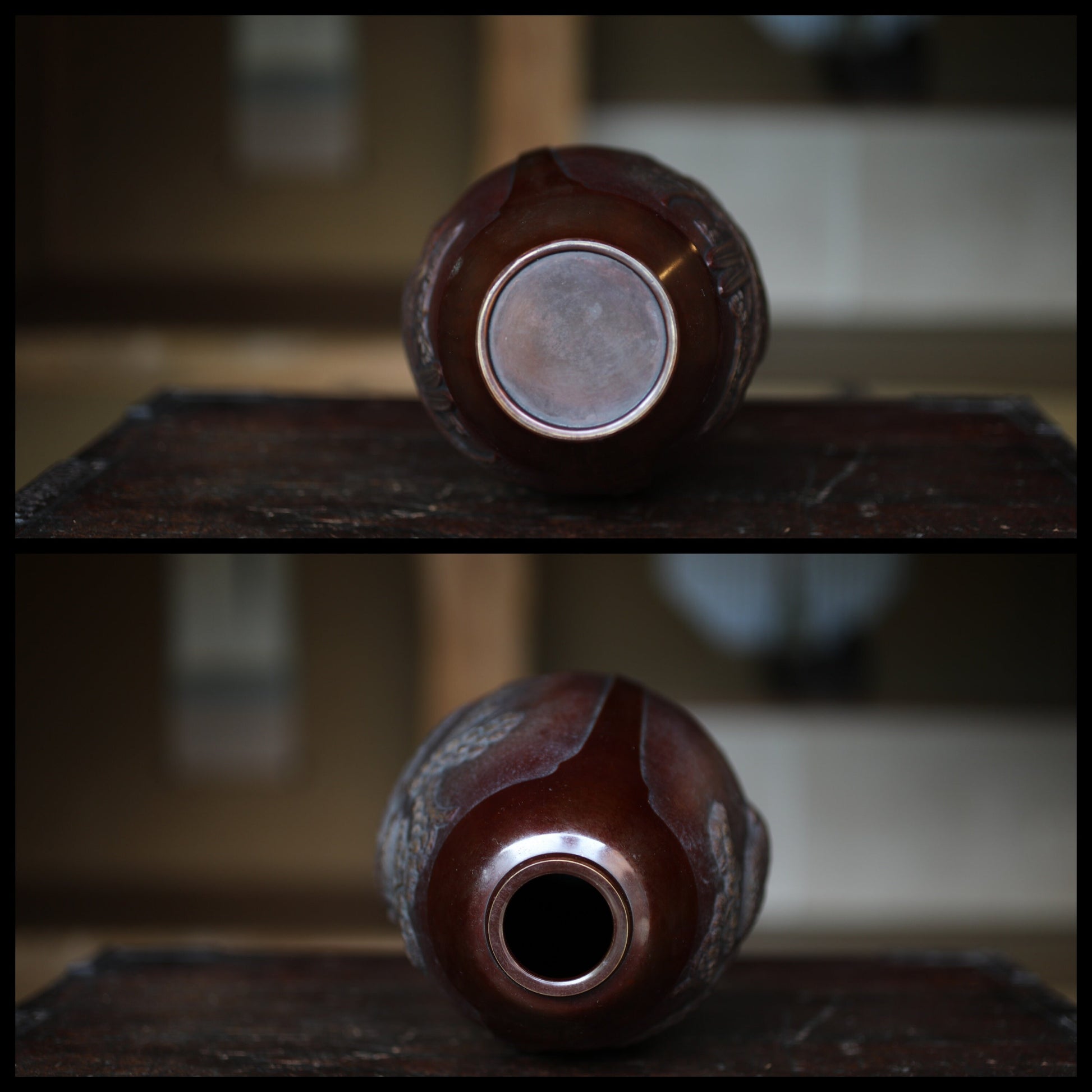 This is a copper vase made by a craftsman named 村田宏Hiroshi Murata. He was born in 1936 and won a prize at a famous Japanese art exhibition called Nitten in 1951. He is well known for his technique and his ability to express the creatures.