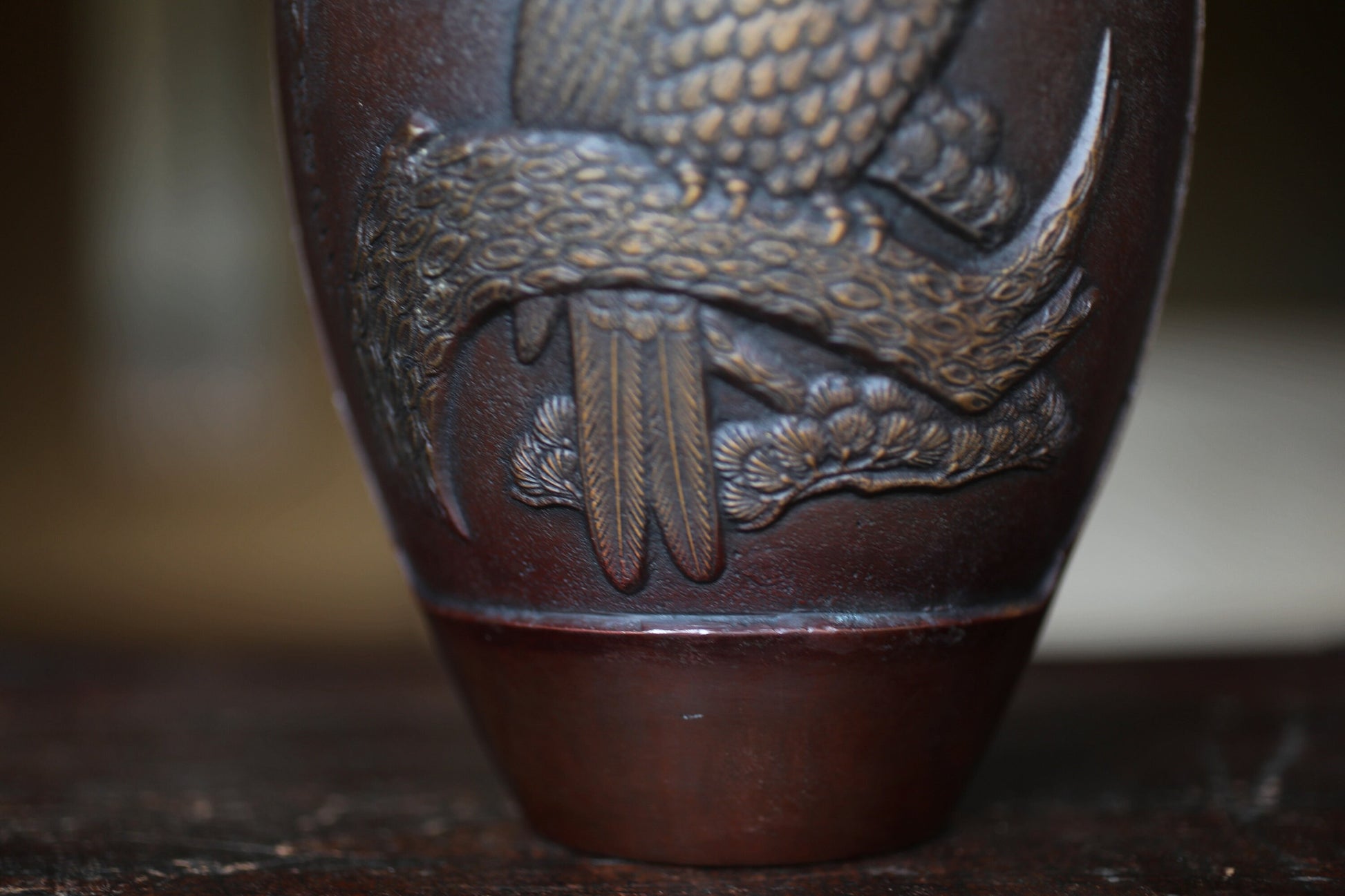 Japanese vintage 1950s bronze vase vase with relieves of Pine Trees and Eagle, lost wax art Takaoka, with Kanji signature H10.6in/H27cm.
