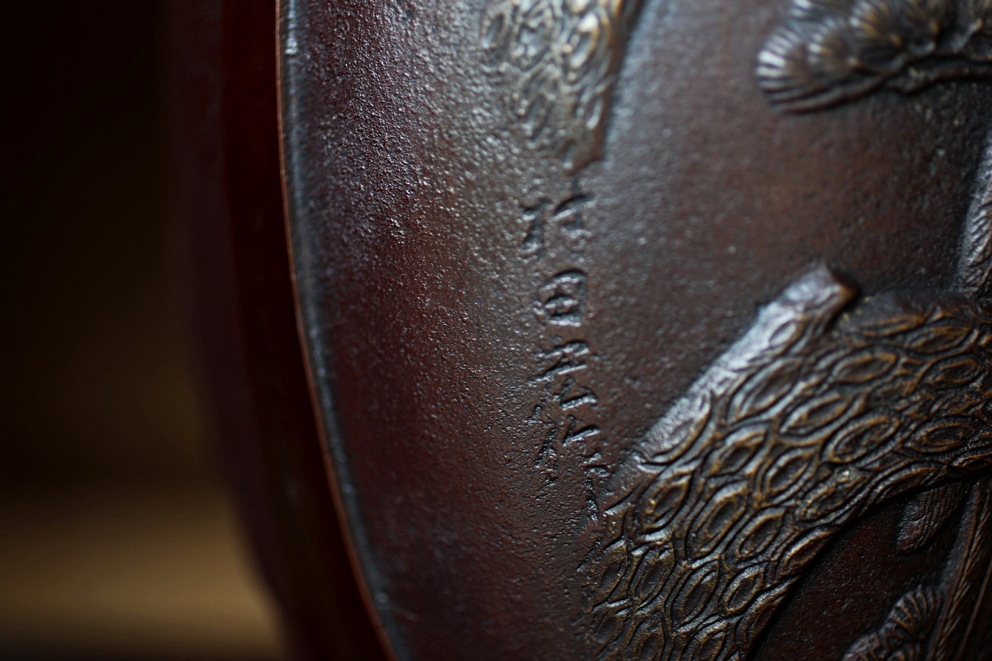 This is a double-sided relief representation of a eagle perched on a pine tree. It is inscribed with a signature in kanji.