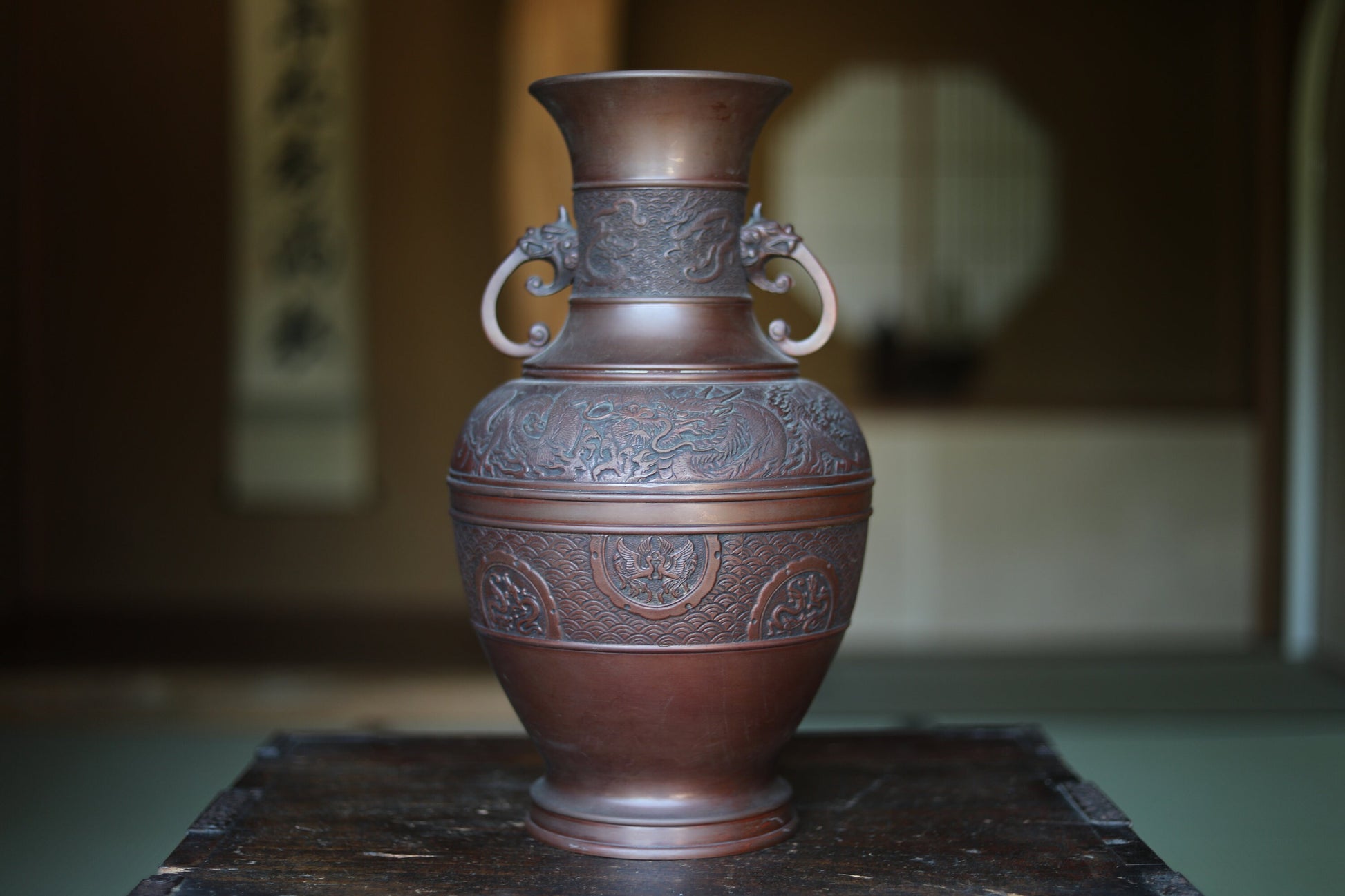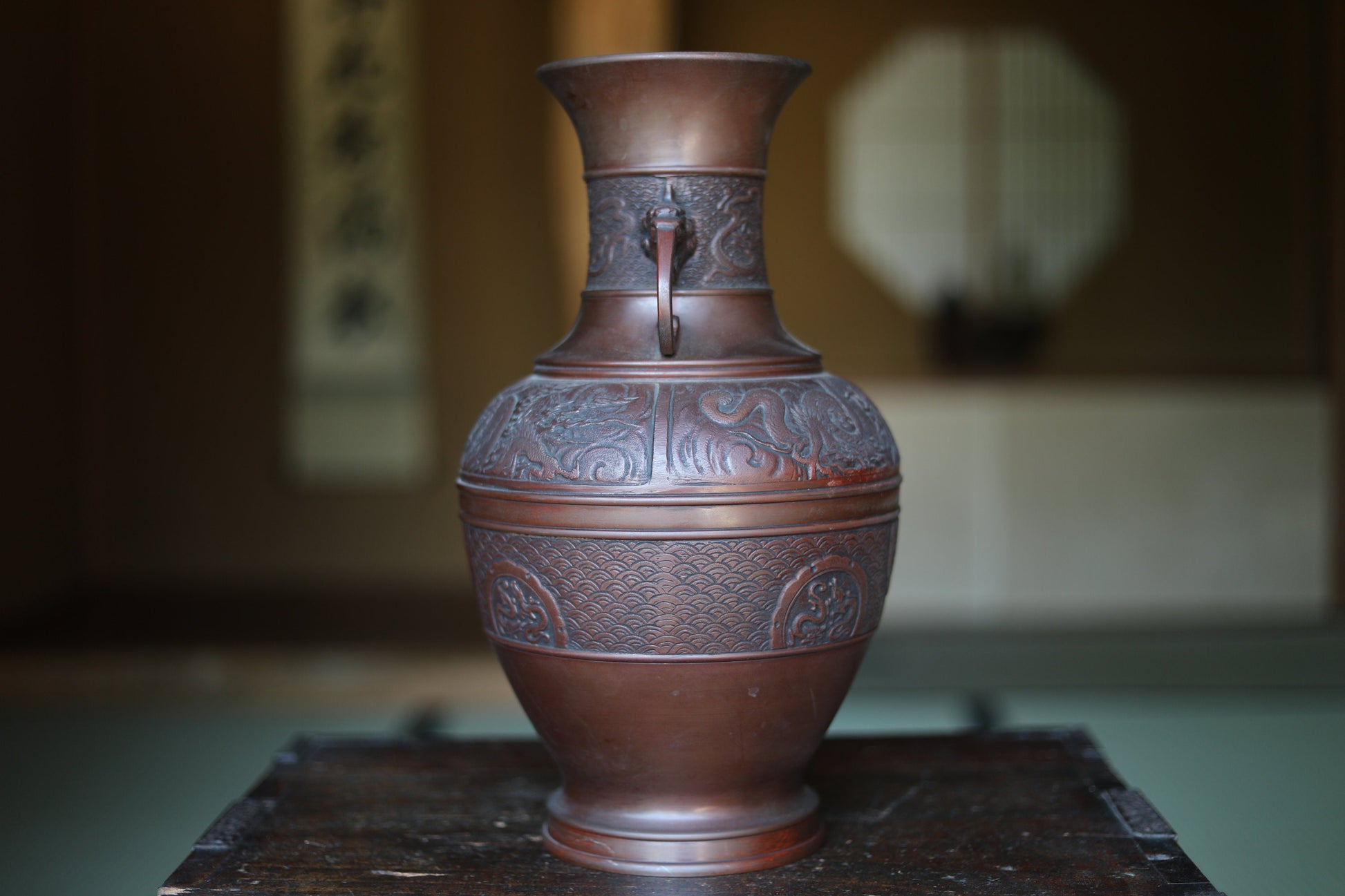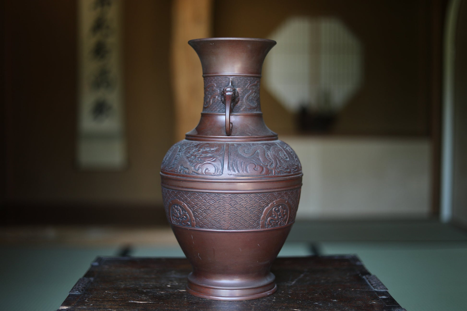 This copper vase was made by craftsmen in a workshop in 高岡 Takaoka, Japan that has been making copper vases for many years. It is large in size and powerful.