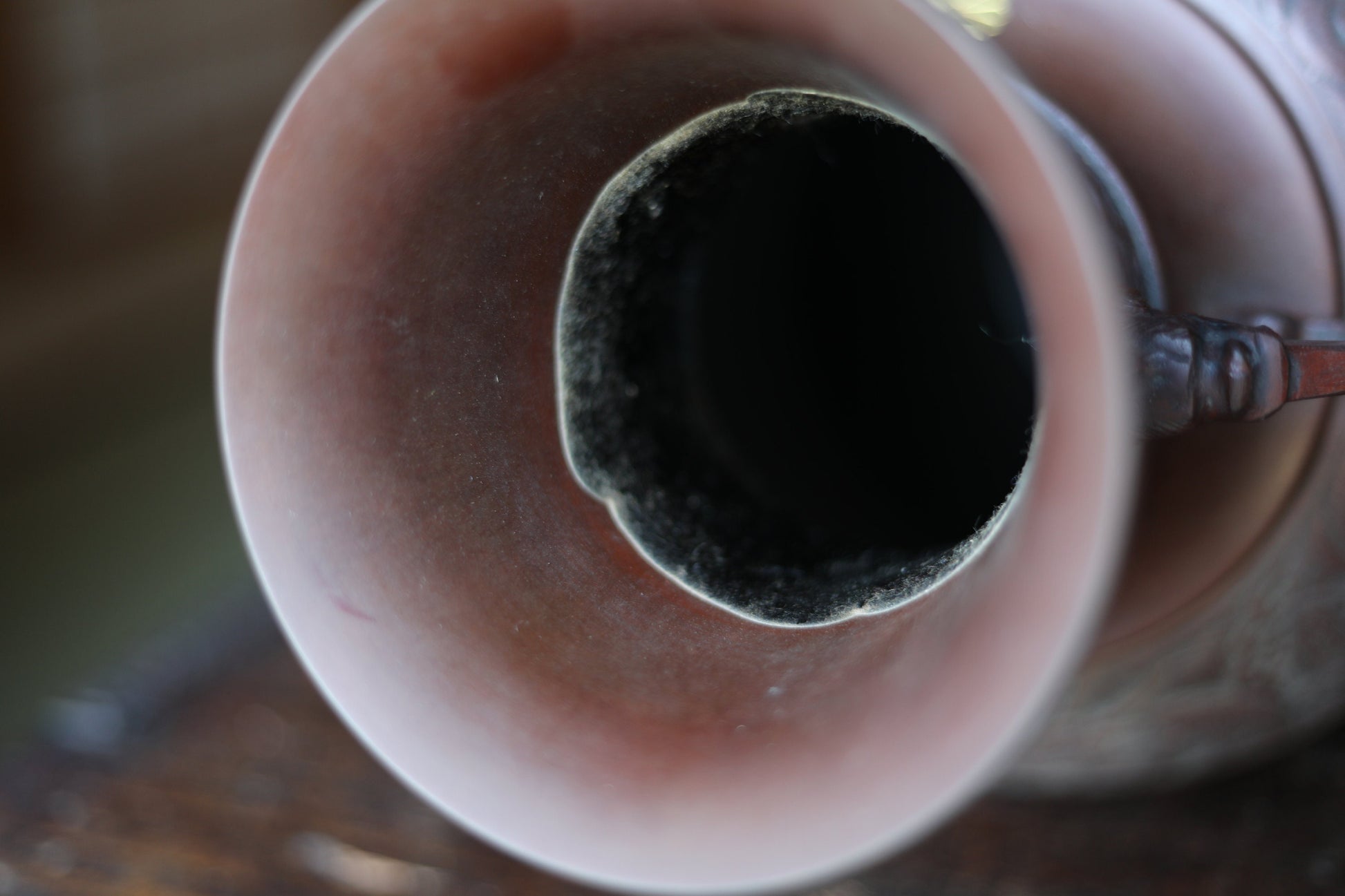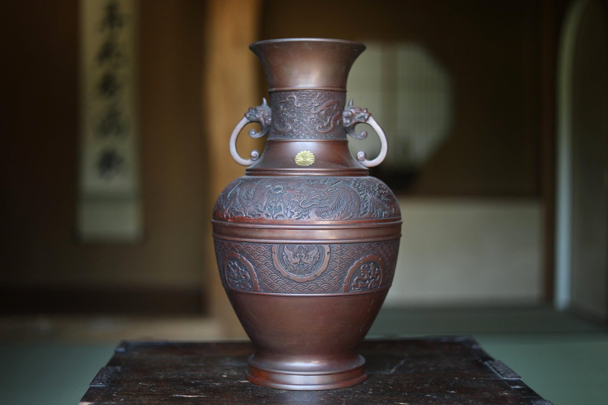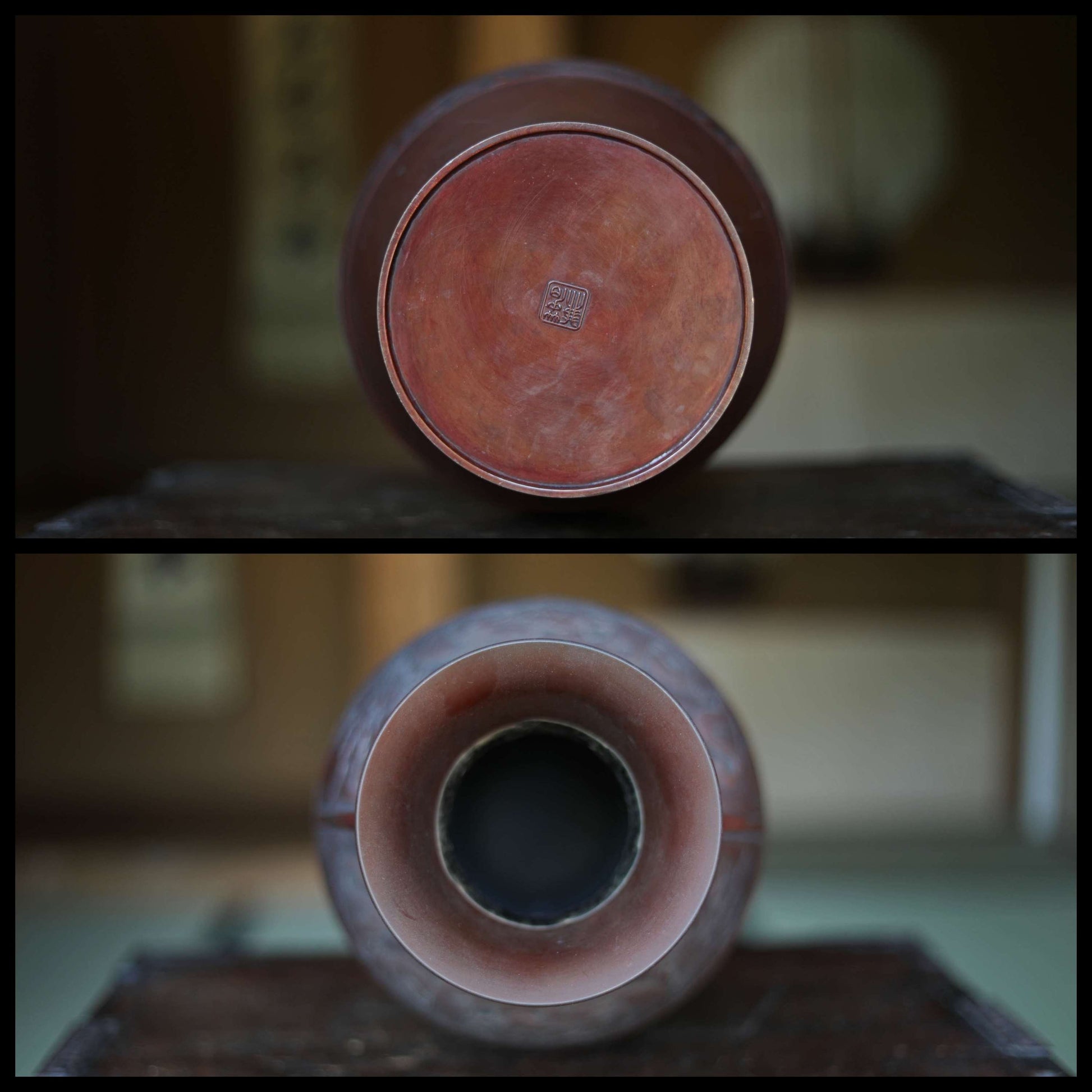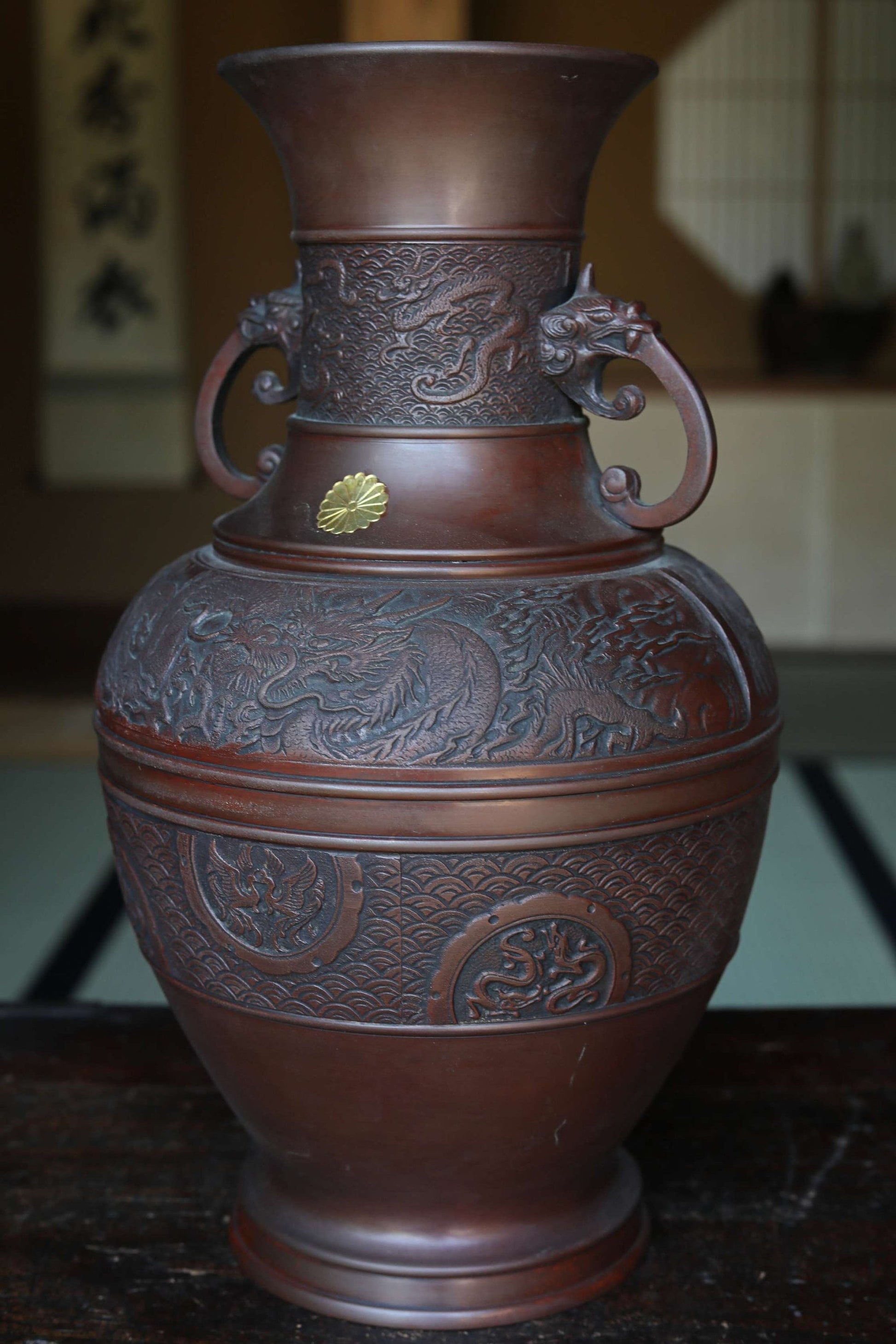 This copper vase was made by craftsmen in a workshop in 高岡 Takaoka, Japan that has been making copper vases for many years. It is large in size and powerful.