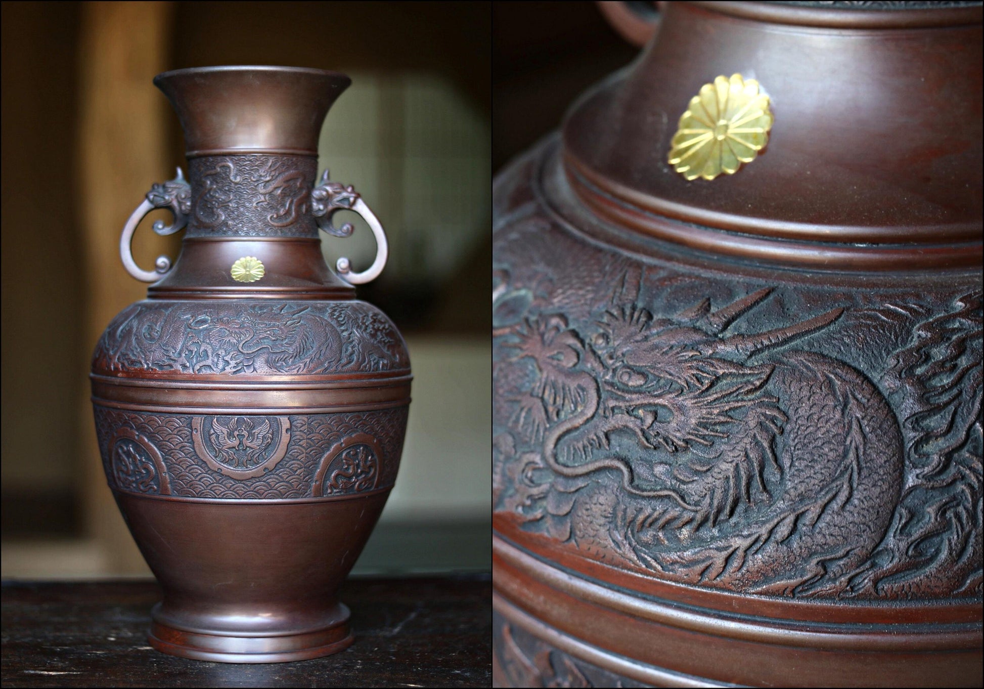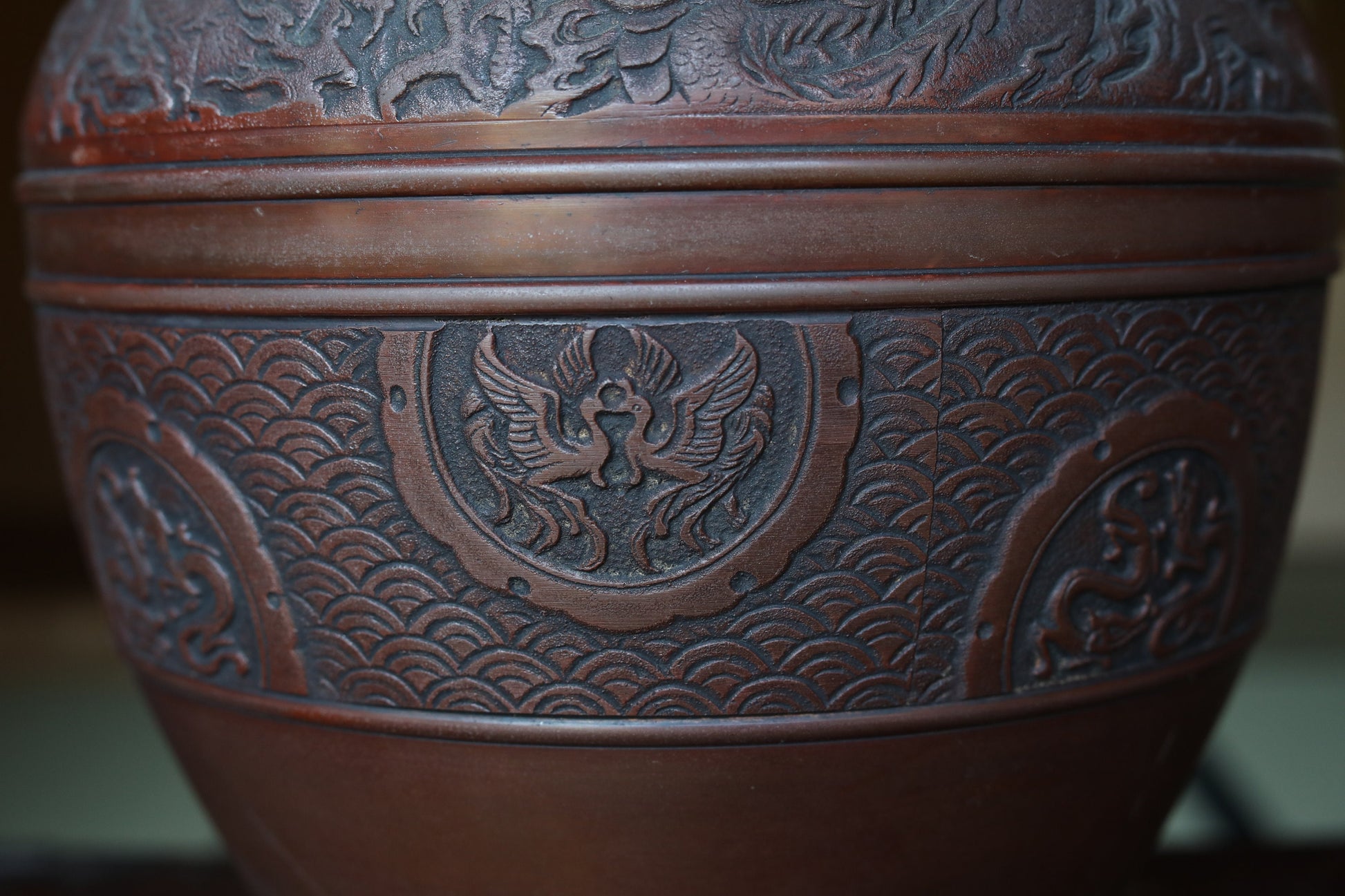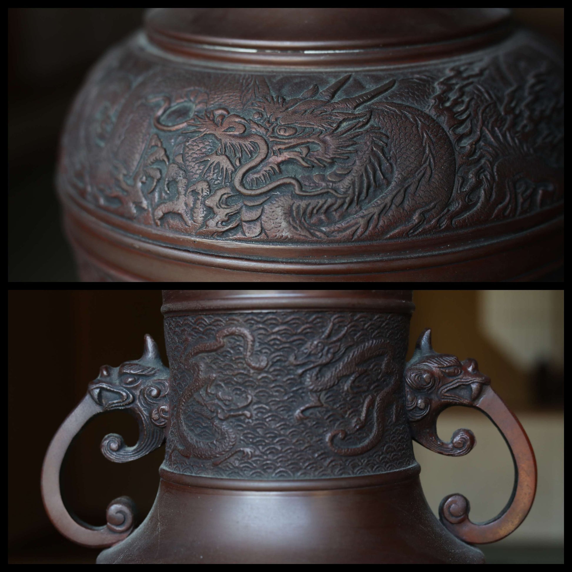 Japanese vintage 1950s bronze vase with relieves of dragons and phoenix, lions handle, Takaoka bronze,Kanji signature H15.4xW7.9in/H39×20cm