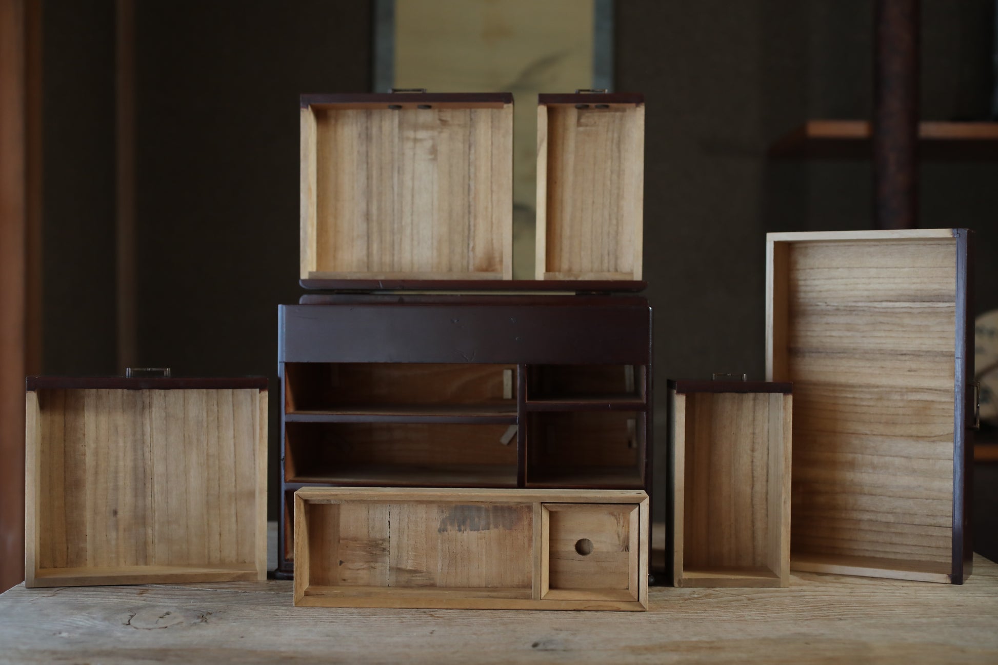 This small chest features numerous small drawers, providing excellent storage capacity. Its surface is coated in a dark reddish-brown lacquer, which has deepened in color over time. The second photo most accurately represents the color. It has five drawers, with one storage box on the top surface and another drawer box behind it.
