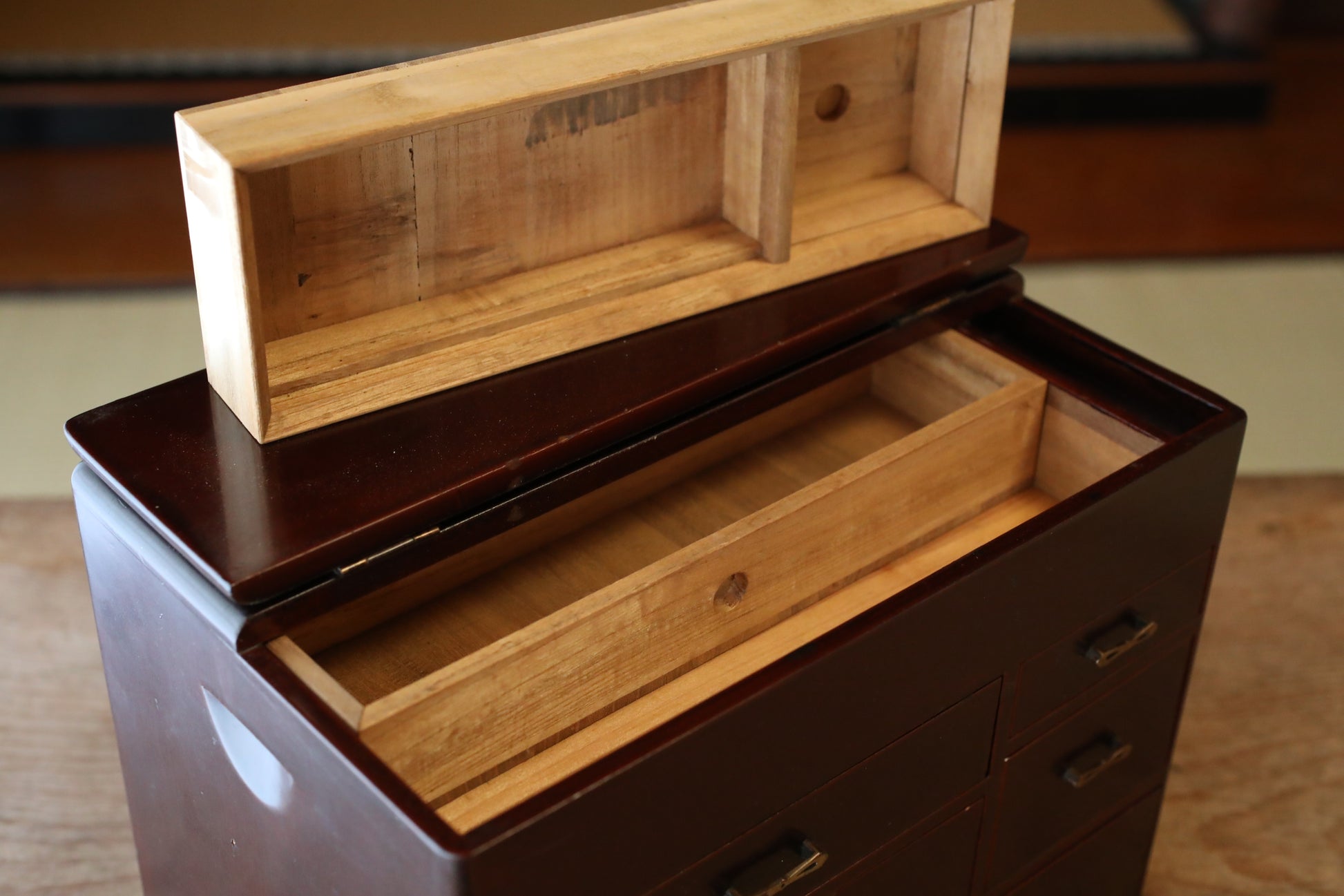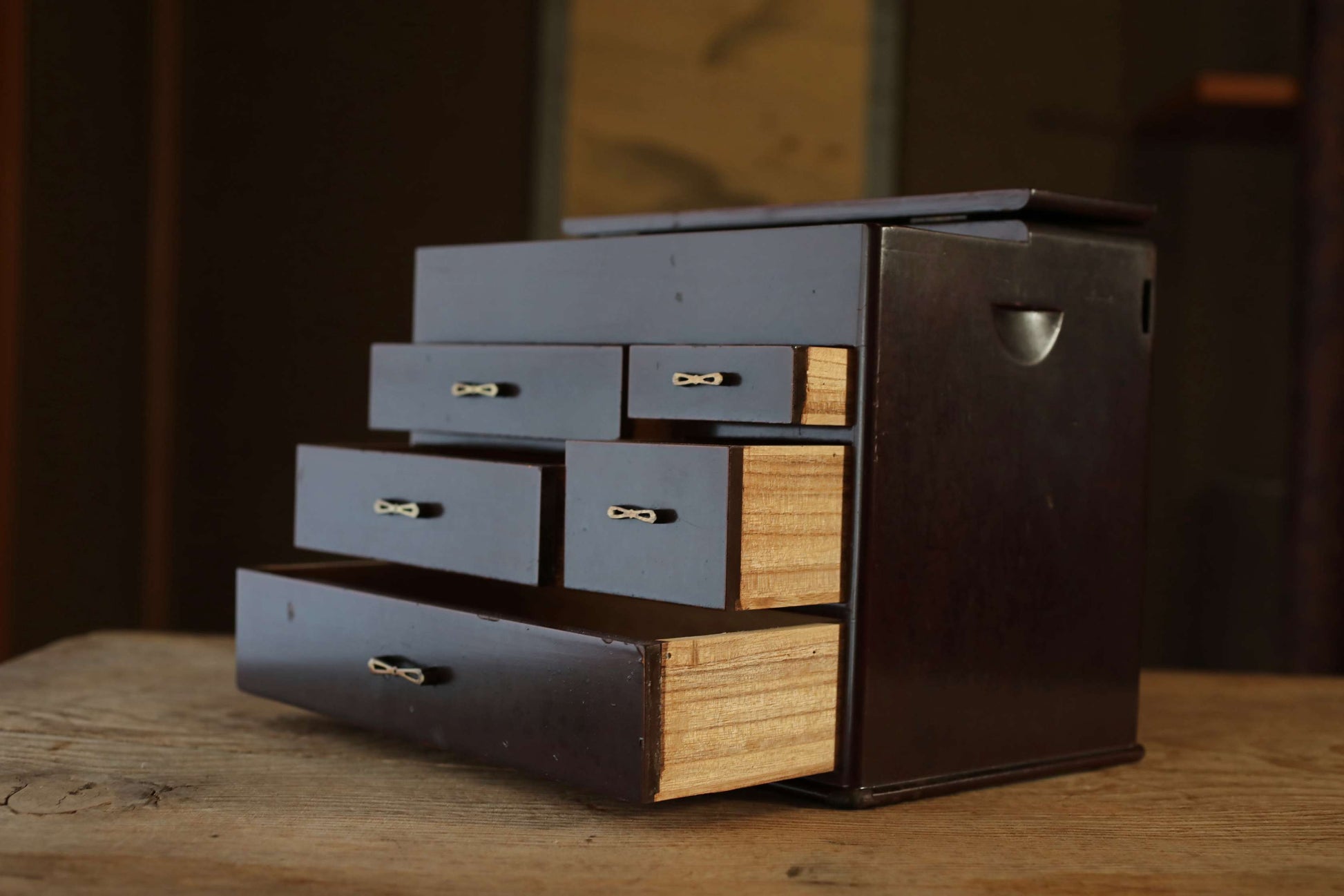 Japanese vintage 1960s furniture Small lacquer Chest of drawers "tansu" dark Reddish brown for sawing drawer H9.8×W12.8in /H25×32.6cm