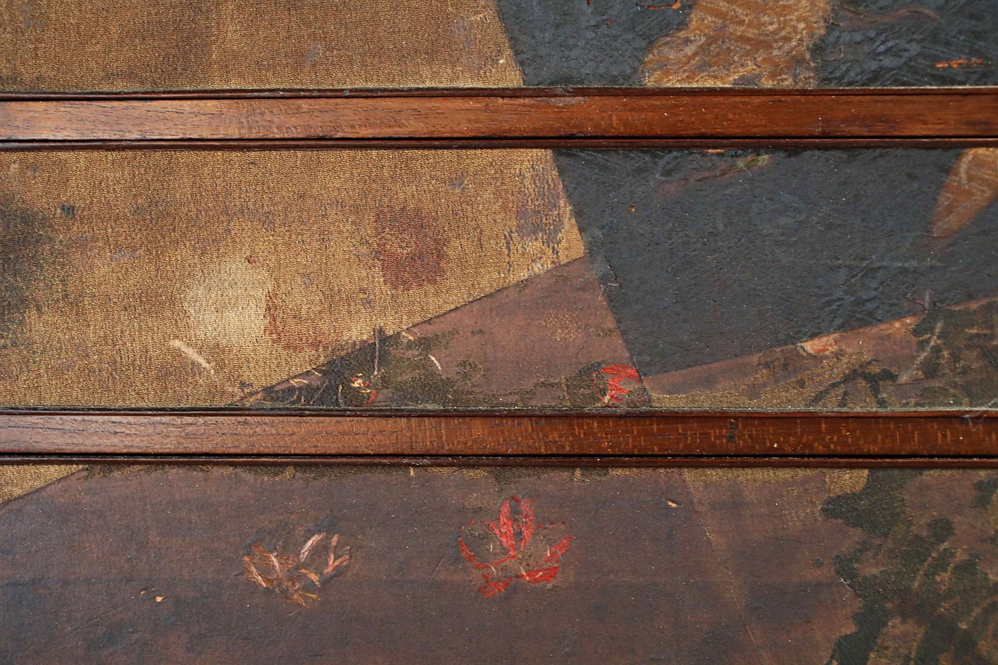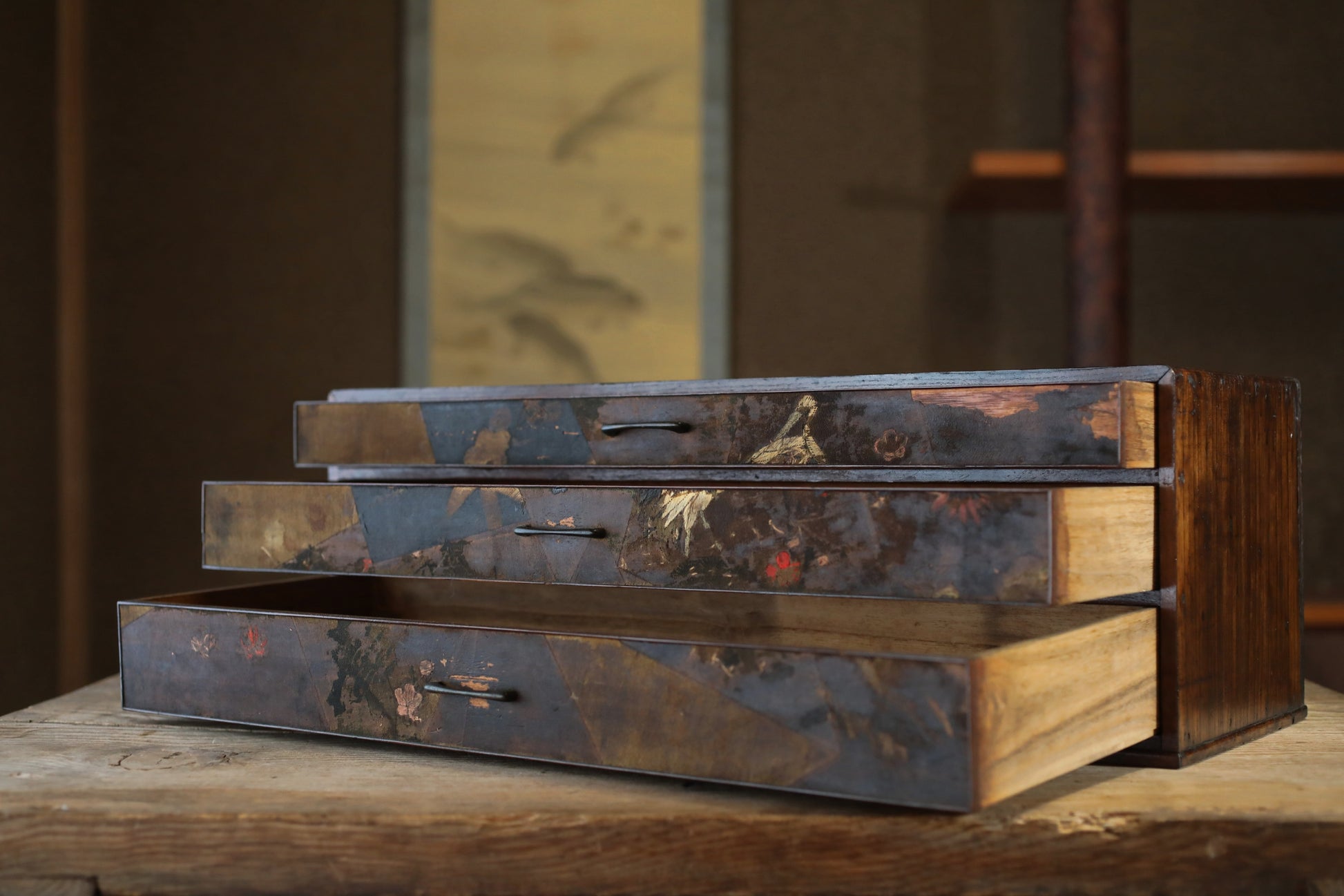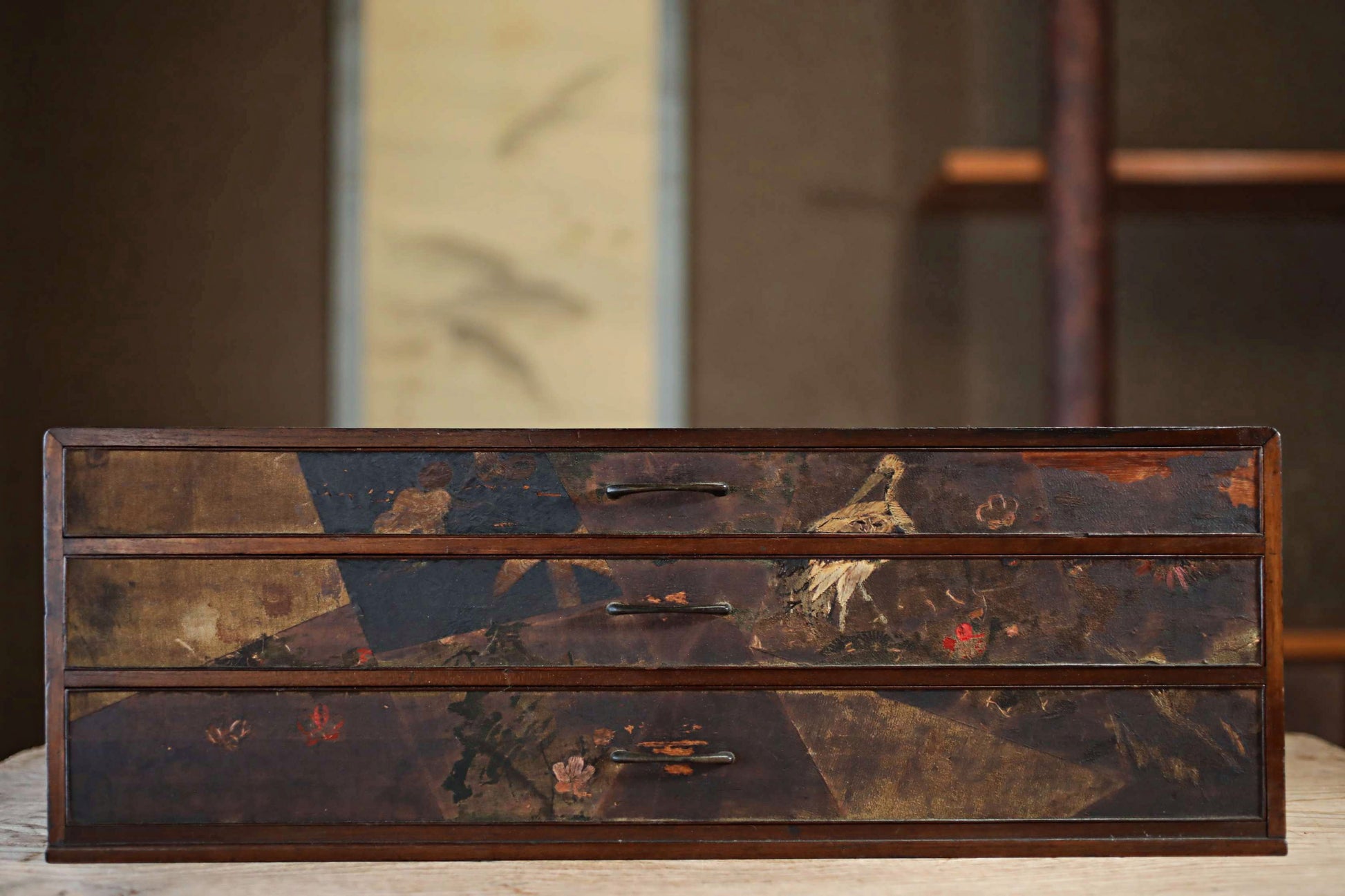 There are three drawers. The standout feature is the exceptionally old silk pattern adorning the front, along with its distinctive ambiance. The color has darkened and deepened over time, giving it a remarkably stylish look. The design resembles an abstract painting, yet upon closer inspection, you can discern motifs resembling a single crane or flowers. Remnants of embroidery remain in some areas, adding even richer texture. It possesses an intriguing charm that transcends mere Japanese or Asian aesthetics.