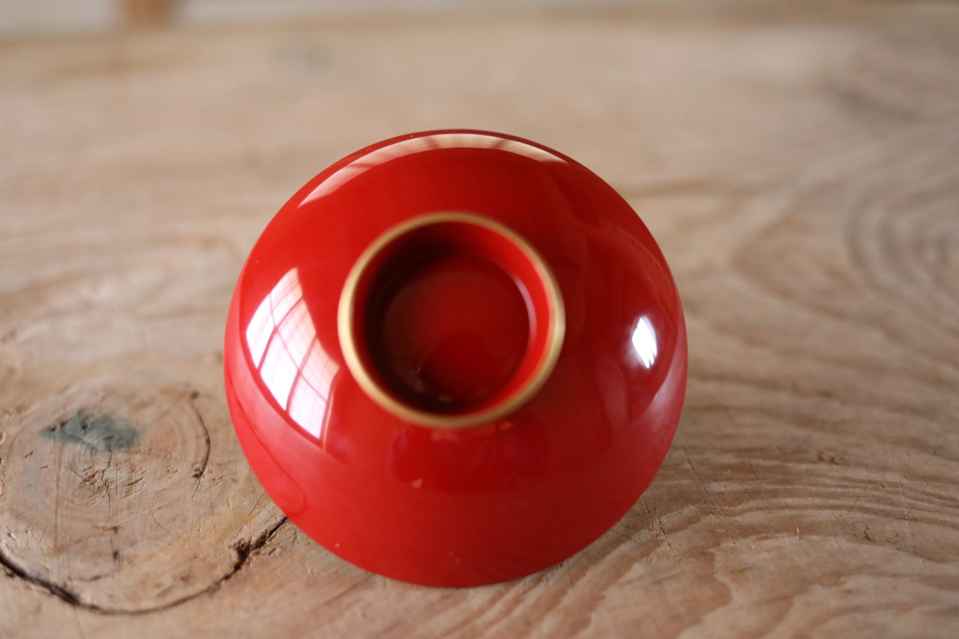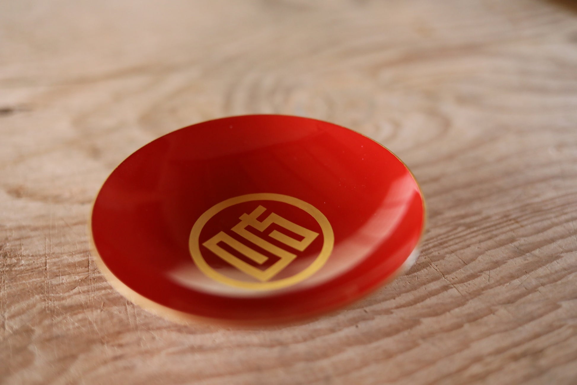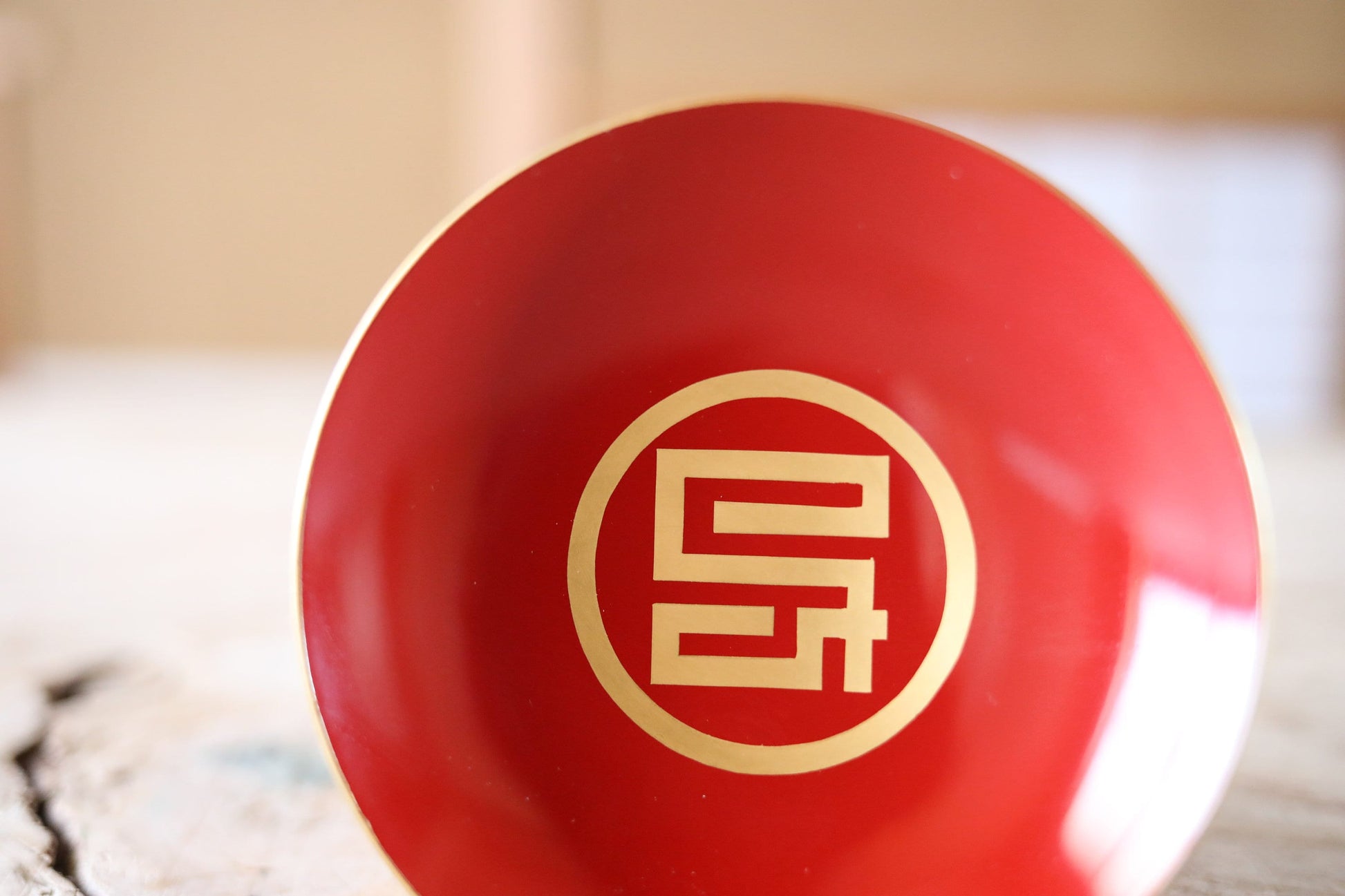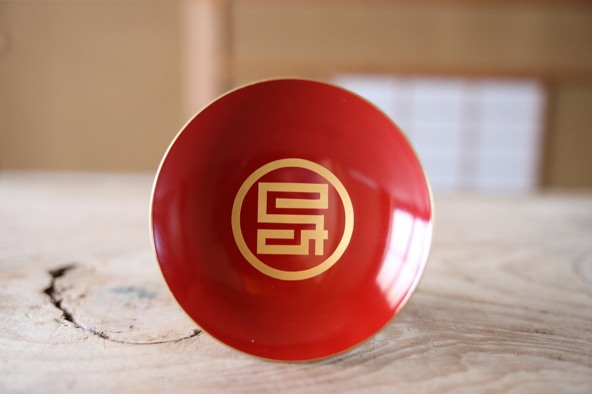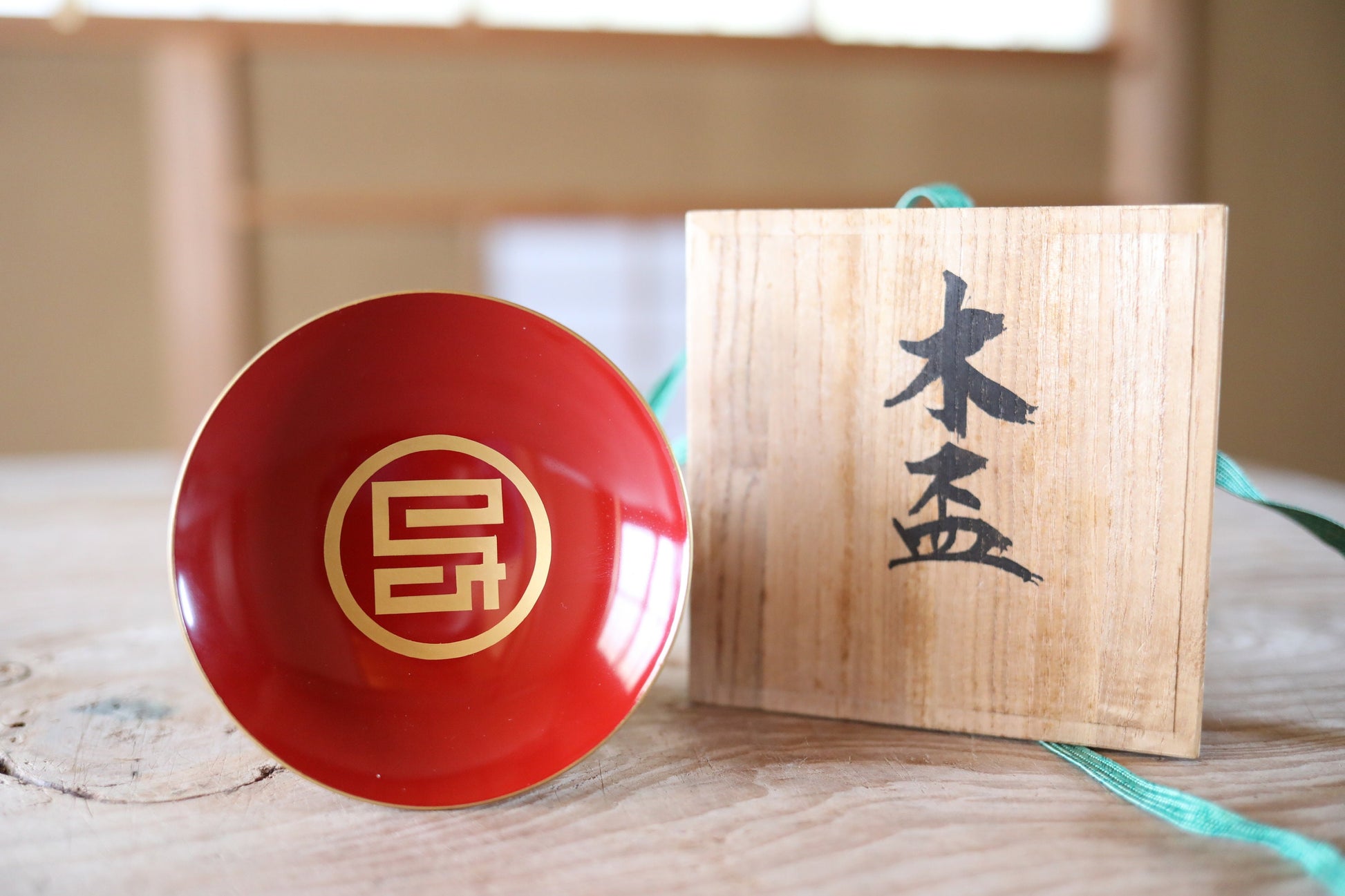 Japanese vintage 1980s Red lacquer wooden sake cup with SAMURAI family crest, wooden urushi tableware SAKAZUKI 4.2in/10.7cm
