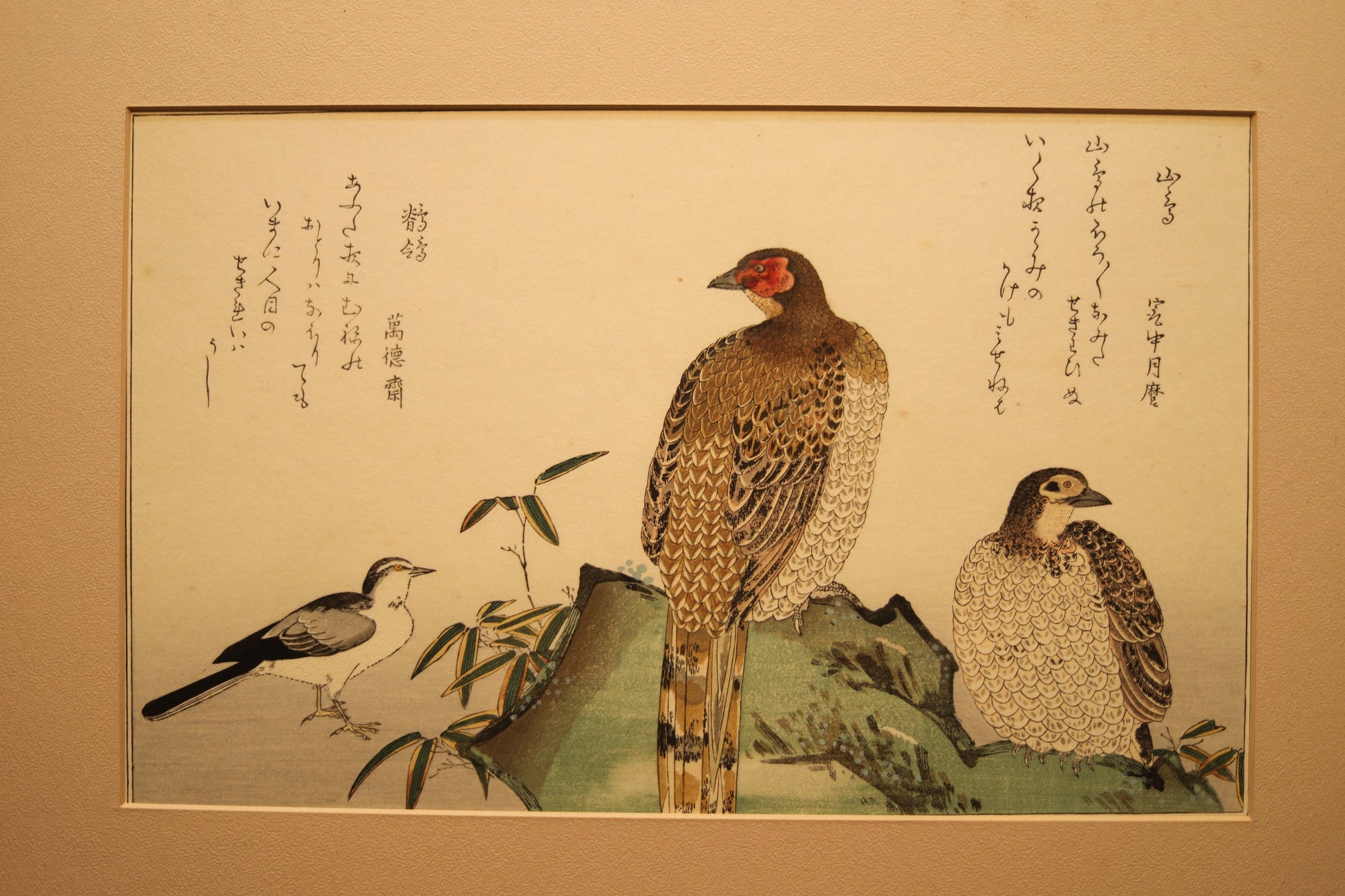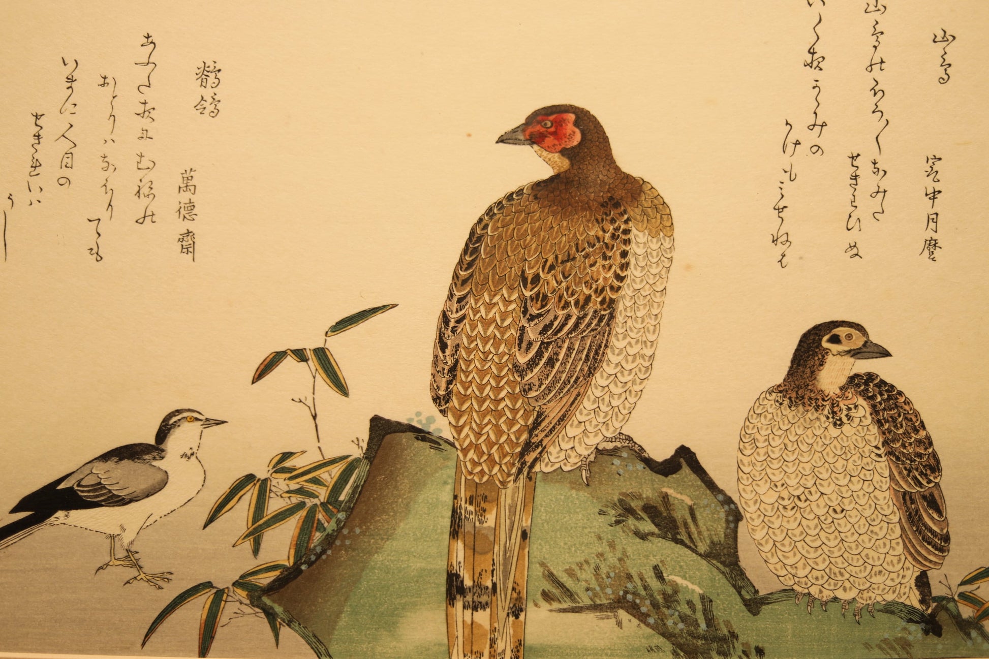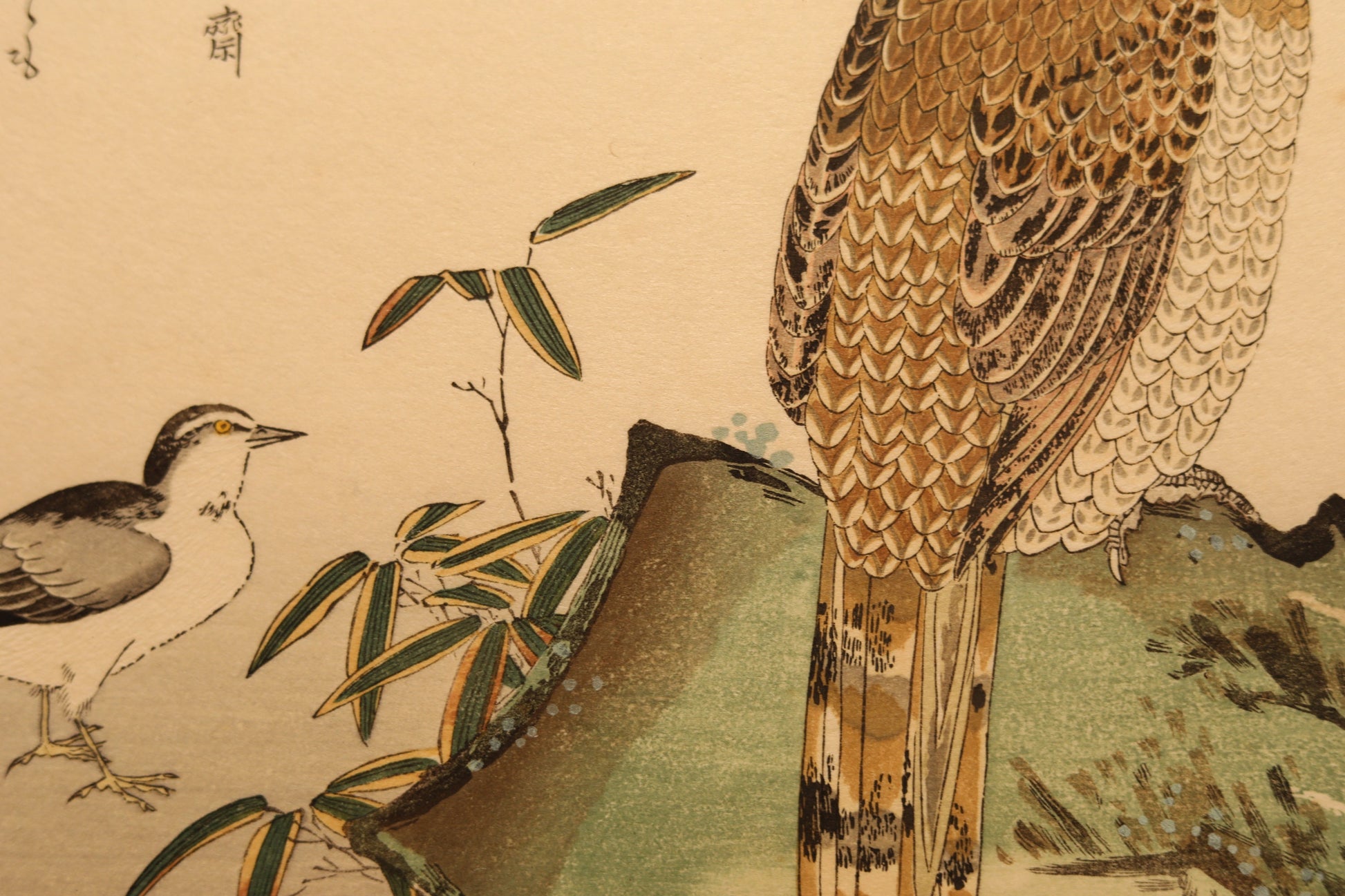 On the top are Japanese poems written by the artist about the Wagtail and Copper Pheasant, respectively.