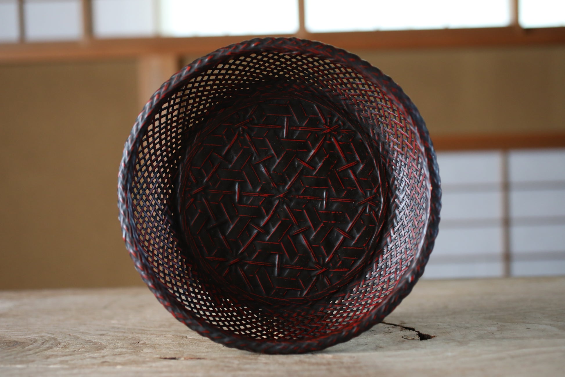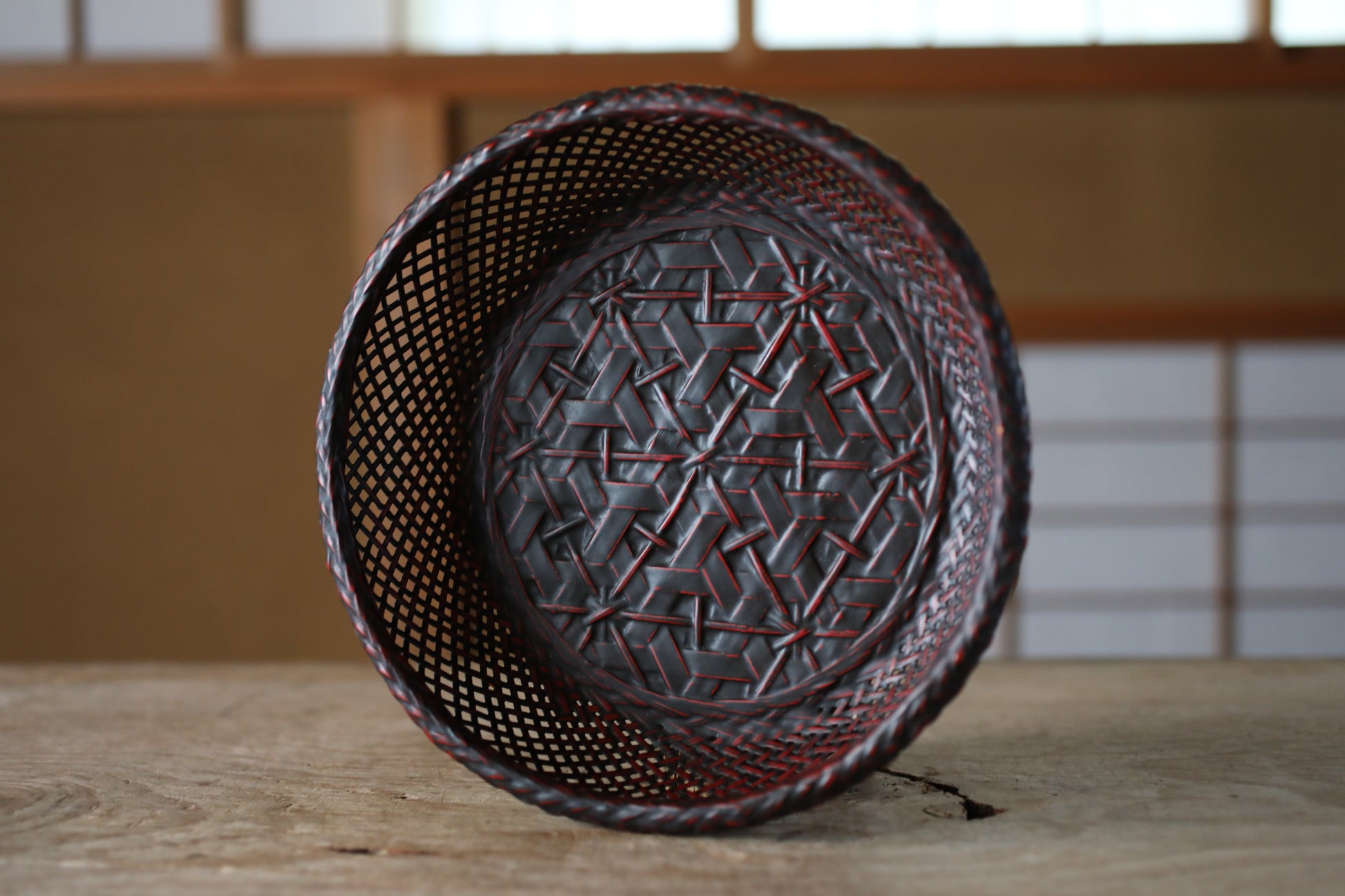 Japanese vintage beautiful bamboo woven lacquered basket for Tea ceremony, shallow basket H2.2xW9.5in/H5.5xW24.2cm