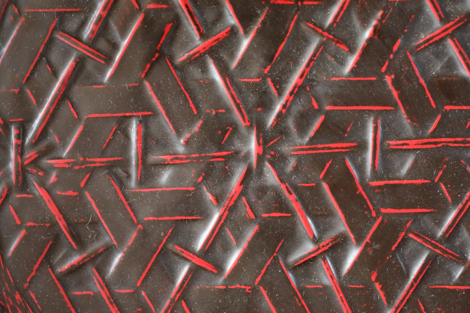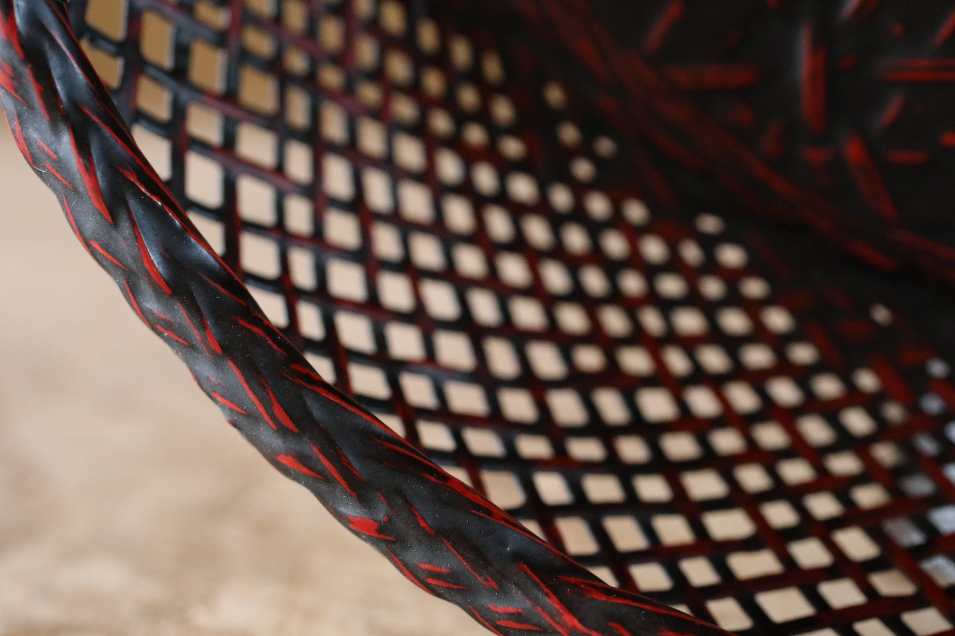 After this, the lacquer is applied and polished repeatedly to create a beautiful luster. The signature mottled pattern is a result of this polishing process. It's created by sanding the lacquered bamboo basket, which partially removes the lacquer along the weave and reveals the base color underneath. Over-polishing can strip away the base color, making it difficult to apply the right amount of pressure evenly, which requires advanced technique.