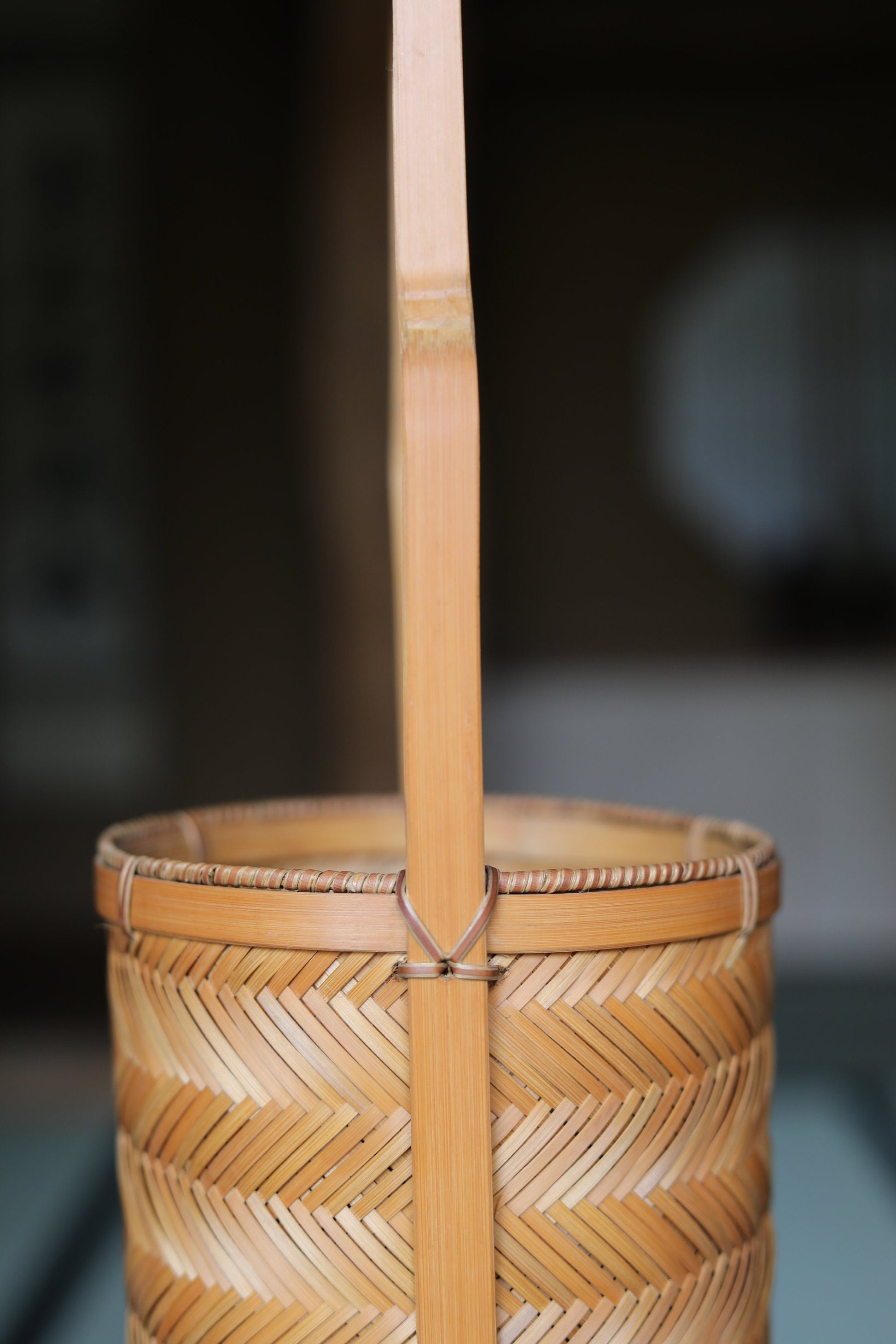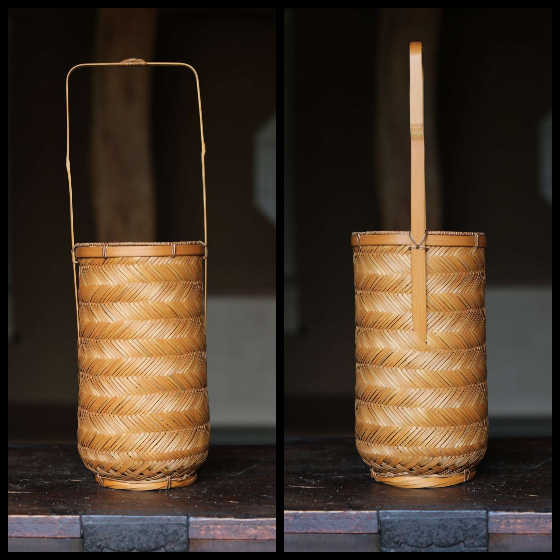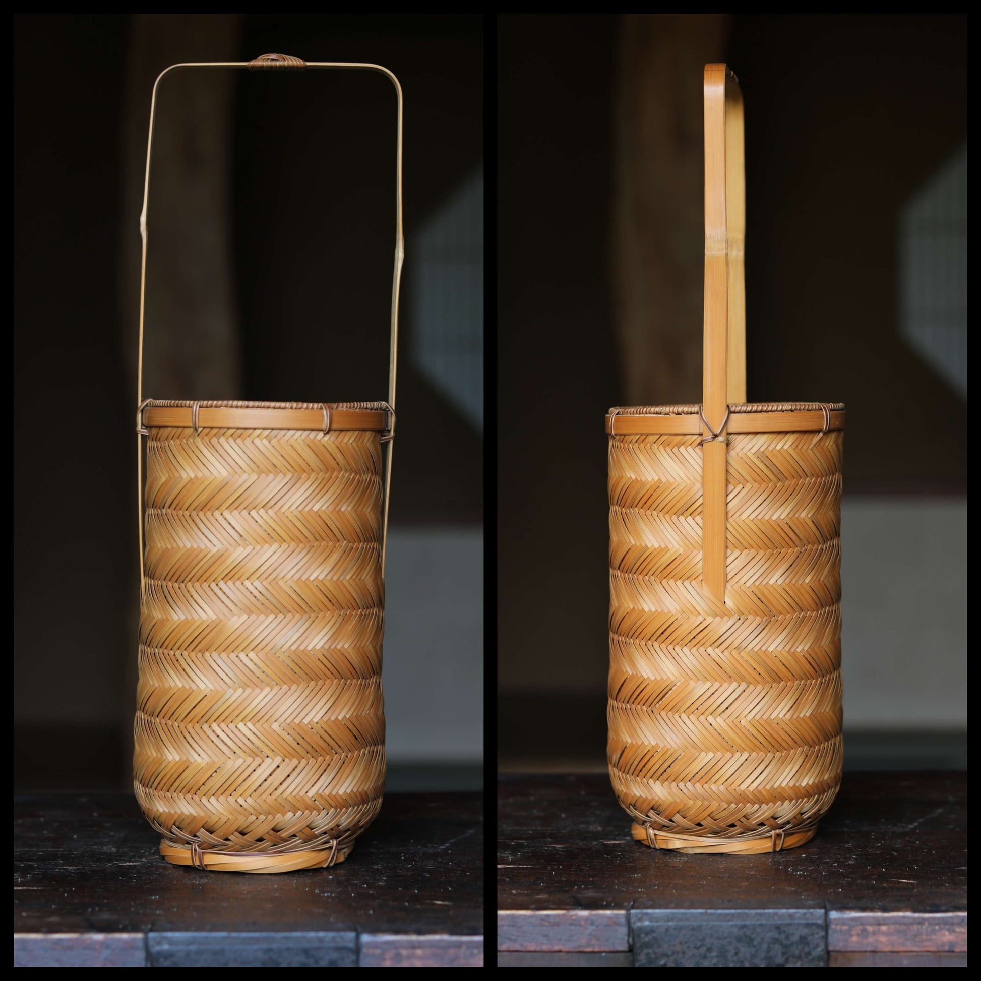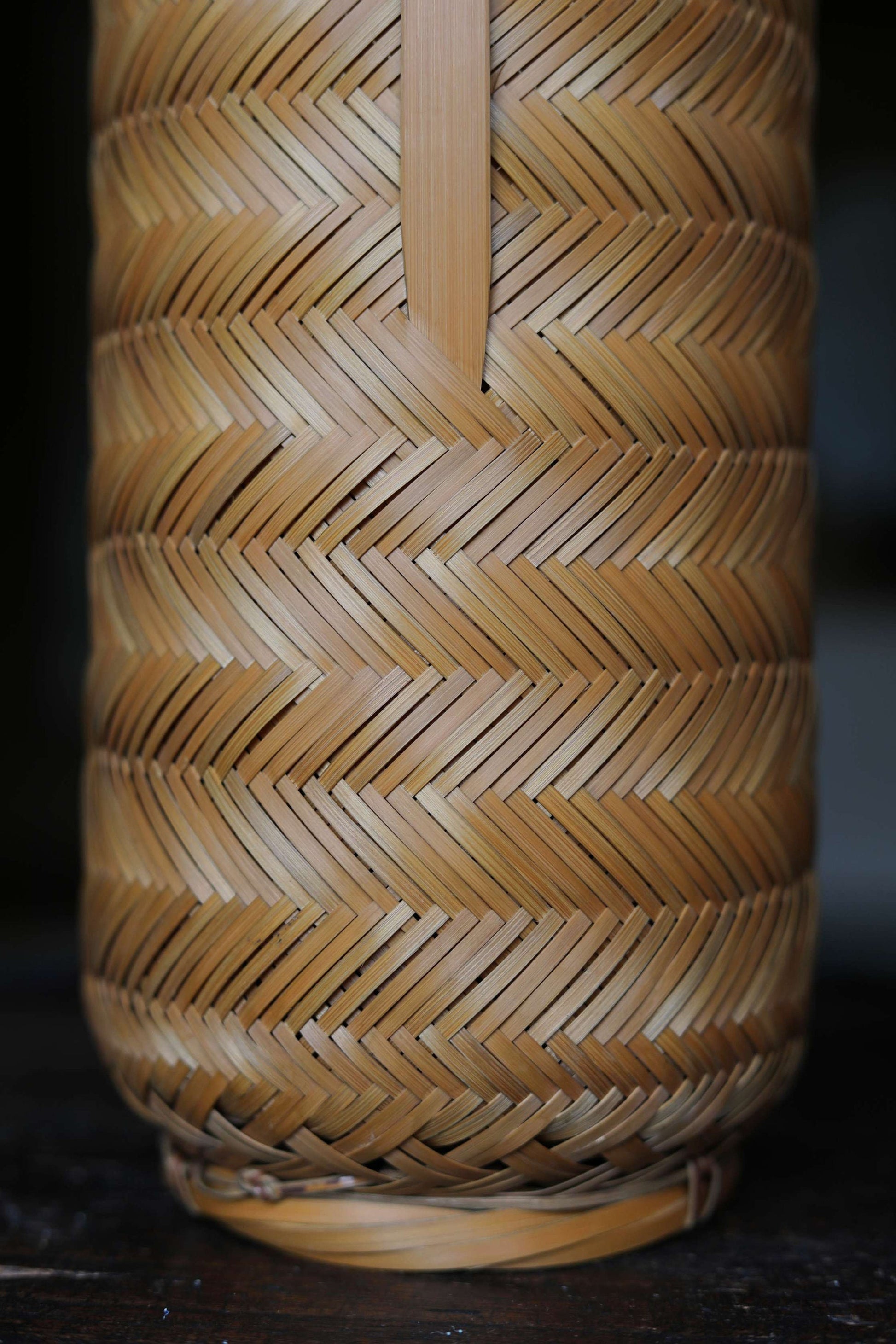 Japanese vintage beautiful bamboo woven vase with sign, for tea ceremony, finely detailed H17.1×5.5in/H43.5×14cm