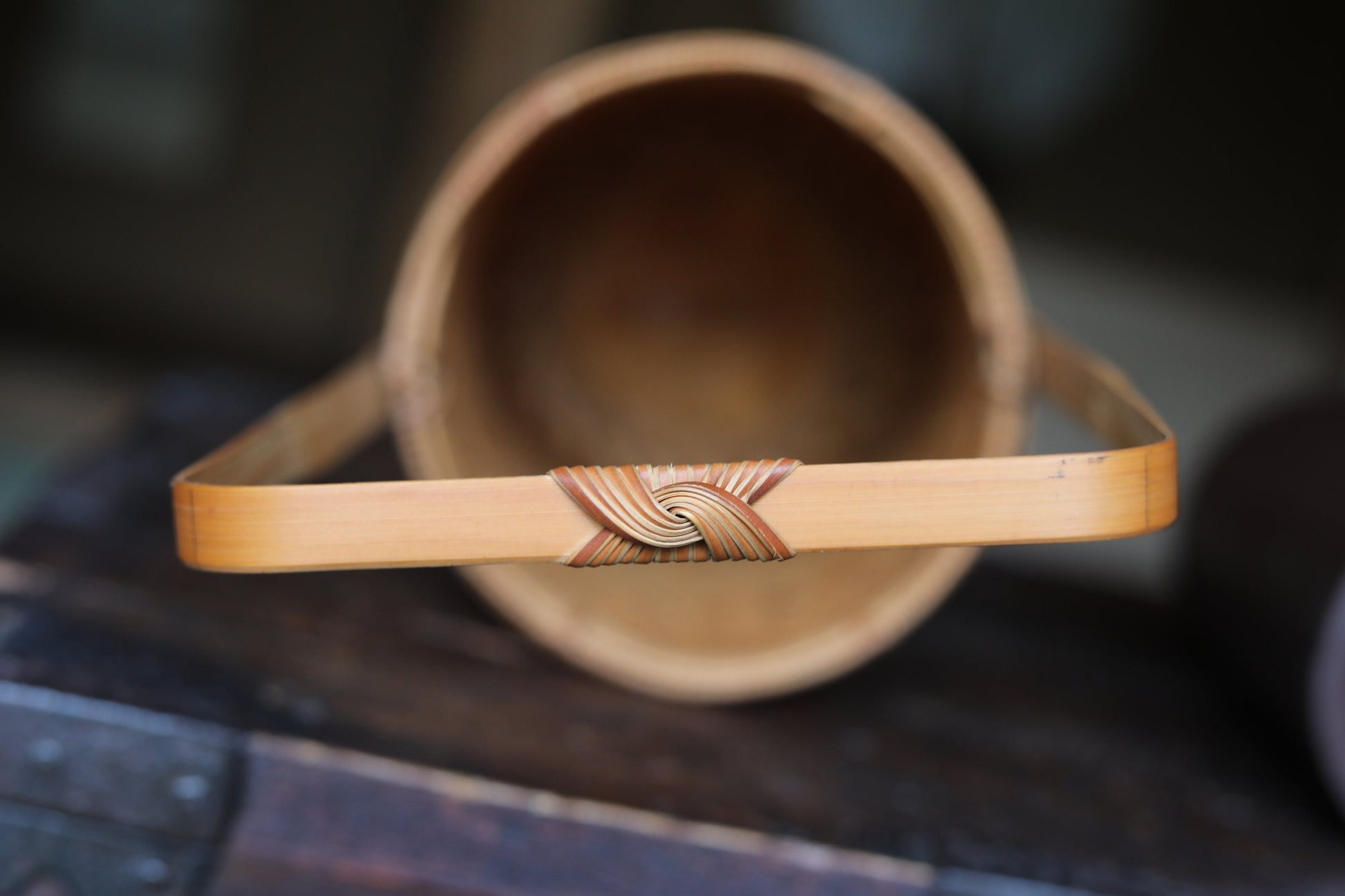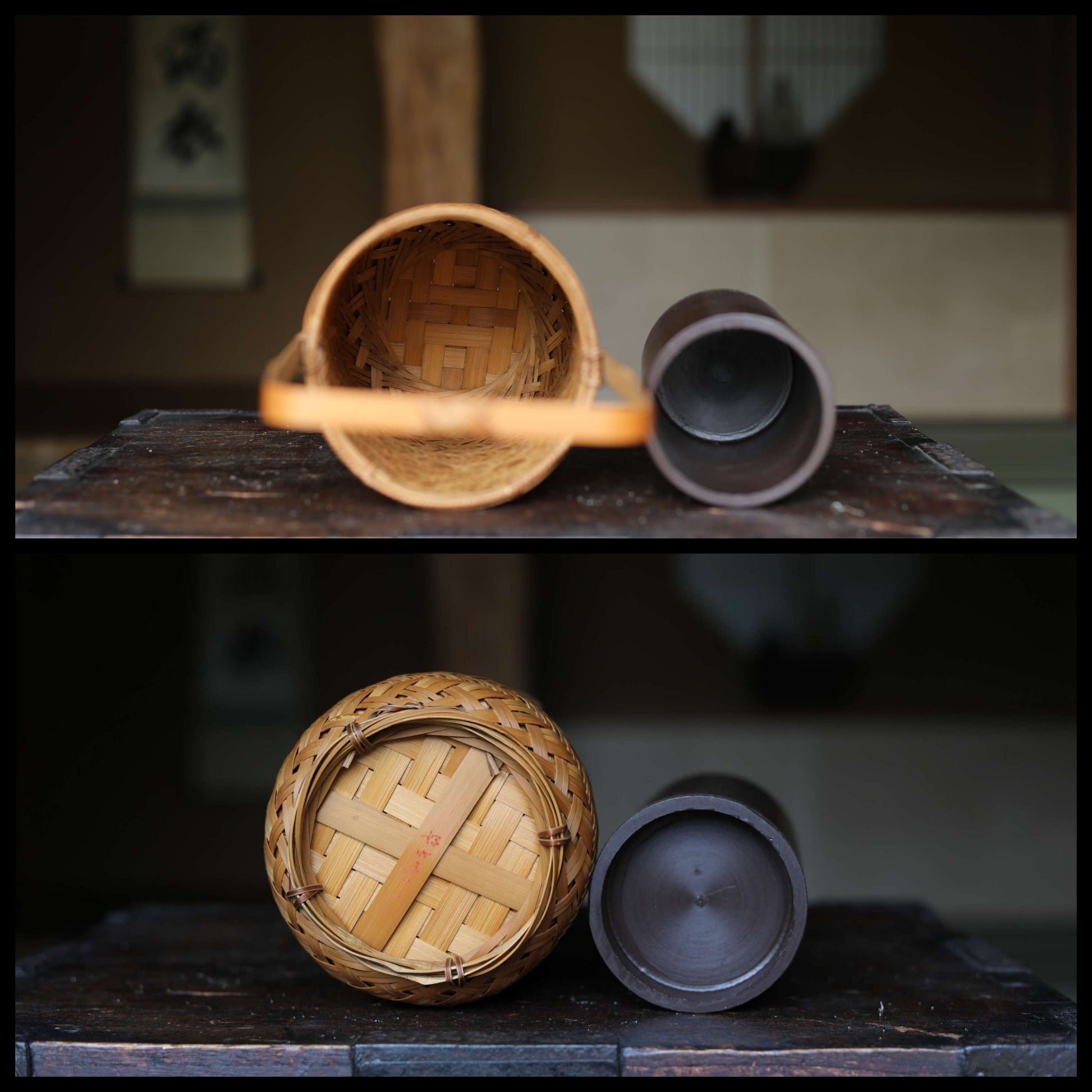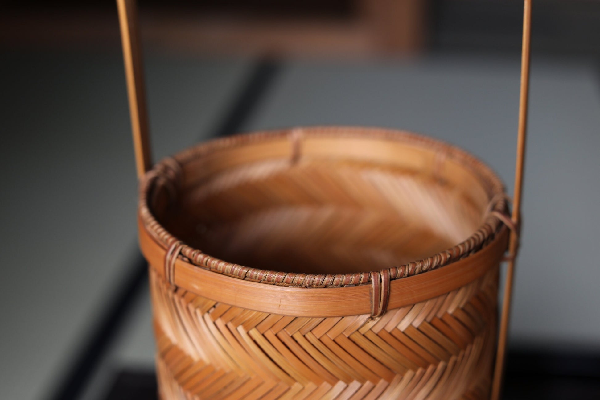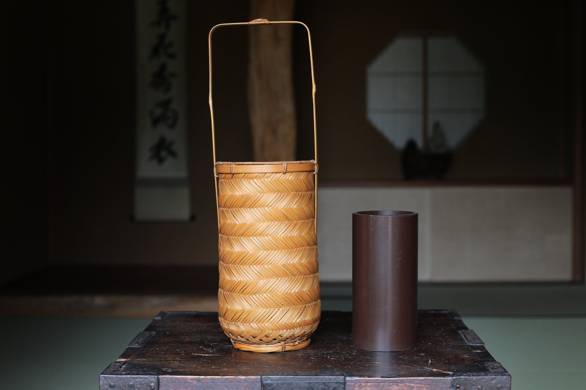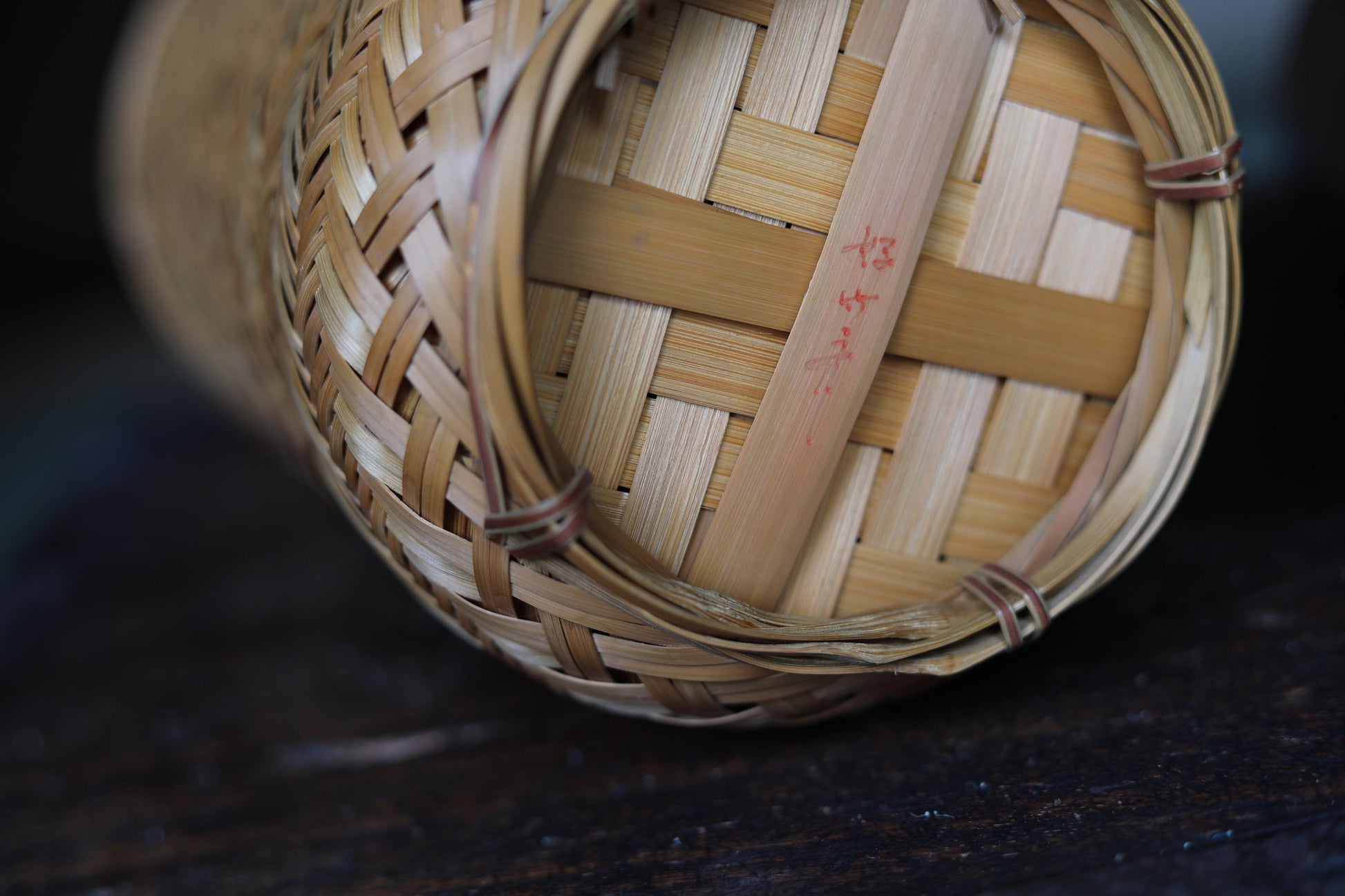 Japanese vintage beautiful bamboo woven vase with sign, for tea ceremony, finely detailed H17.1×5.5in/H43.5×14cm