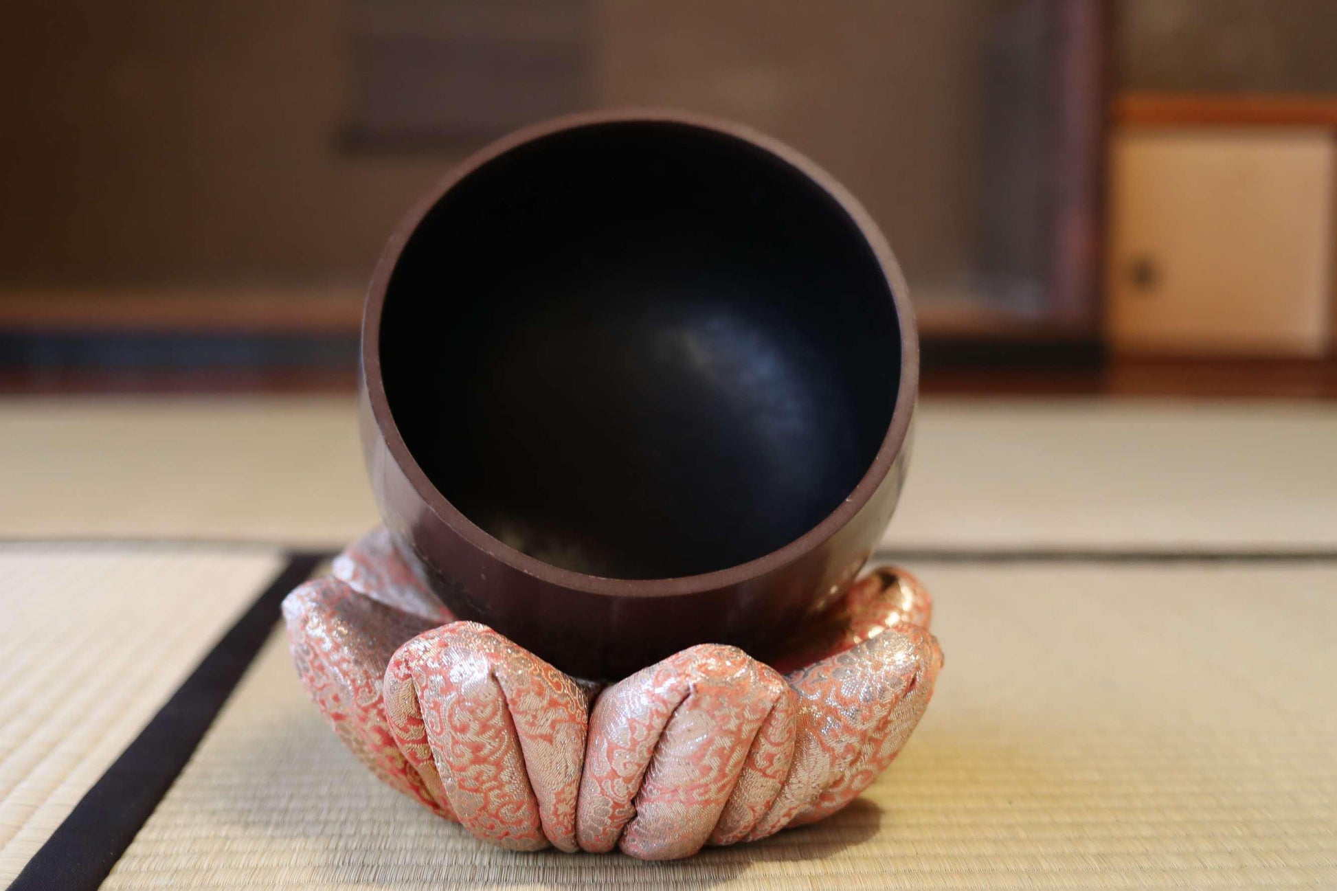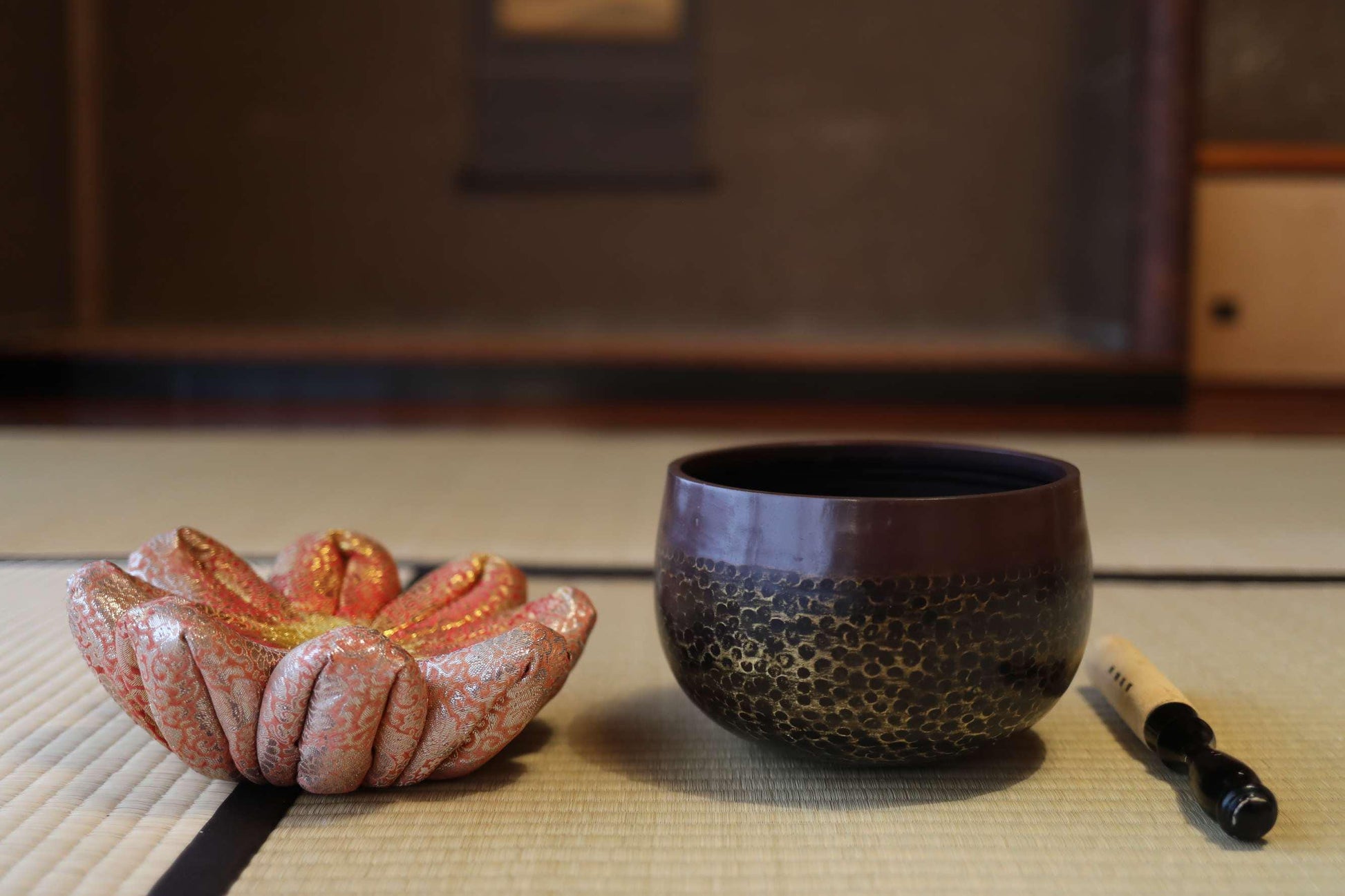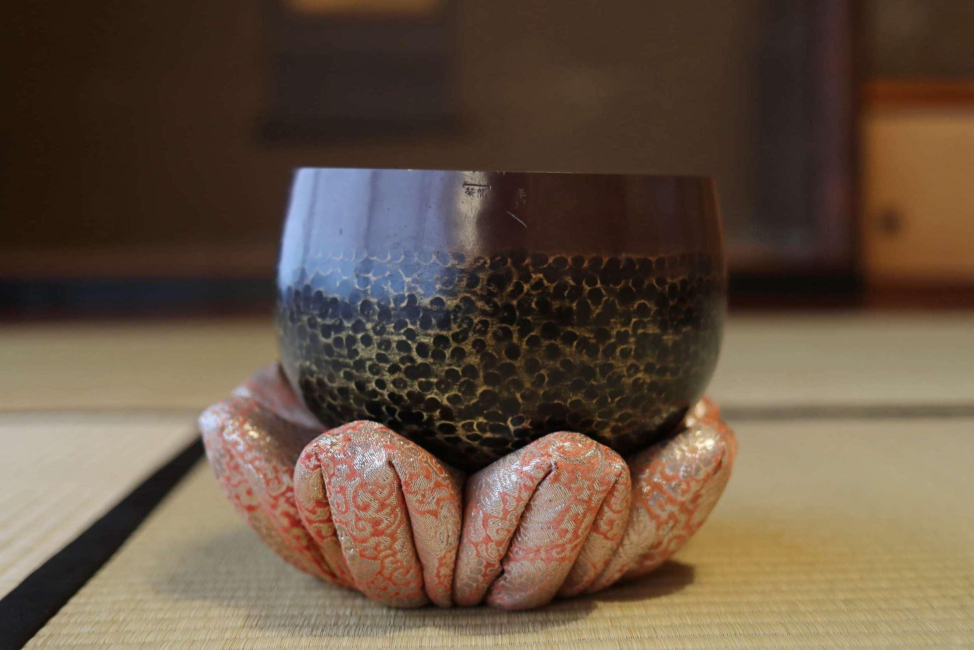 Japanese vintage Bronze buddhist chanting bell with Kanji sign 栄龍, Singing Bowl, ORIN Buddhist temple with silk cushion stick 7.4in/18.7cm