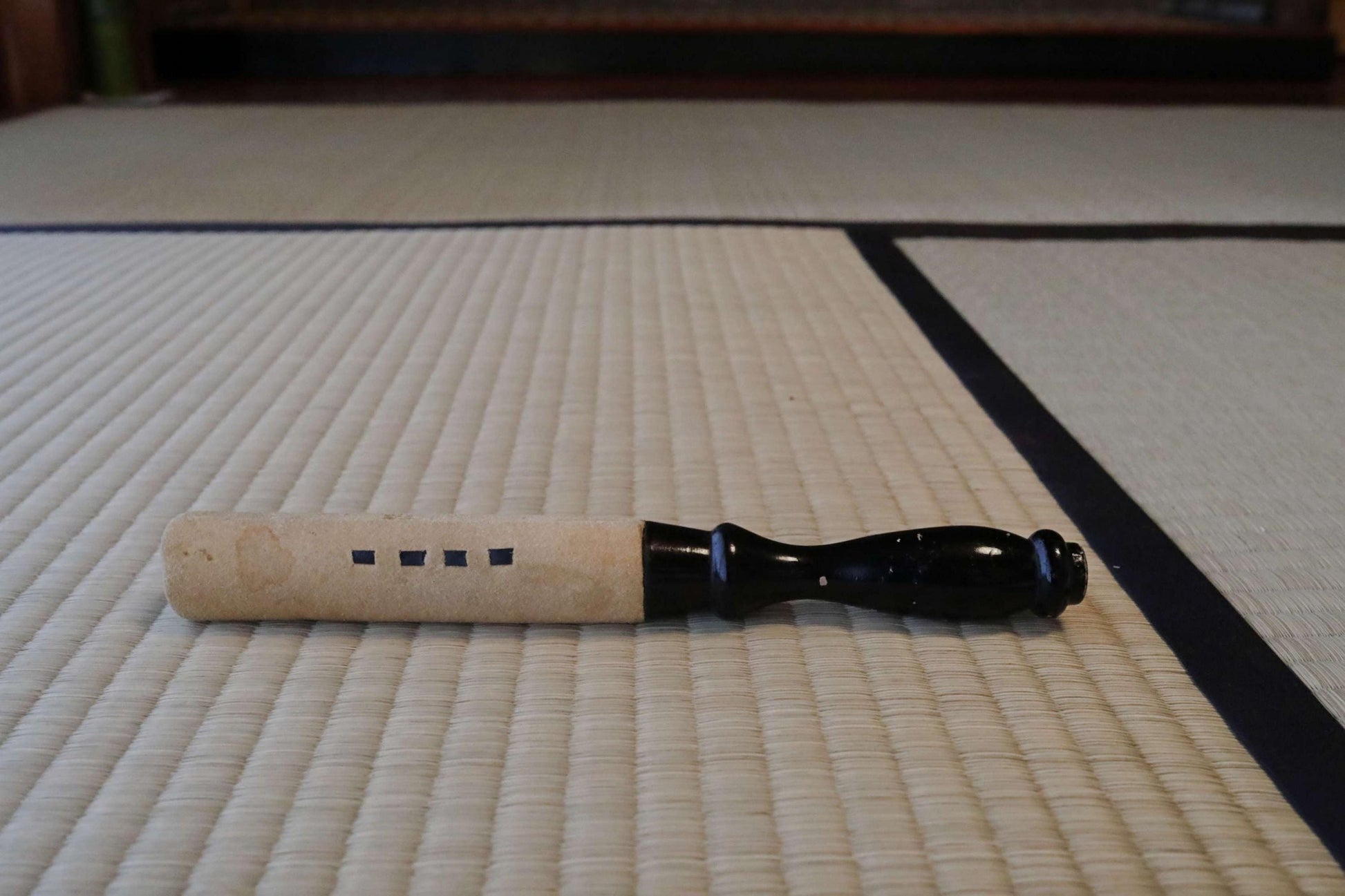 The set also includes a silk cushion and sticks, ready to use. The sticks are used wood, lacquer, and leather. The cushions are in good condition and have changed color over time, but they are beautiful and cool. There is a slight leaning habit.