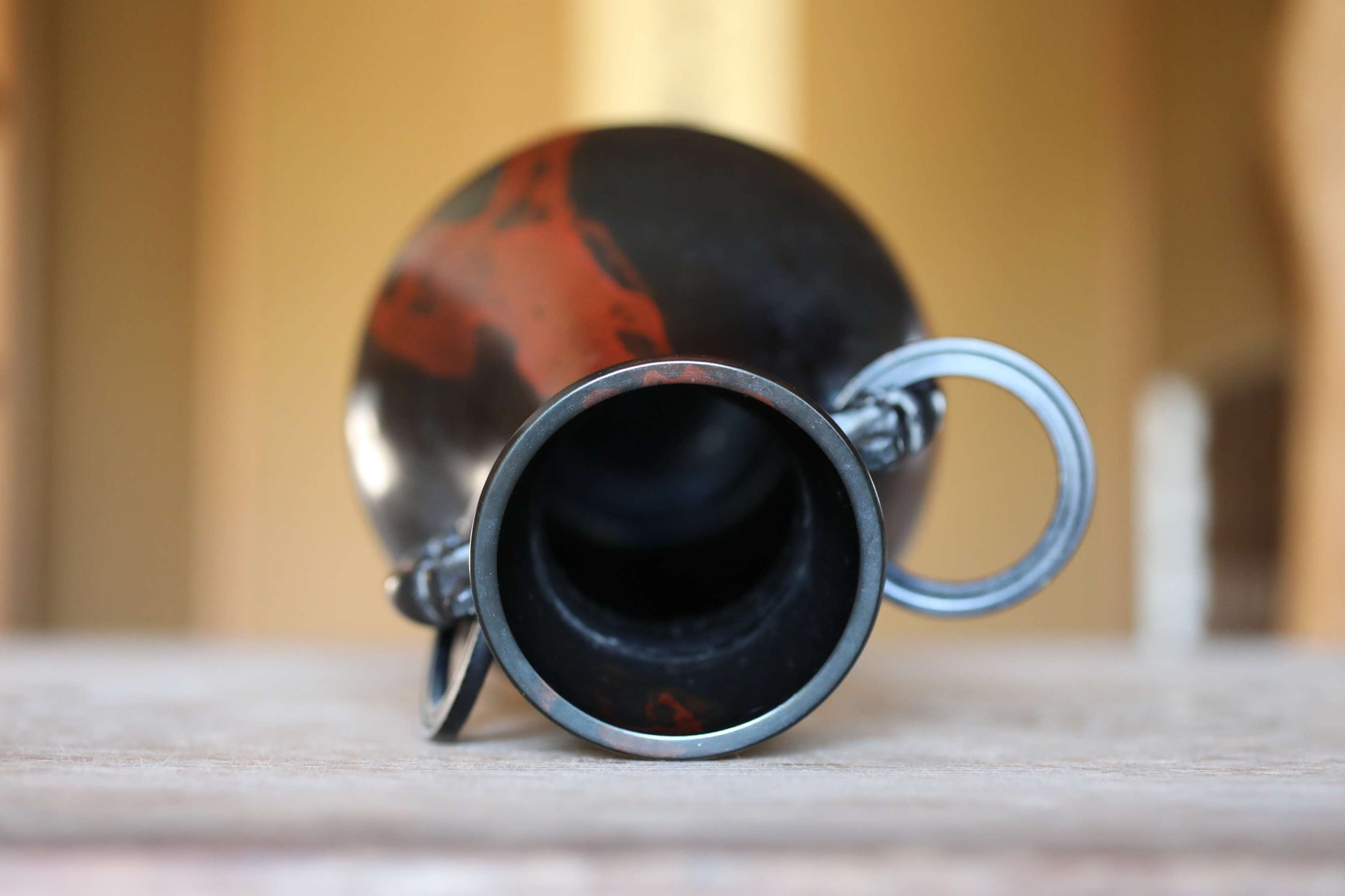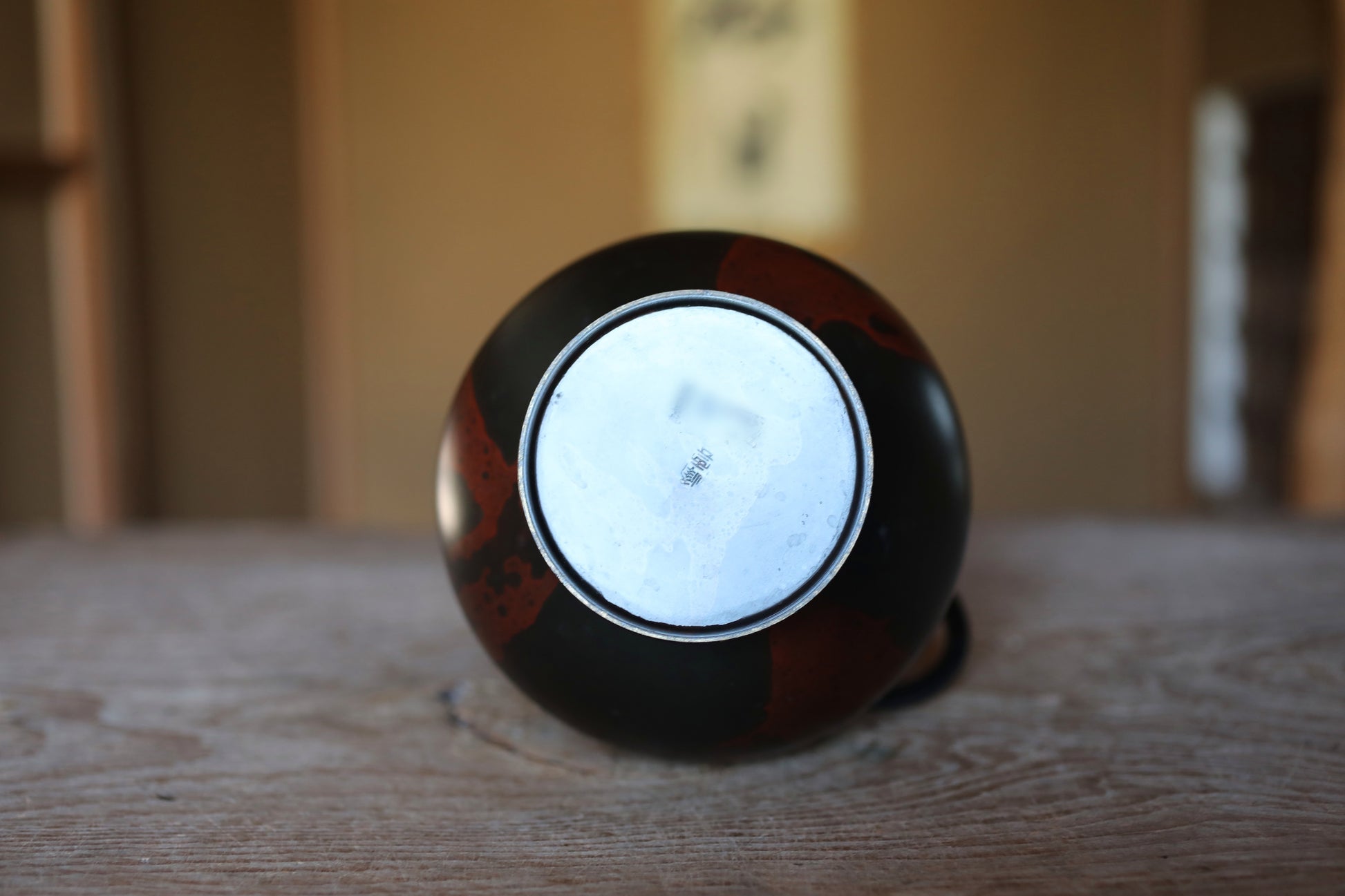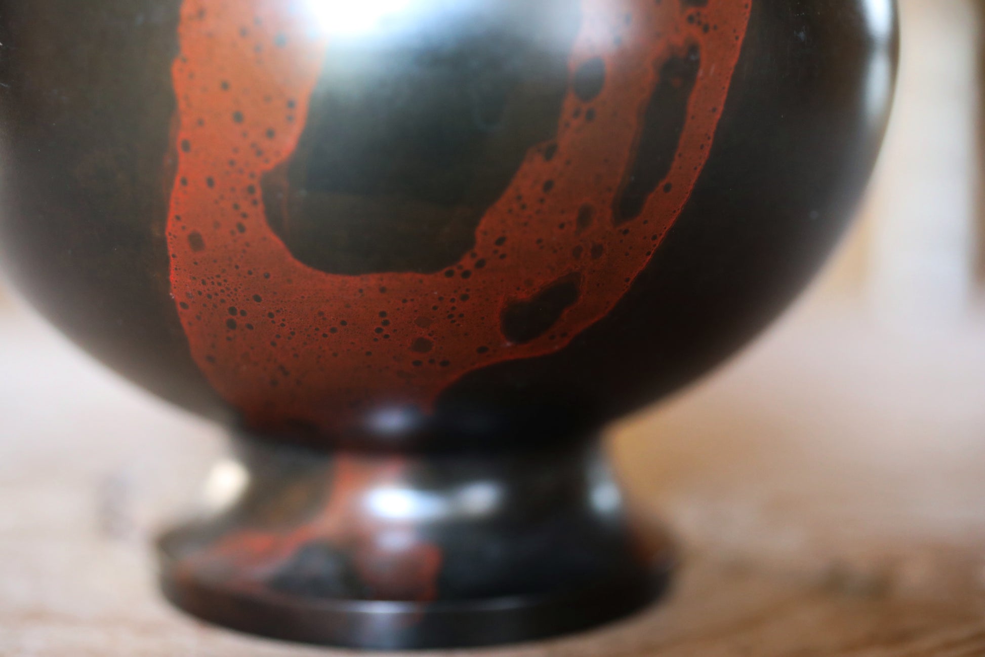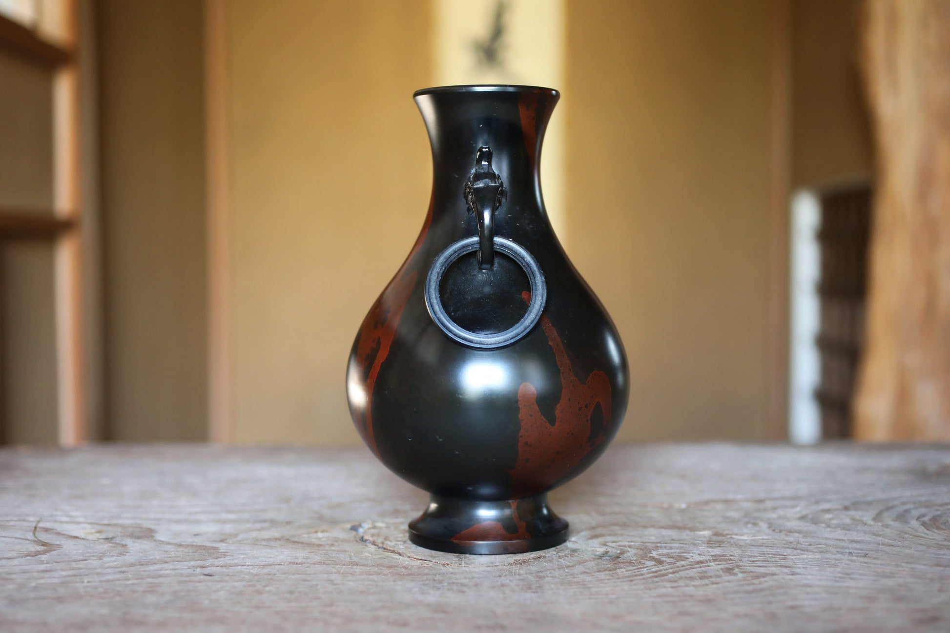 FINE! Japanese vintage 1960s Bronze flower vase black red marble with dragon Divine Beast ears with 峰雲 sign furniture H9.4in/H24cm