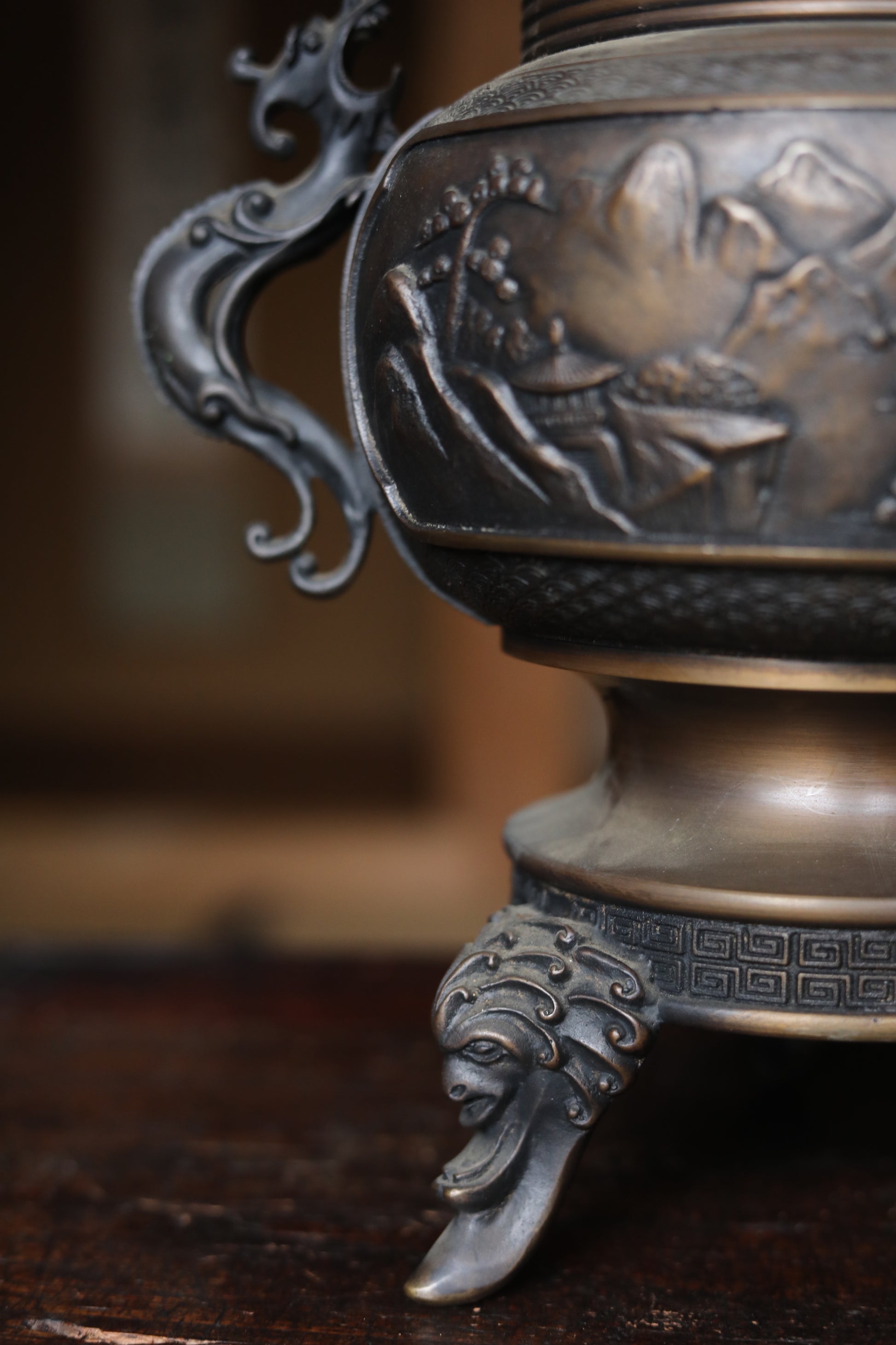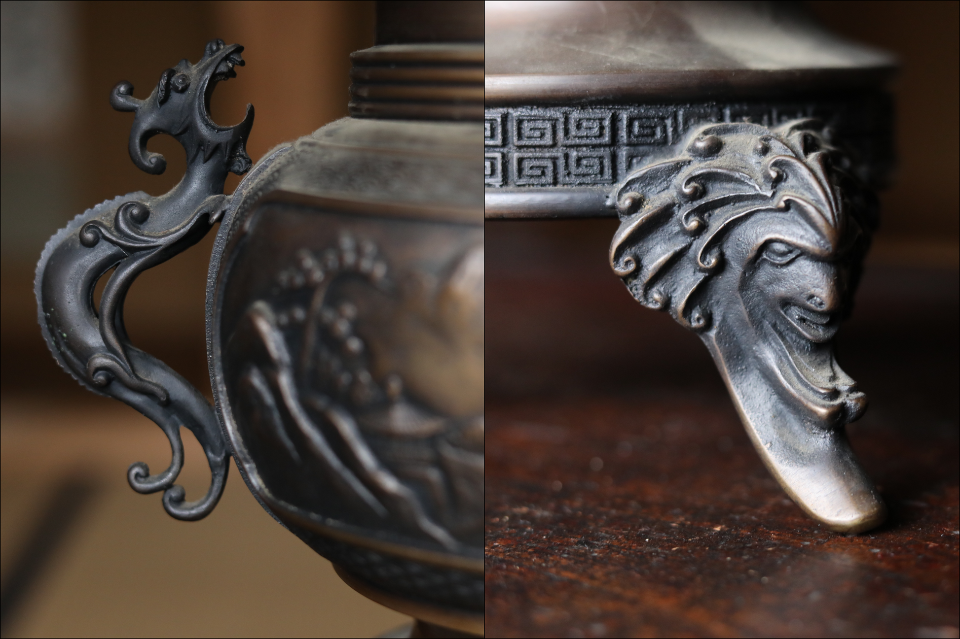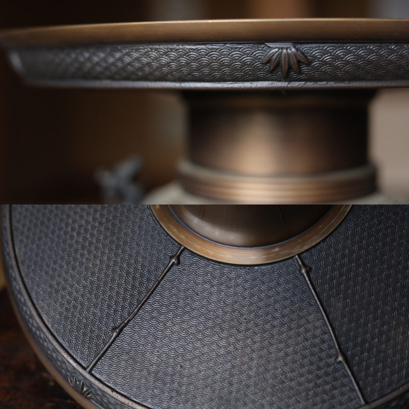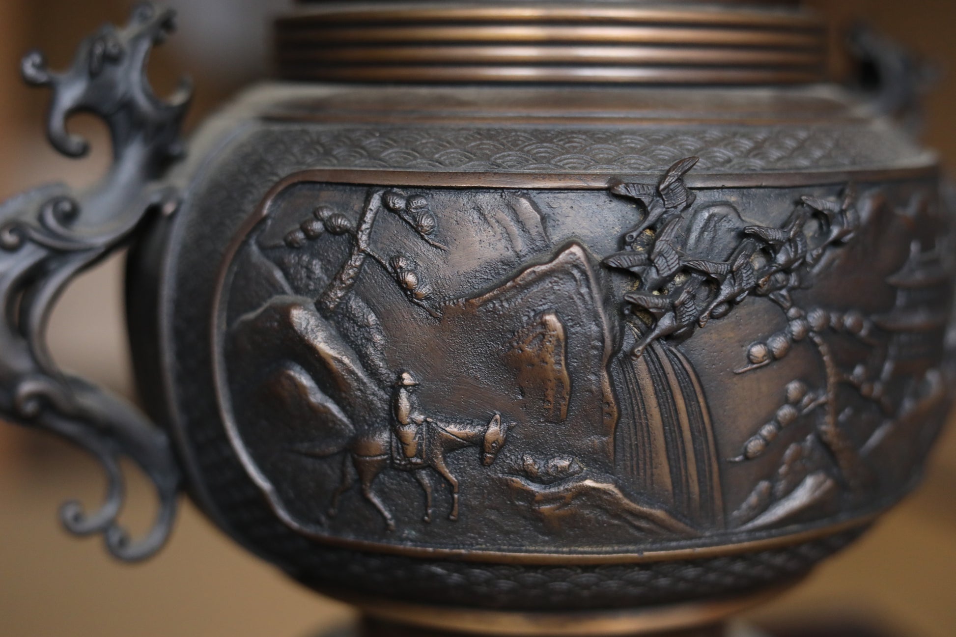 It is decorated throughout with very delicate and intricate reliefs. The plate-like part at the top is especially wonderful, with lavish relief on the back side. Both ears are decorated with dragon motifs, birds flying in the mountains in the center, and even a person riding a horse can be seen if you look closely.