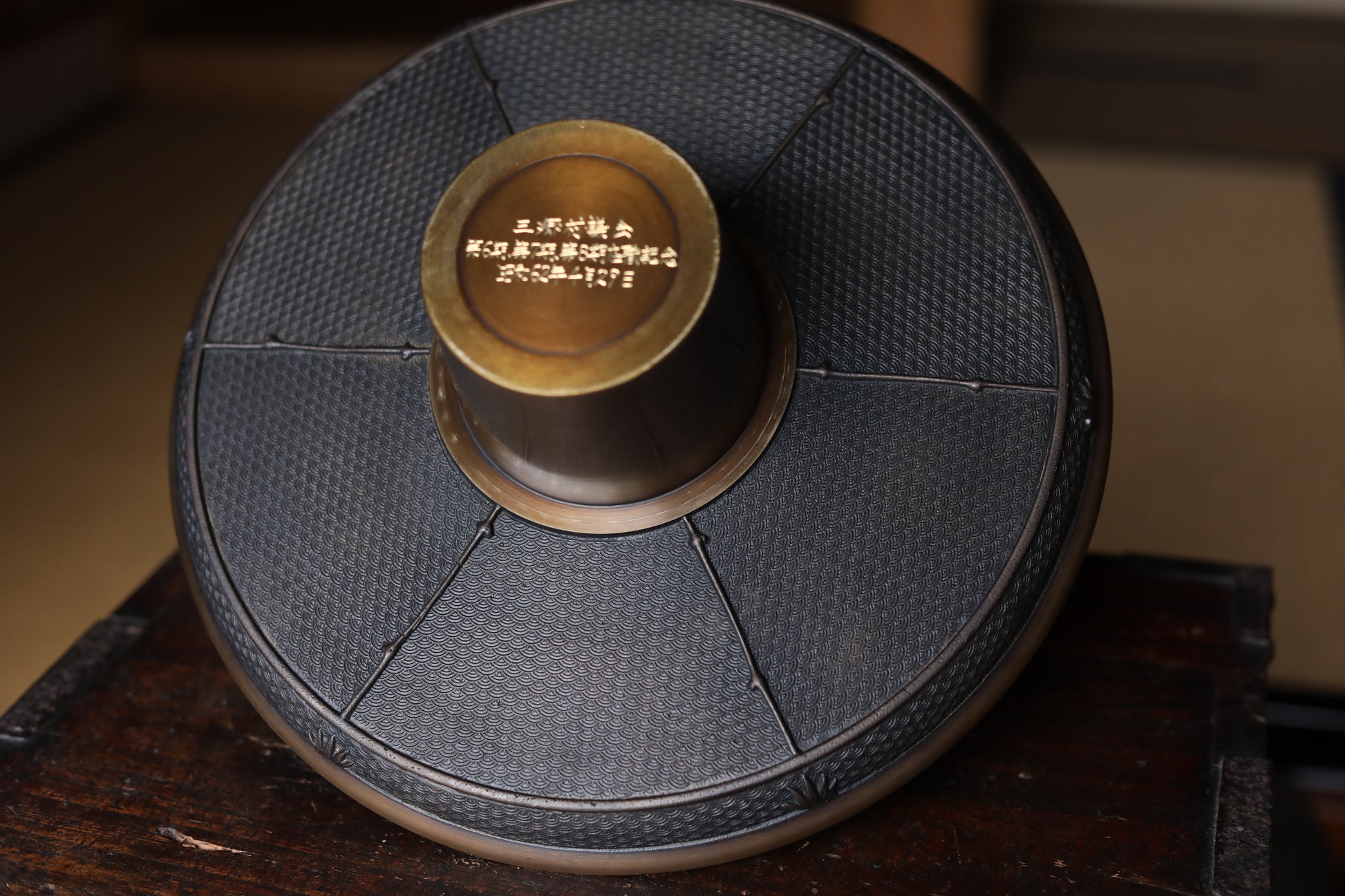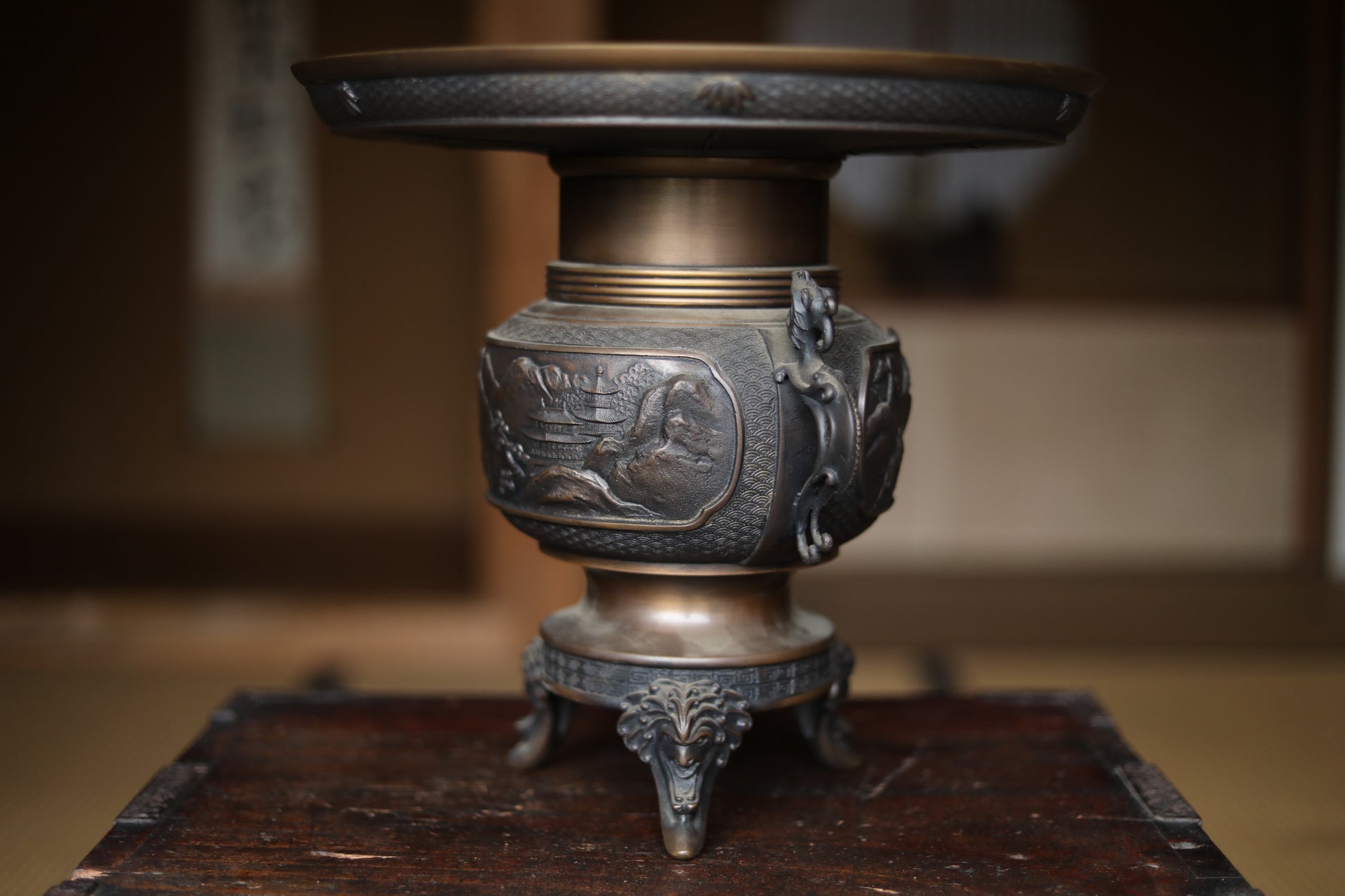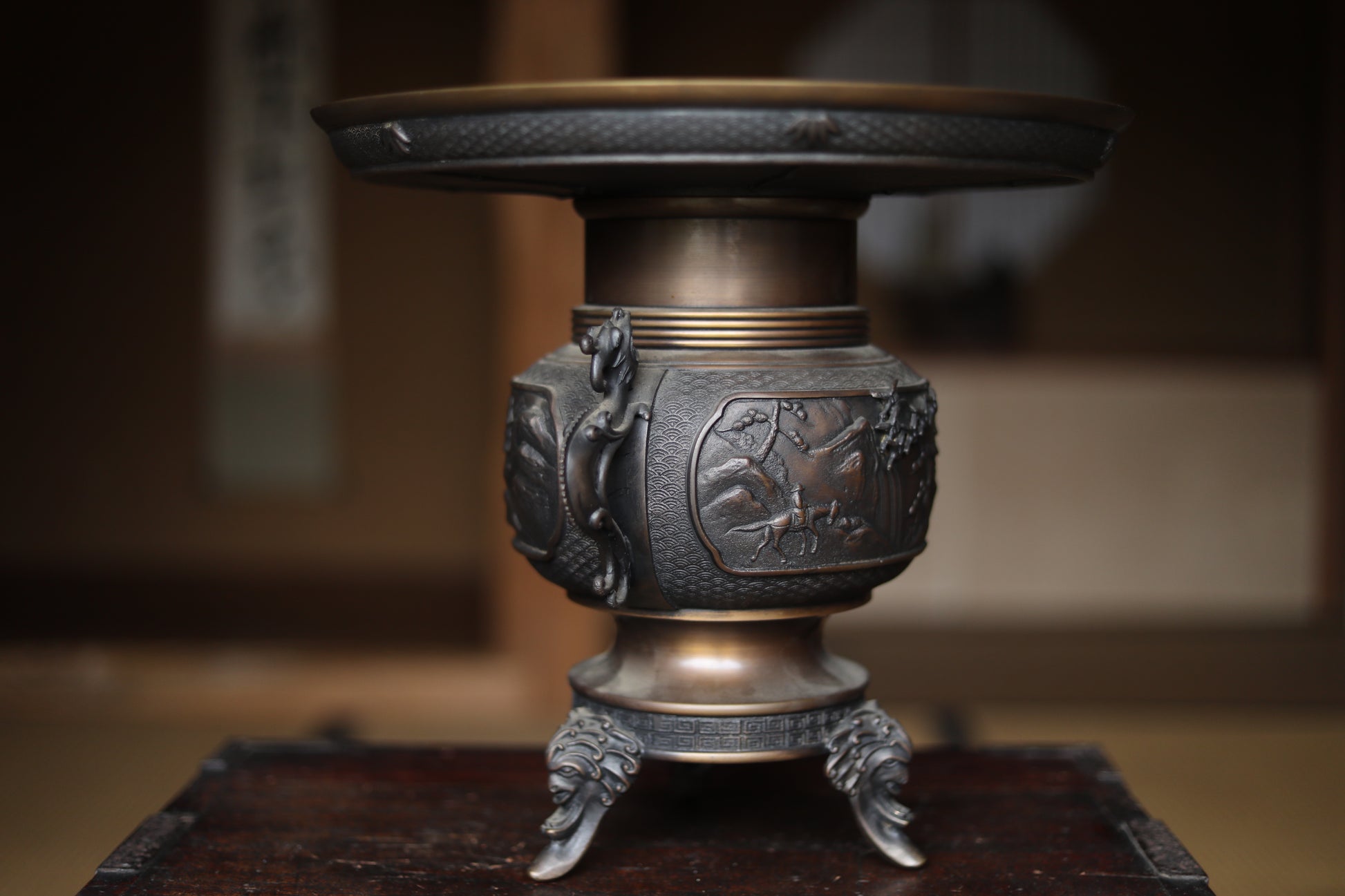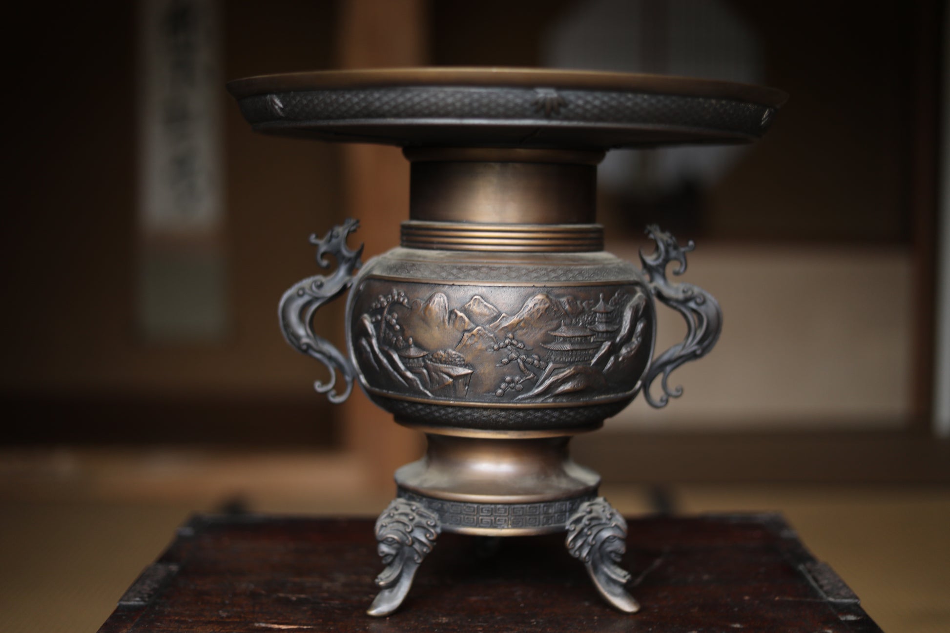 It is decorated throughout with very delicate and intricate reliefs. The plate-like part at the top is especially wonderful, with lavish relief on the back side. Both ears are decorated with dragon motifs, birds flying in the mountains in the center, and even a person riding a horse can be seen if you look closely.