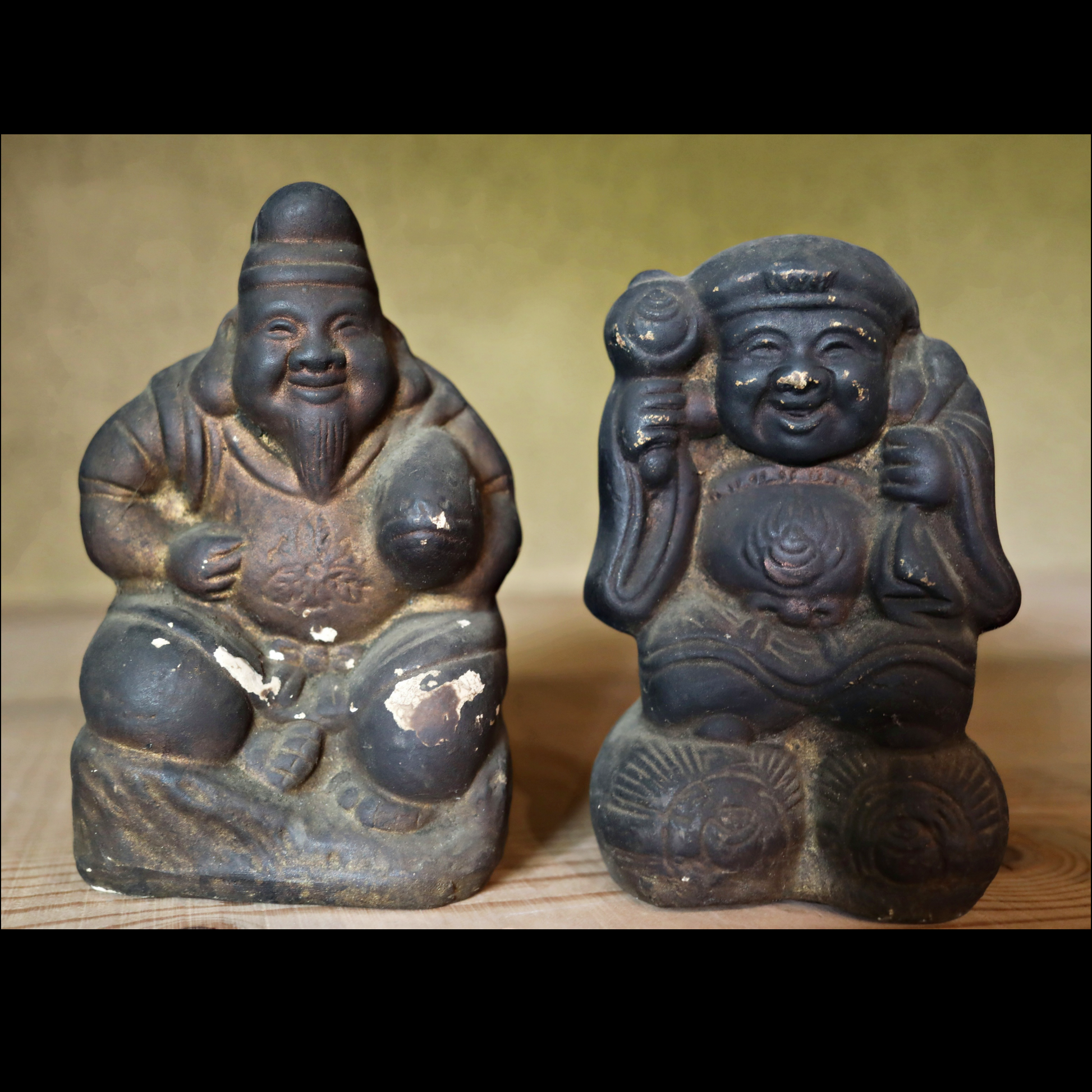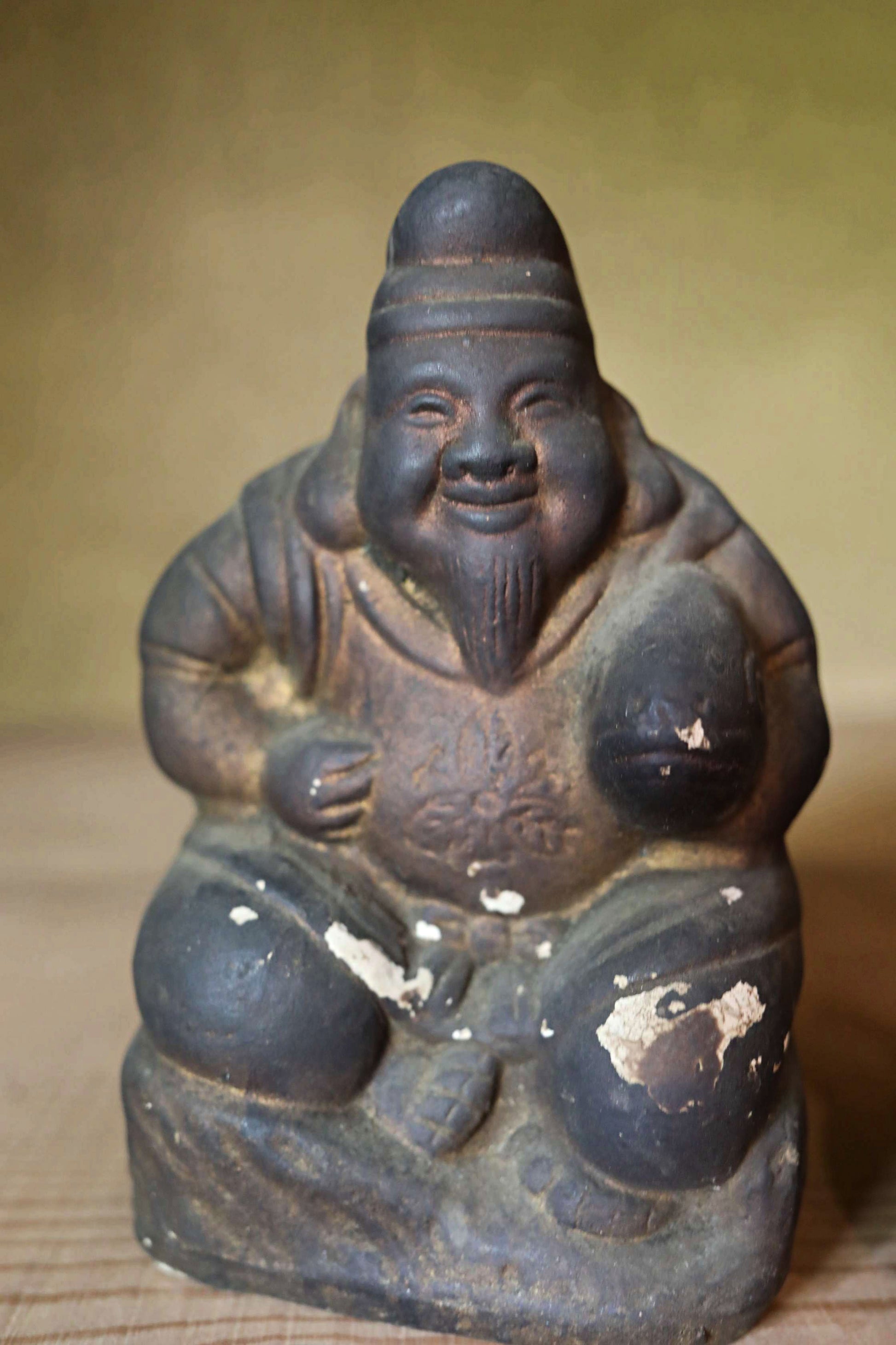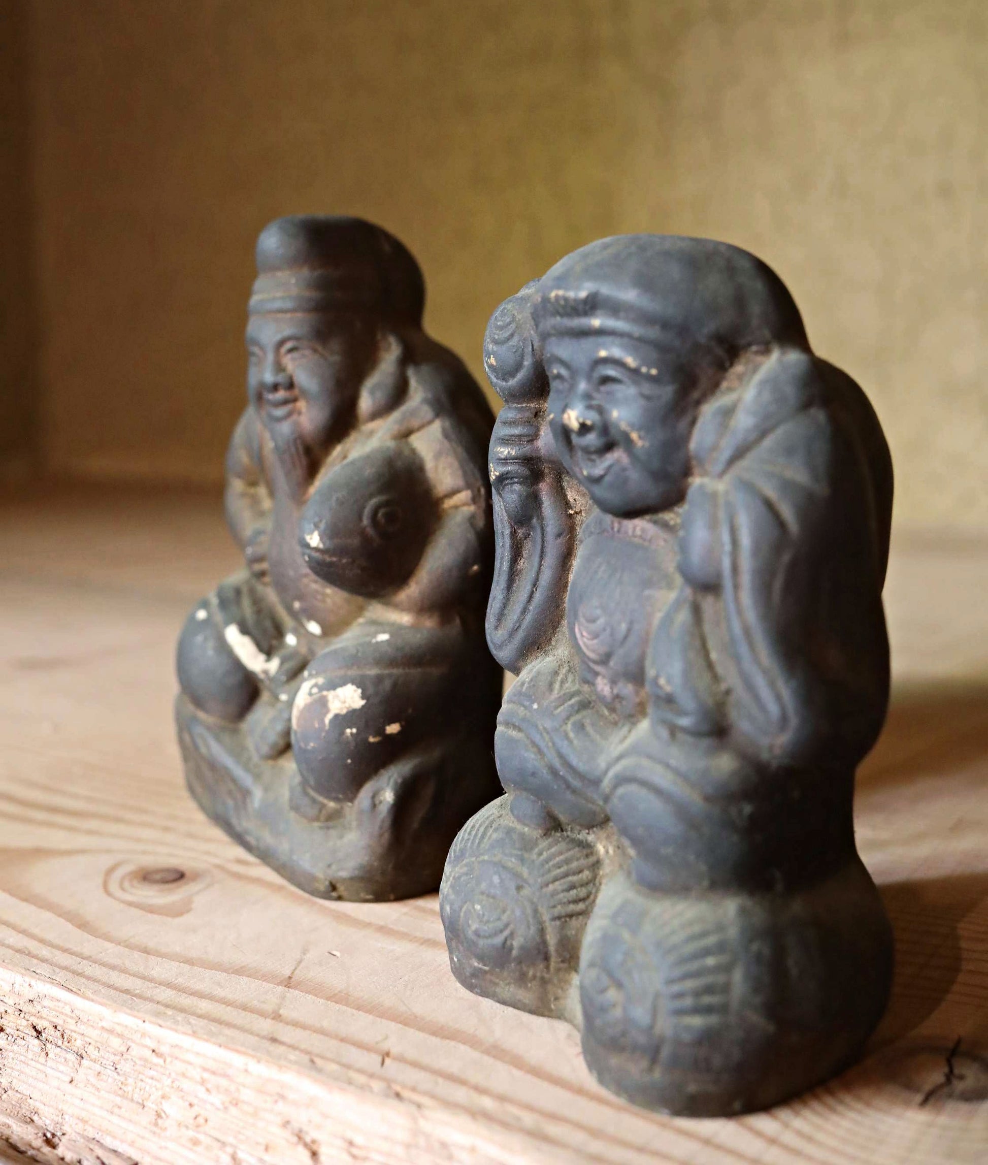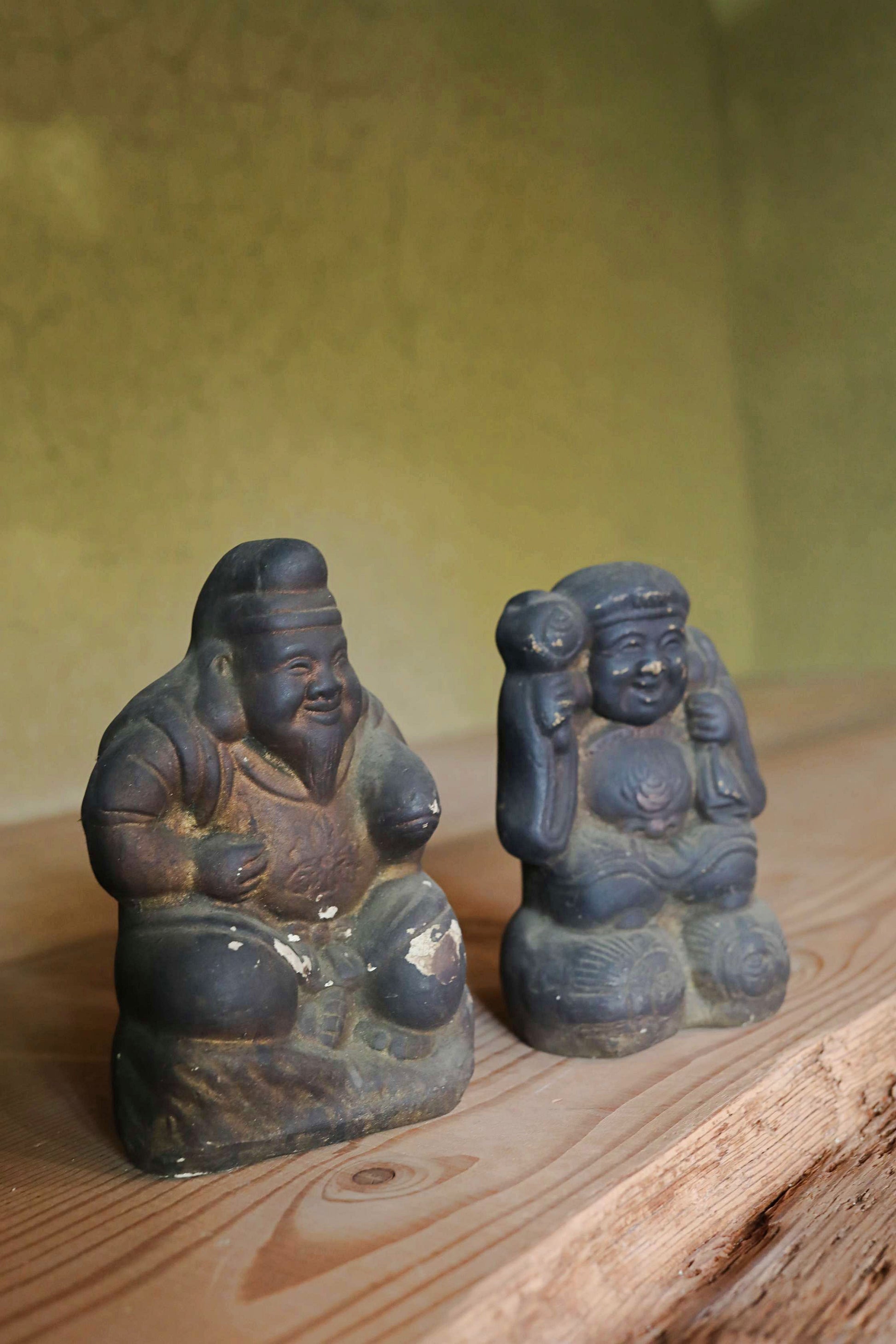 In Japan, there's a long-standing custom of enshrining Ebisu and Daikoku as guardian deities in shops and homes. These two gods, believed to bring abundant catches of fish—a staple in the Japanese diet—and bountiful rice harvests, were often placed above the irori, a traditional Japanese hearth where charcoal was constantly burned. This was essentially the heart of the Japanese kitchen and where families gathered to eat. As a result, the unglazed ceramic figures, worshipped for many years, would become covered in soot and turn black. These two deities were likely originally painted on their unglazed ceramic surfaces. However, the layers of paint are now covered in soot, with some areas flaking off. Despite this, their gently smiling expressions remain incredibly soft and serene.