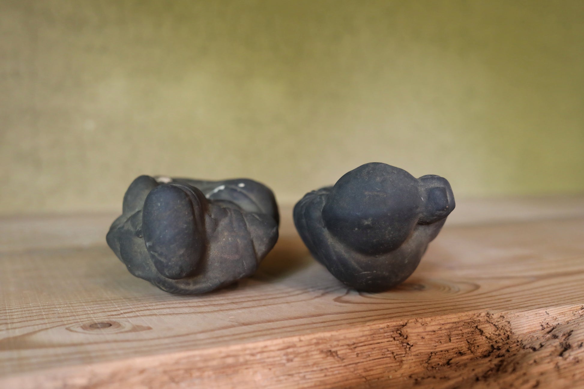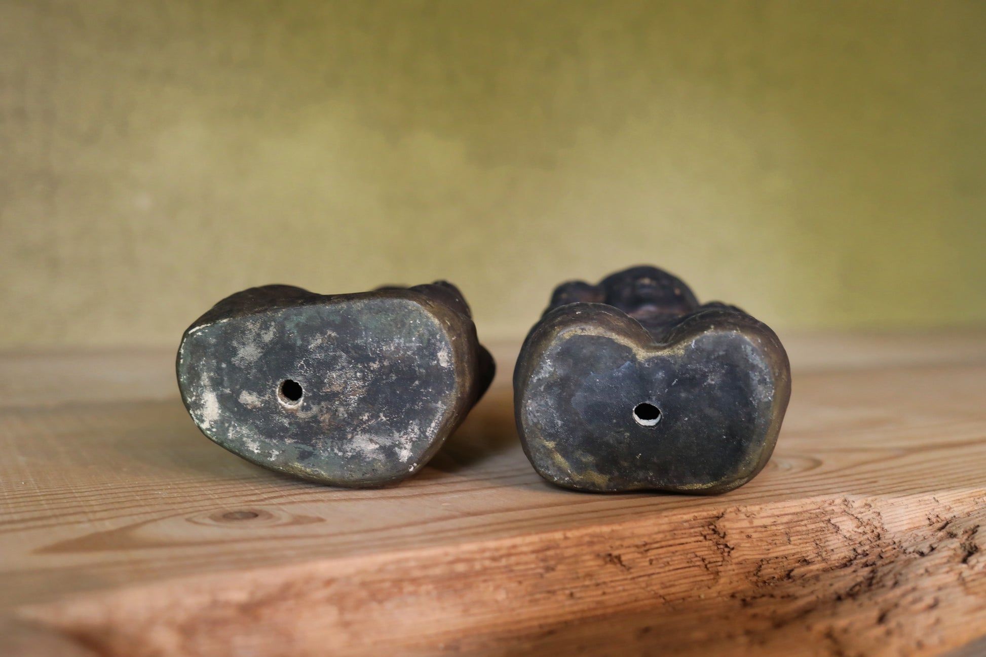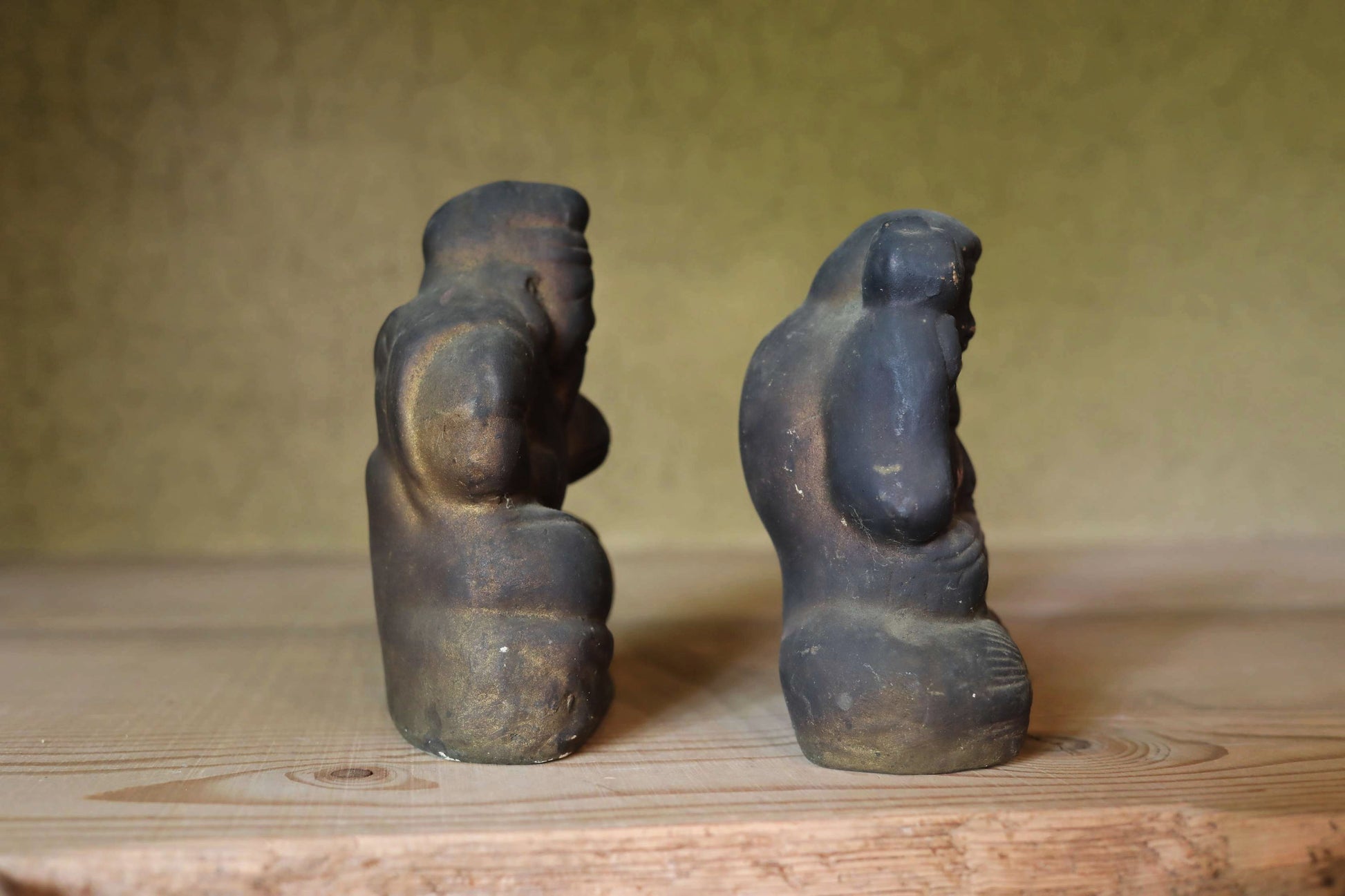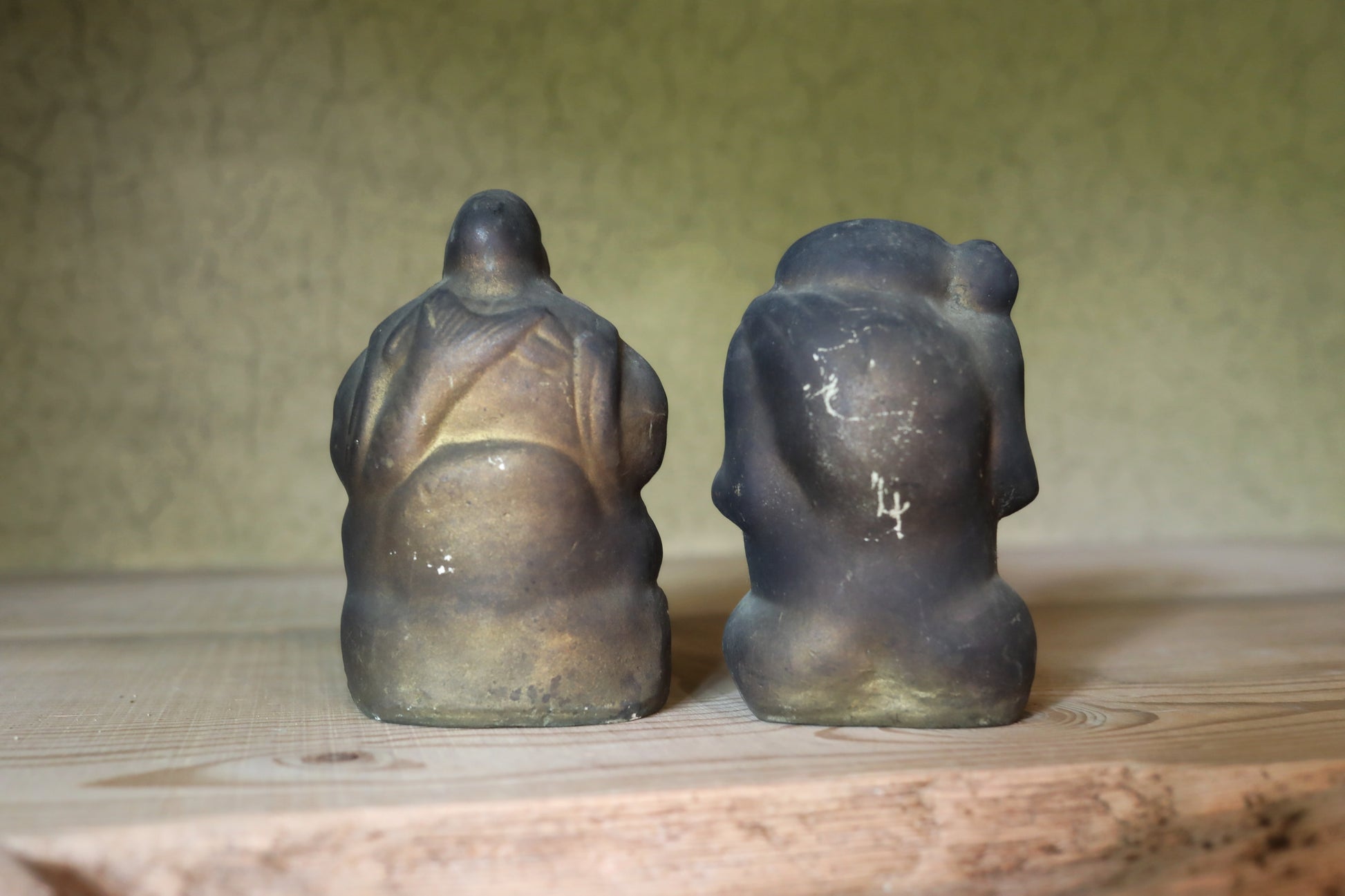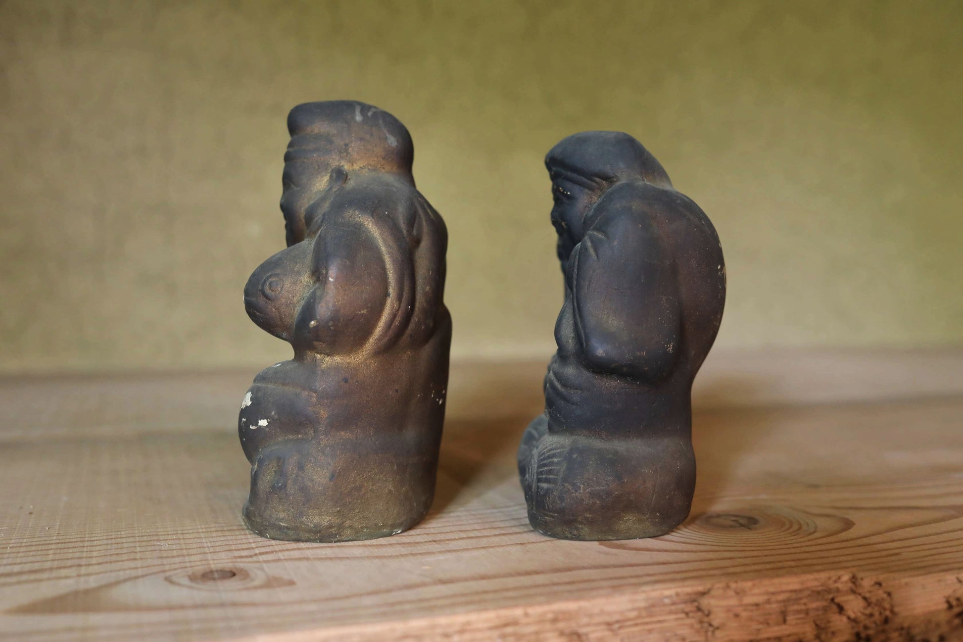 In Japan, there's a long-standing custom of enshrining Ebisu and Daikoku as guardian deities in shops and homes. These two gods, believed to bring abundant catches of fish—a staple in the Japanese diet—and bountiful rice harvests, were often placed above the irori, a traditional Japanese hearth where charcoal was constantly burned. This was essentially the heart of the Japanese kitchen and where families gathered to eat. As a result, the unglazed ceramic figures, worshipped for many years, would become covered in soot and turn black. These two deities were likely originally painted on their unglazed ceramic surfaces. However, the layers of paint are now covered in soot, with some areas flaking off. Despite this, their gently smiling expressions remain incredibly soft and serene.