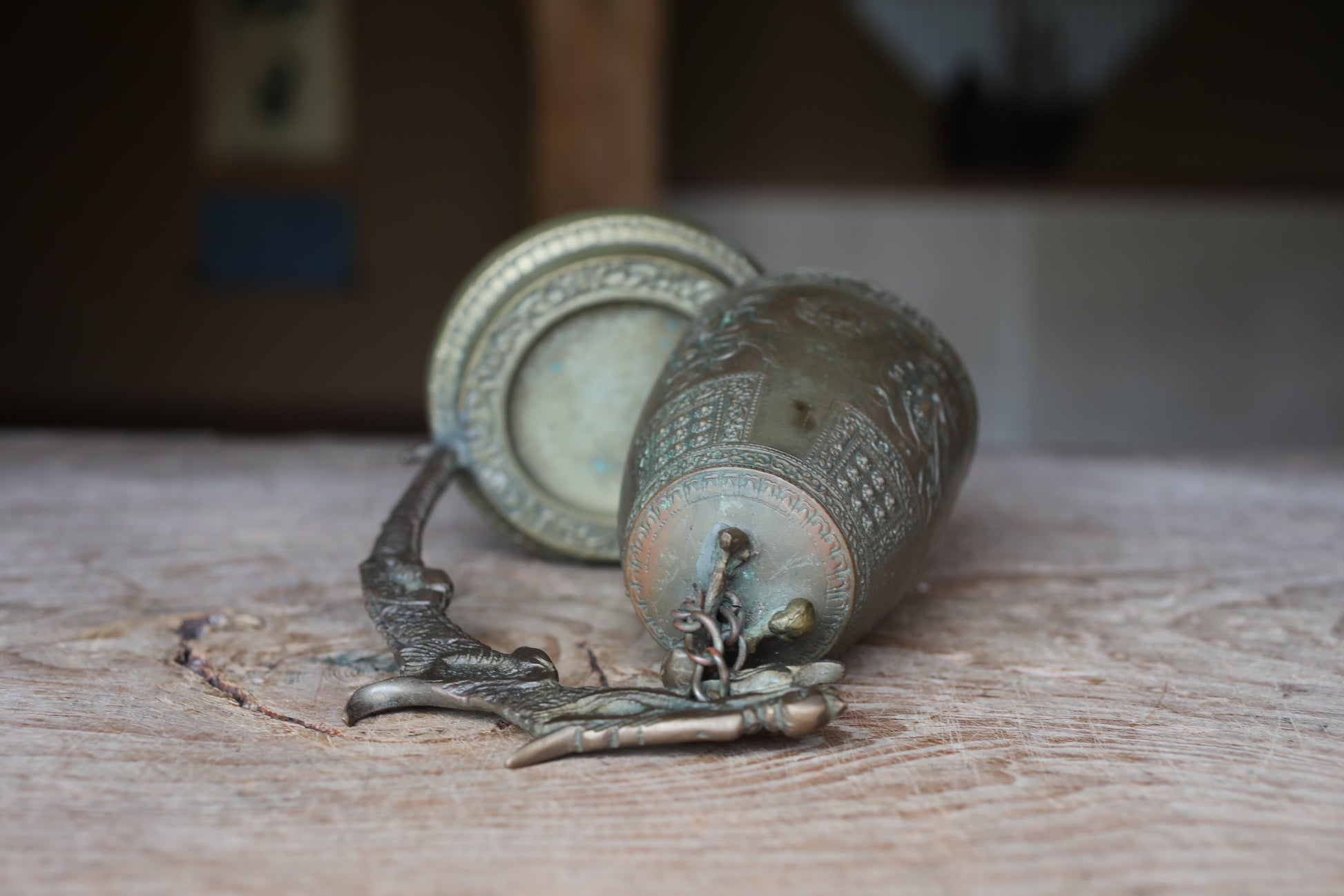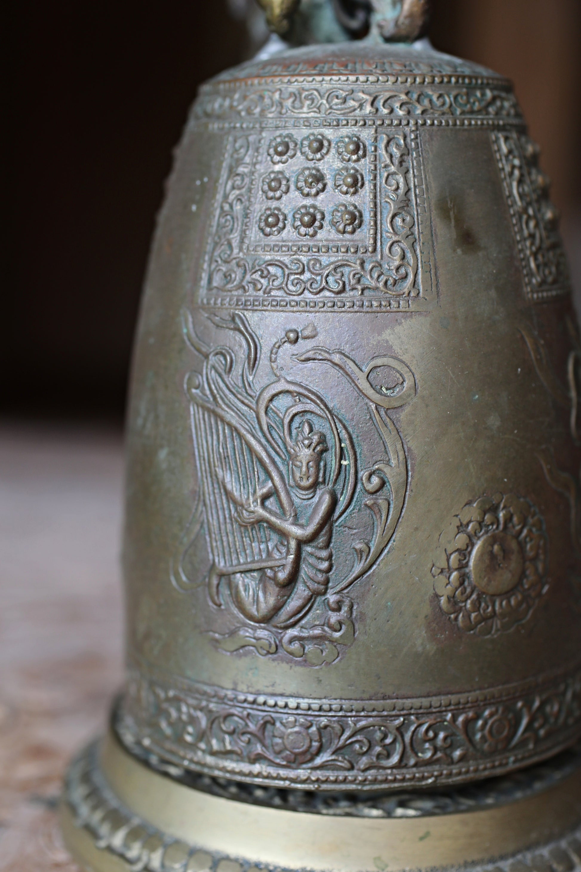 Japanese vintage bronze gong Bell Buddhist instrument stand striker set, with dragon Buddhas heavenly maiden temple alter H7.7in/H19.5cm