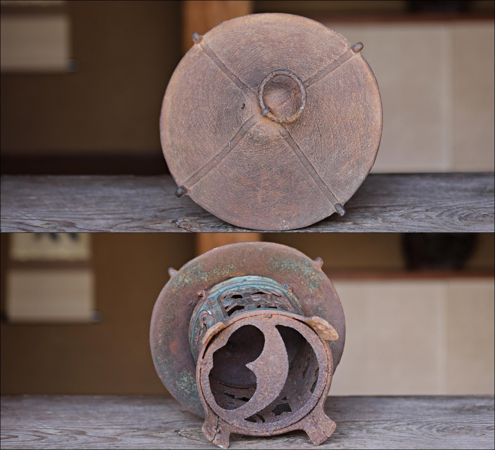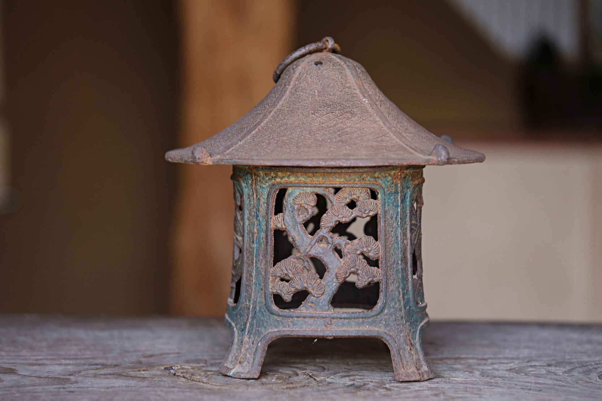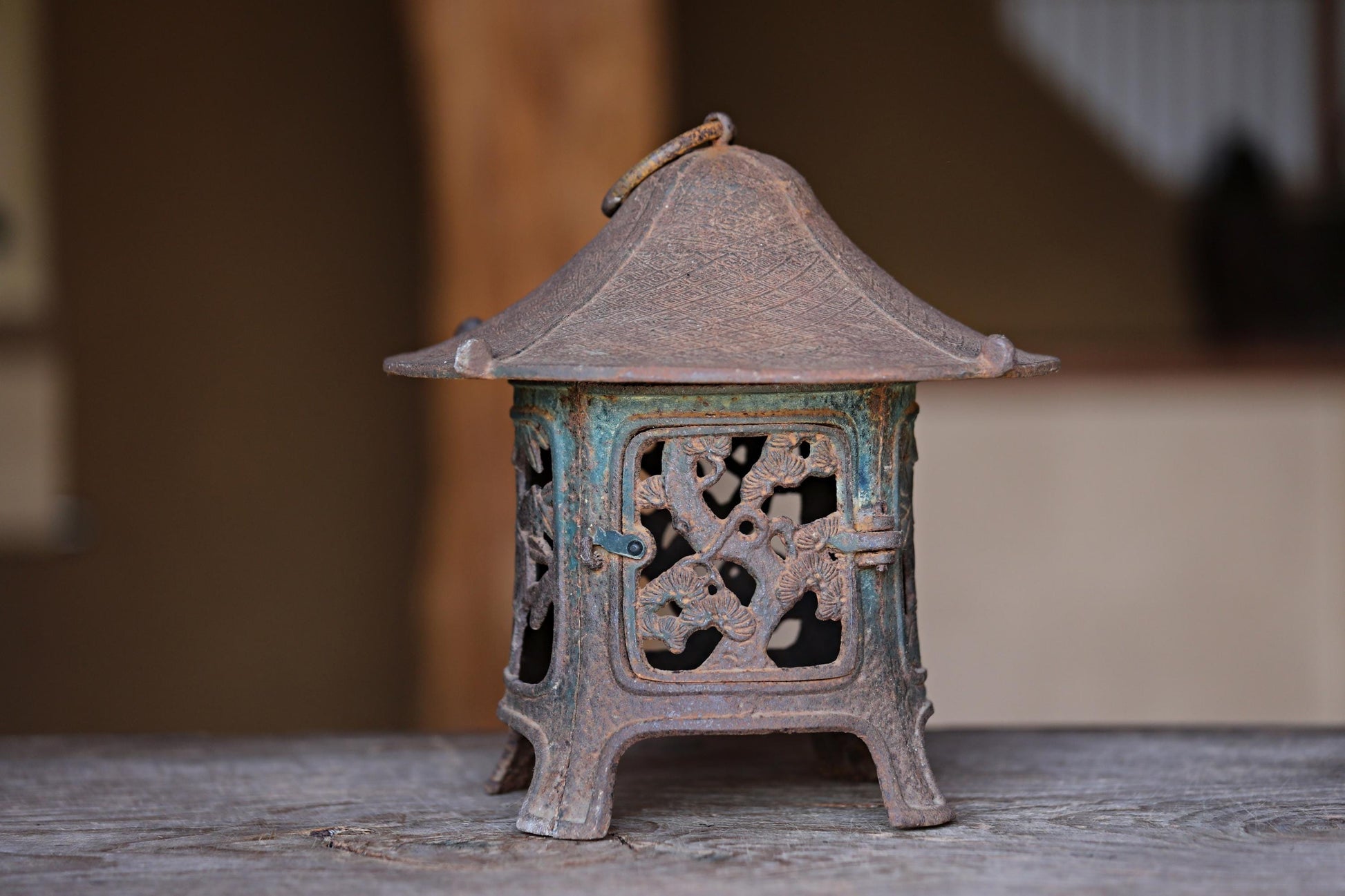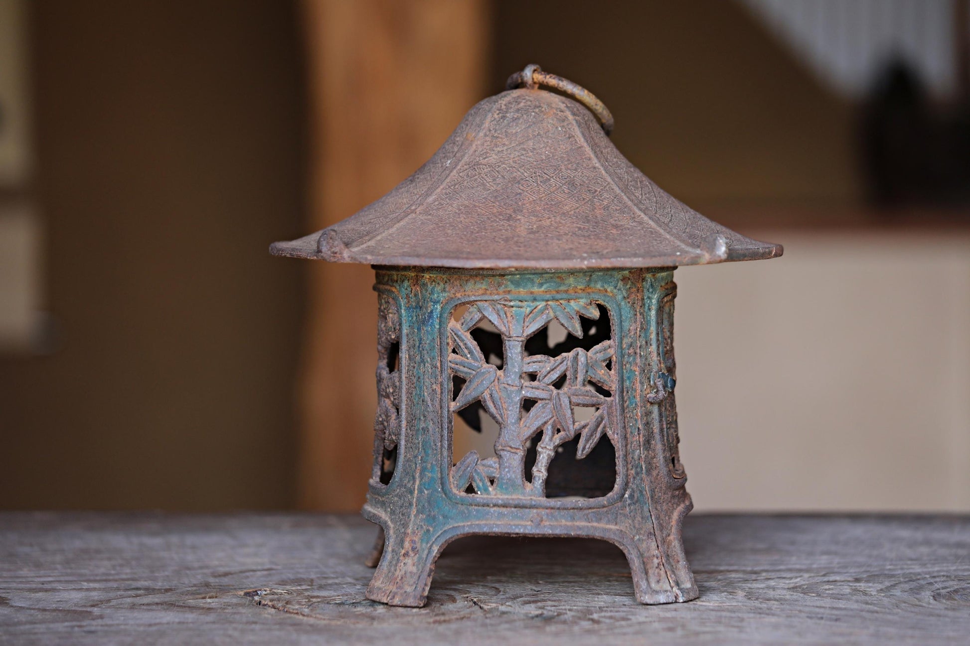 This is a rusty iron lantern. This is called a 灯籠 TOURO lantern.